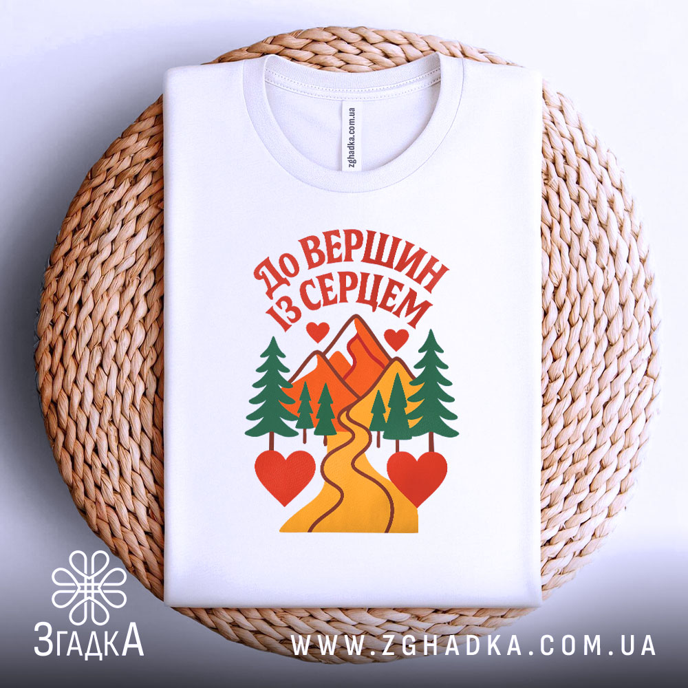 Футболка «До вершин із серцем» — це натхненний дизайн для тих, хто живе мріями й не боїться підніматися до своїх вершин. Гірський пейзаж із дорогою, соснами та червоними серцями символізує шлях, пройдений із любов’ю та силою духу. Ця футболка стане вашим талісманом і щоденним нагадуванням: серце веде туди, де справжня мета.