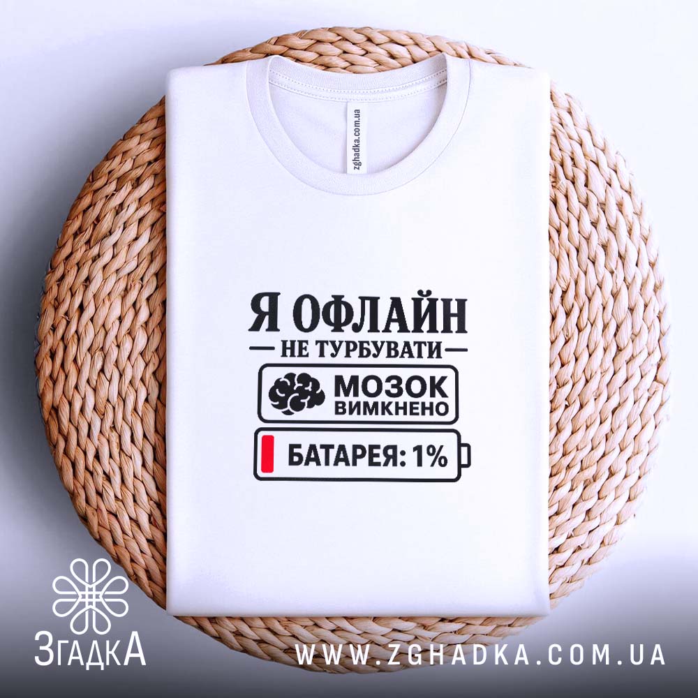 Яскравий принт, що говорить сам за себе. Текст у стилі мінімалізму з елементами графіки. Напис ‘Я ОФЛАЙН НЕ ТУРБУВАТИ’ виділяється на фоні, доповнений іконками мозку та батареї. Сильний меседж, що підкреслює ваш настрій.