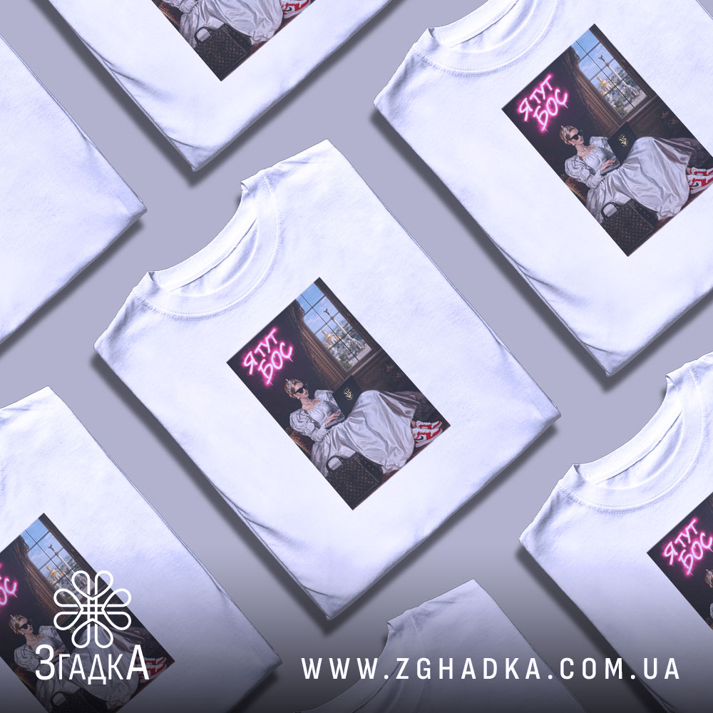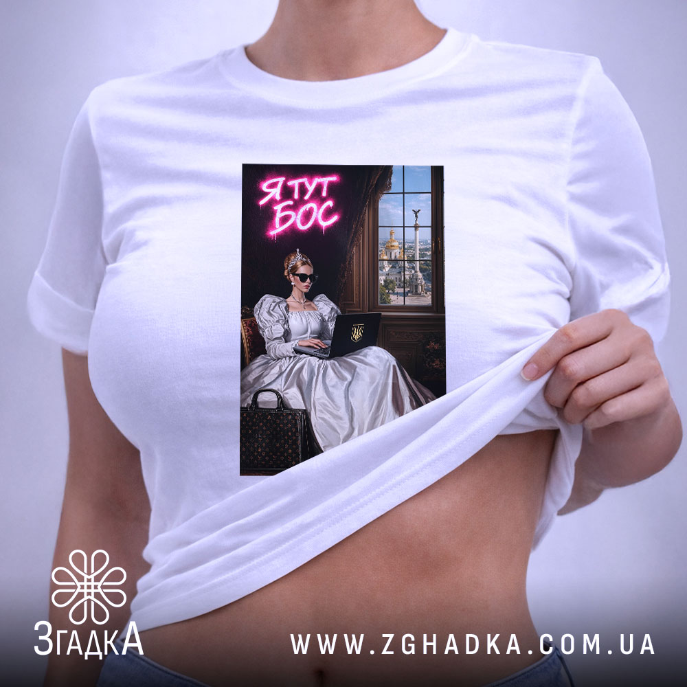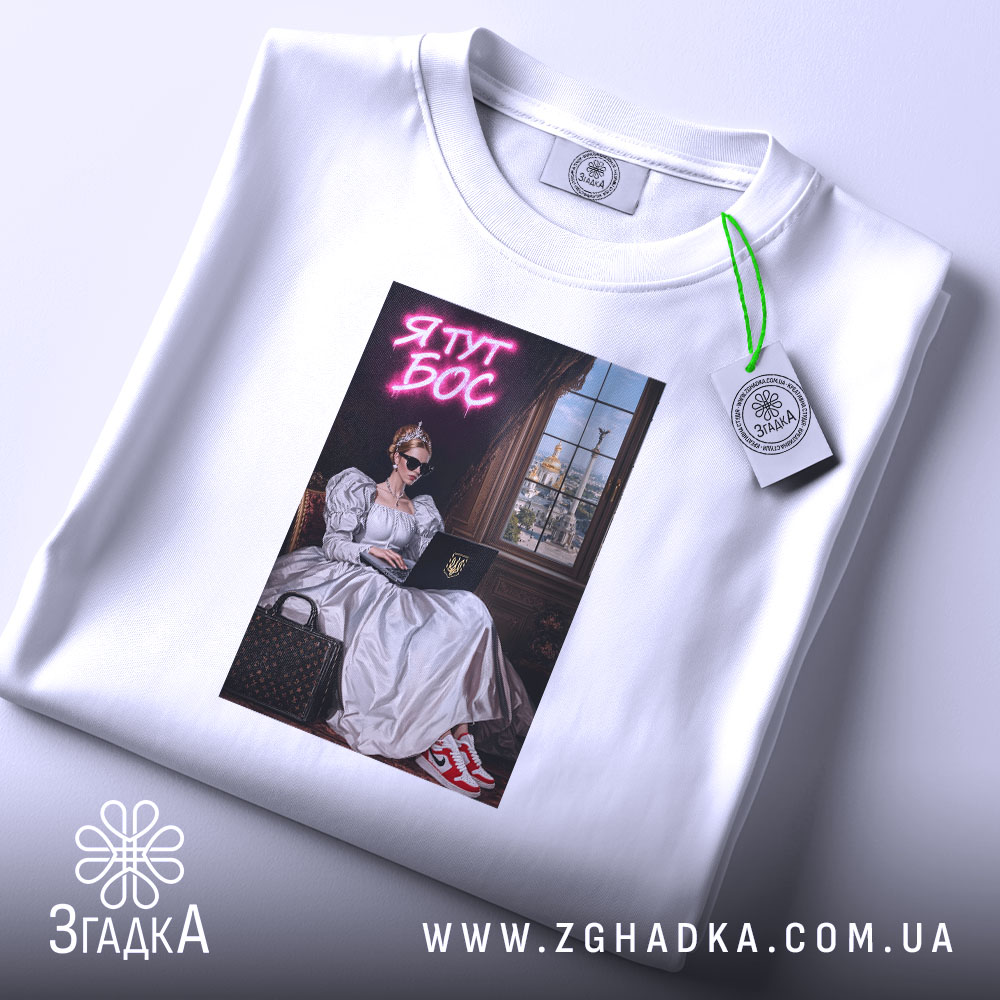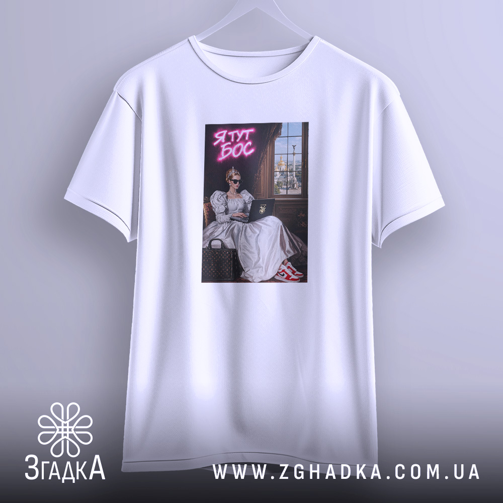 Вражаючий принт, що поєднує класичний стиль з сучасними елементами. На ньому зображена жінка в елегантній сукні, що сидить за комп’ютером, з сонцезахисними окулярами. Яскравий текст ‘Я ТУТ БОС’ в неоновому стилі додає енергії та впевненості.