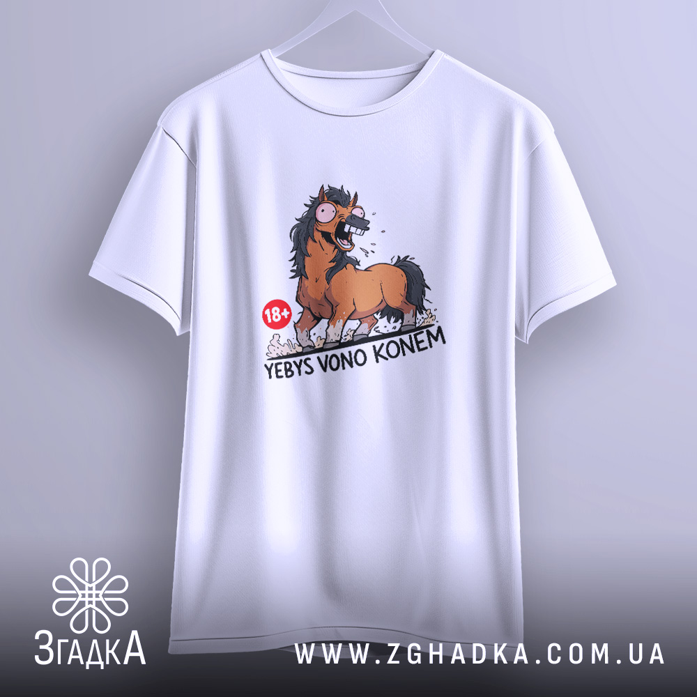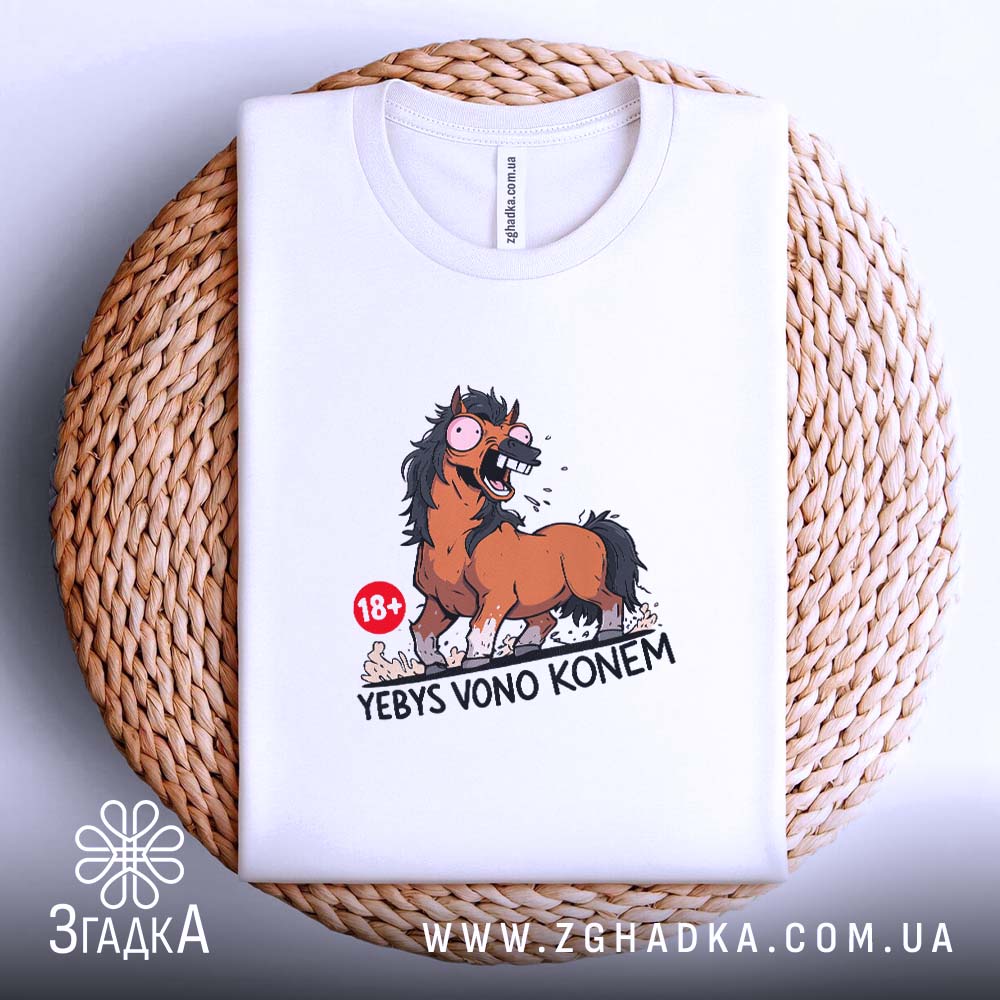 Дивовижний принт, що зображує емоційного коня з великими очима та відкритим ротом. Яскраві кольори, що підкреслюють динаміку, з елементами комічності. Напис ‘YEBYS VONO KONEM’ виконаний у сміливому шрифті, що додає характеру.