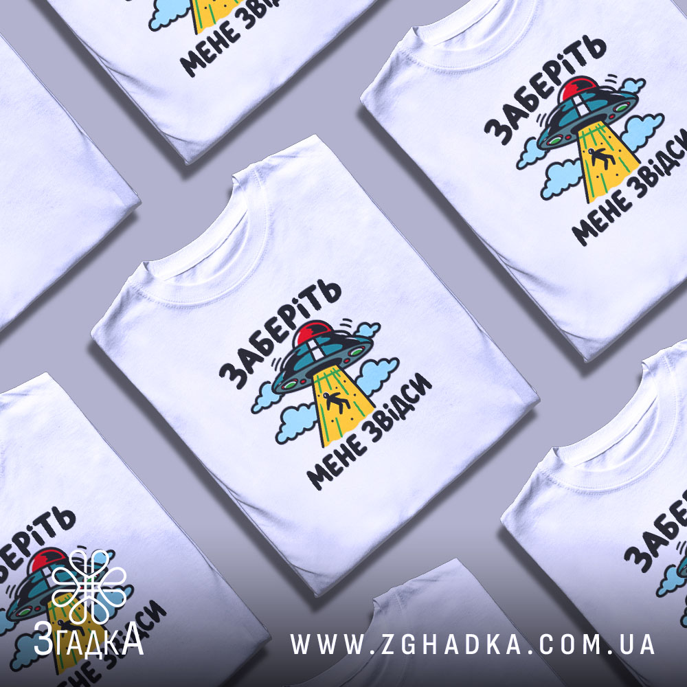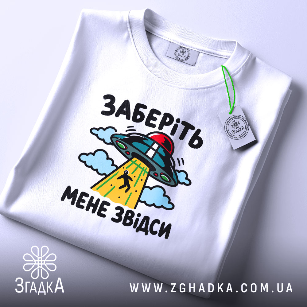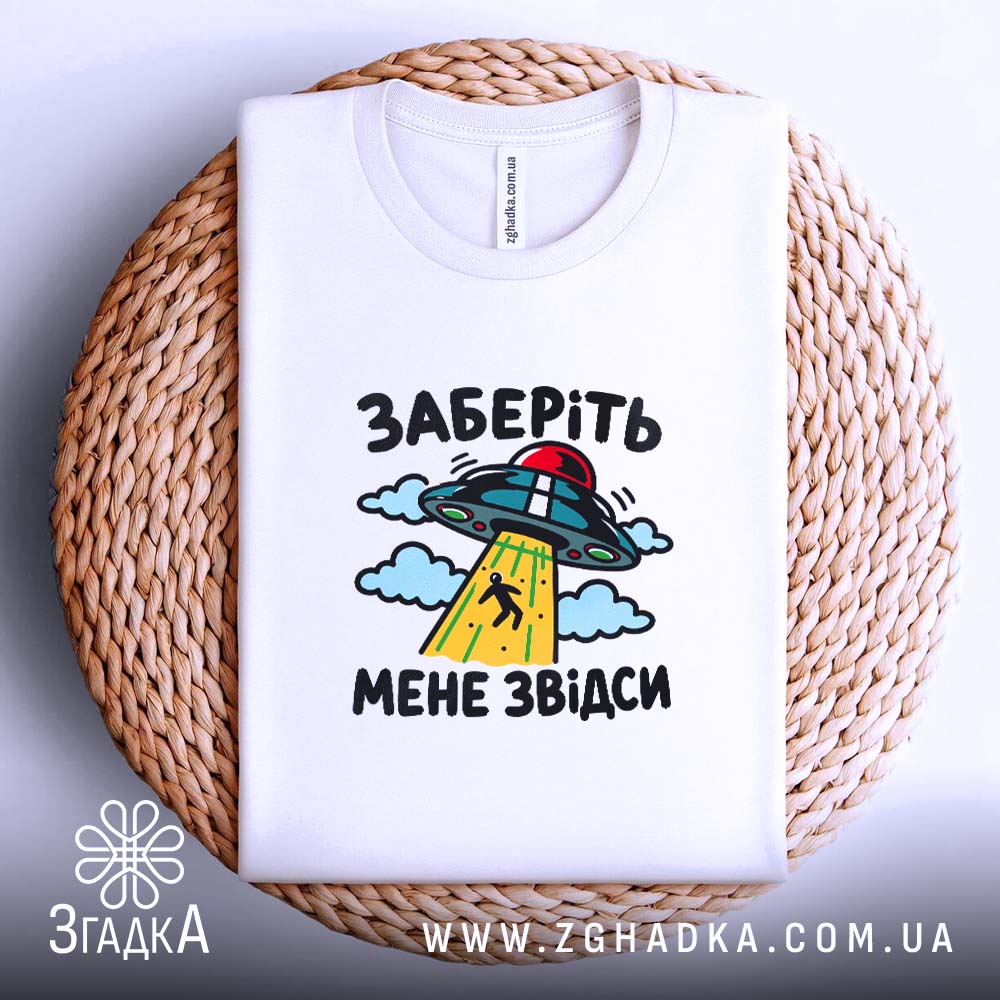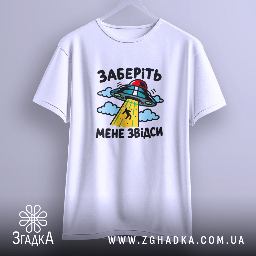 Футболка з принтом ‘Заберіть мене звідси’ – для сміливих та креативних. Яскравий дизайн, комфортний матеріал та широкий вибір кольорів.
