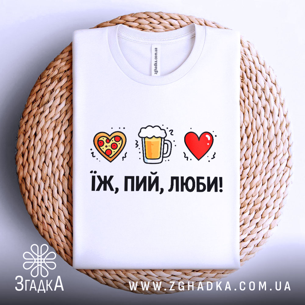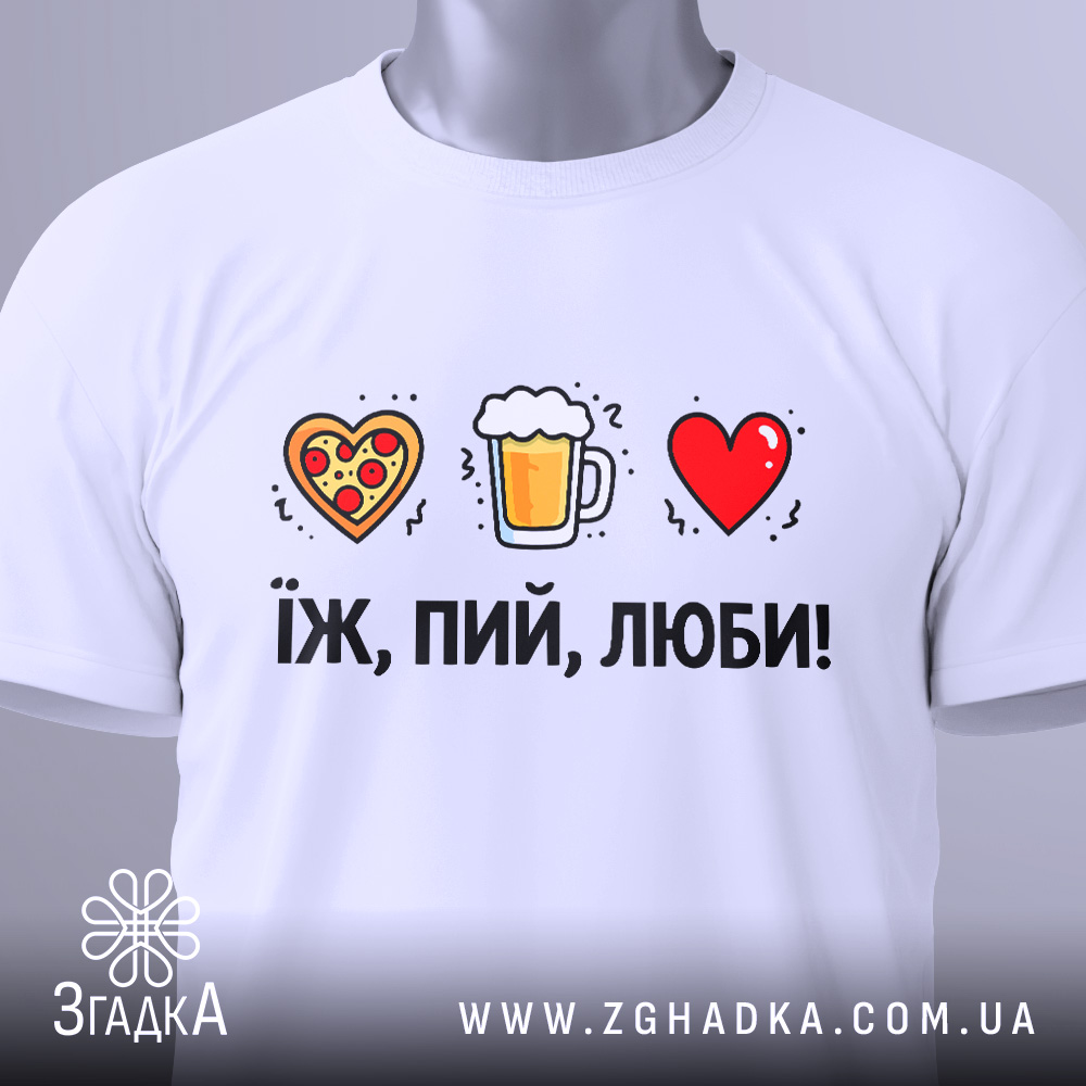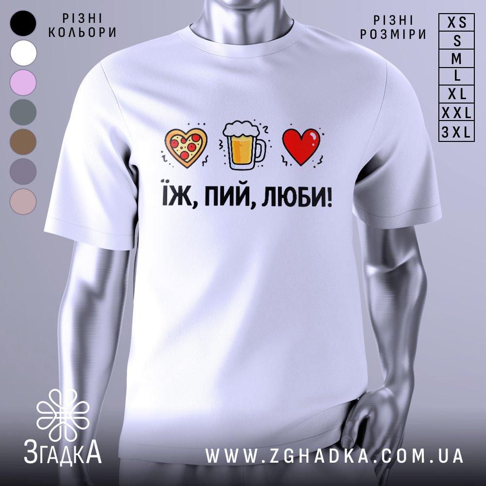 Футболка ‘Їж, пий, люби’ – це стильний та комфортний вибір для кожного. Вона підходить для будь-якої нагоди та стане чудовим подарунком.
