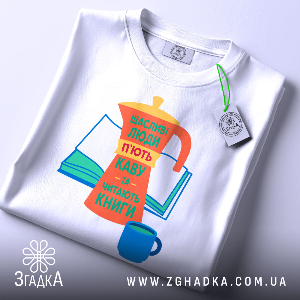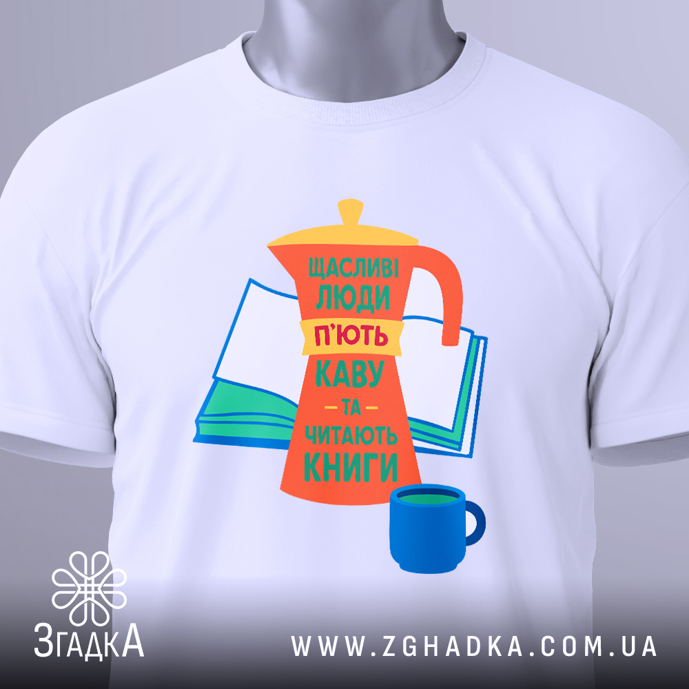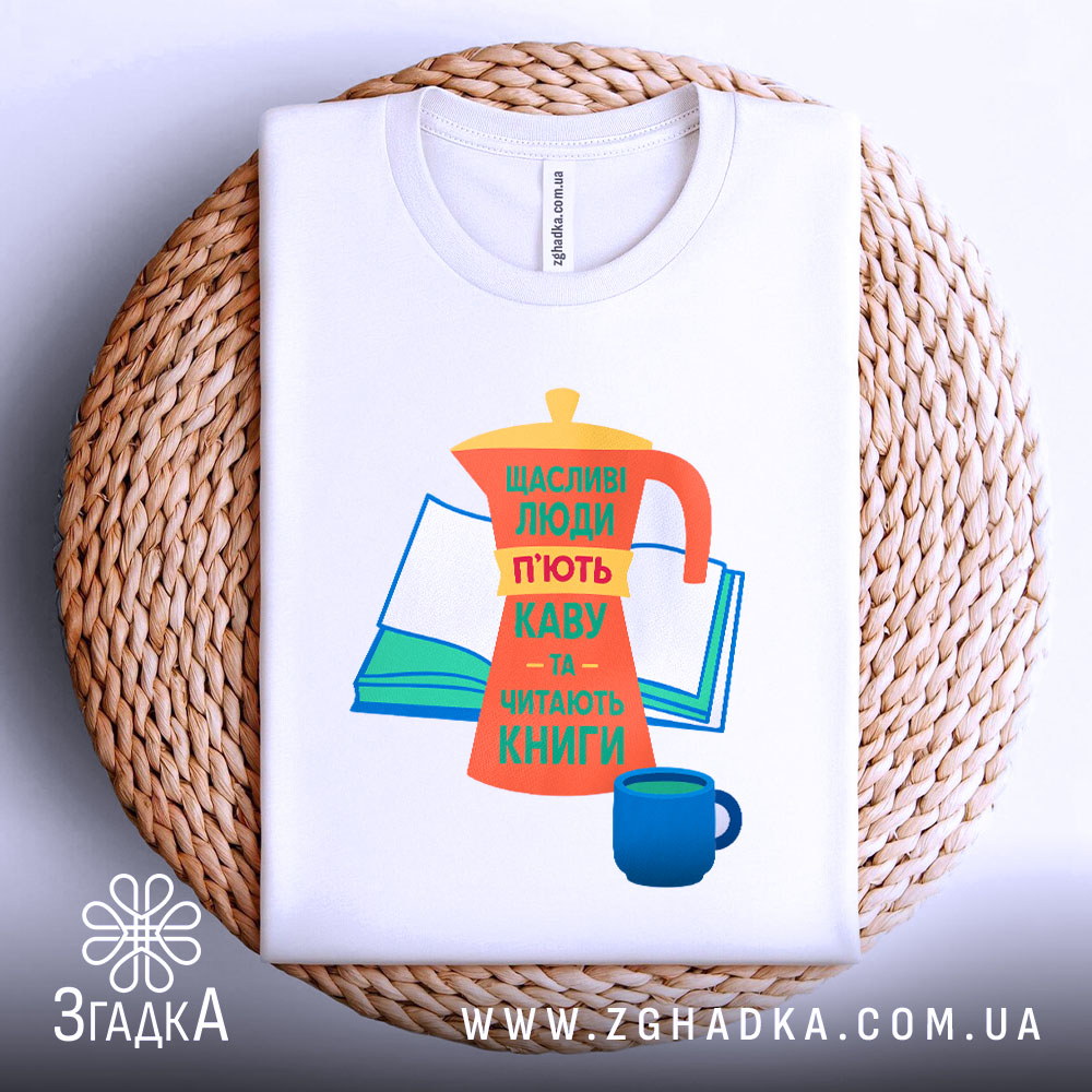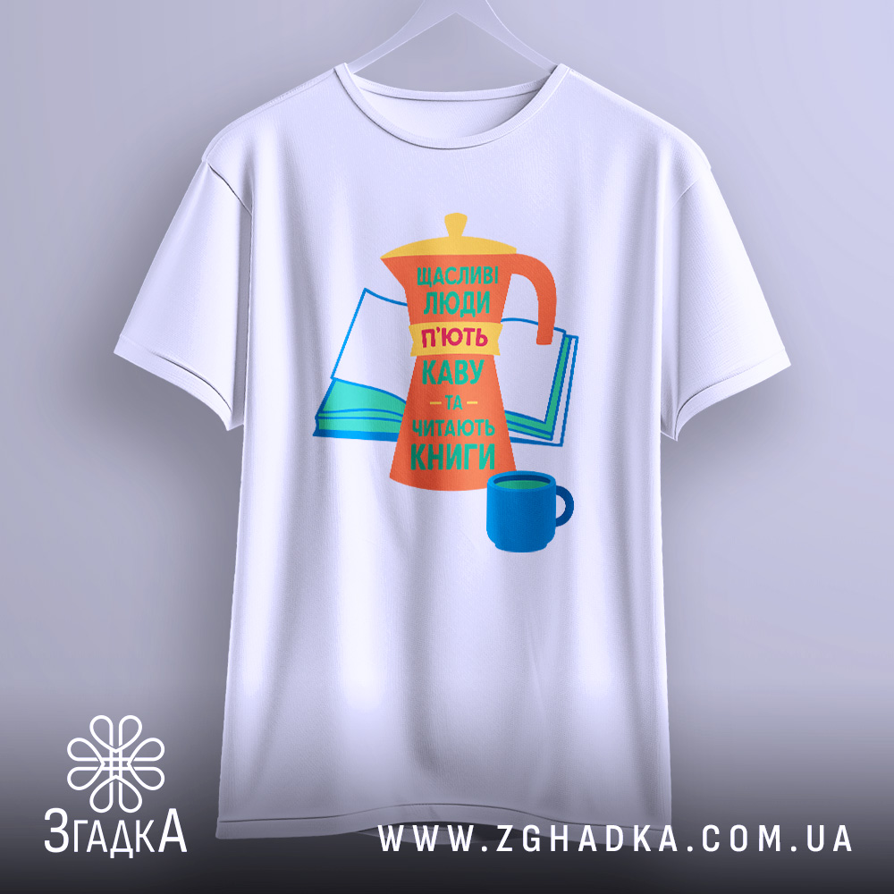 Футболка з принтом ‘кава та книги’ для справжніх книголюбів. Висока якість та комфорт на кожен день.