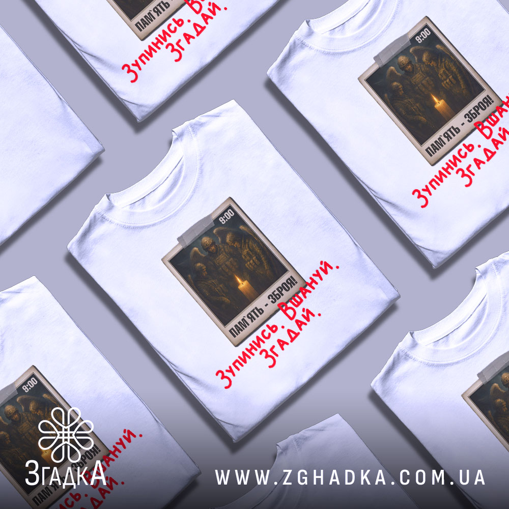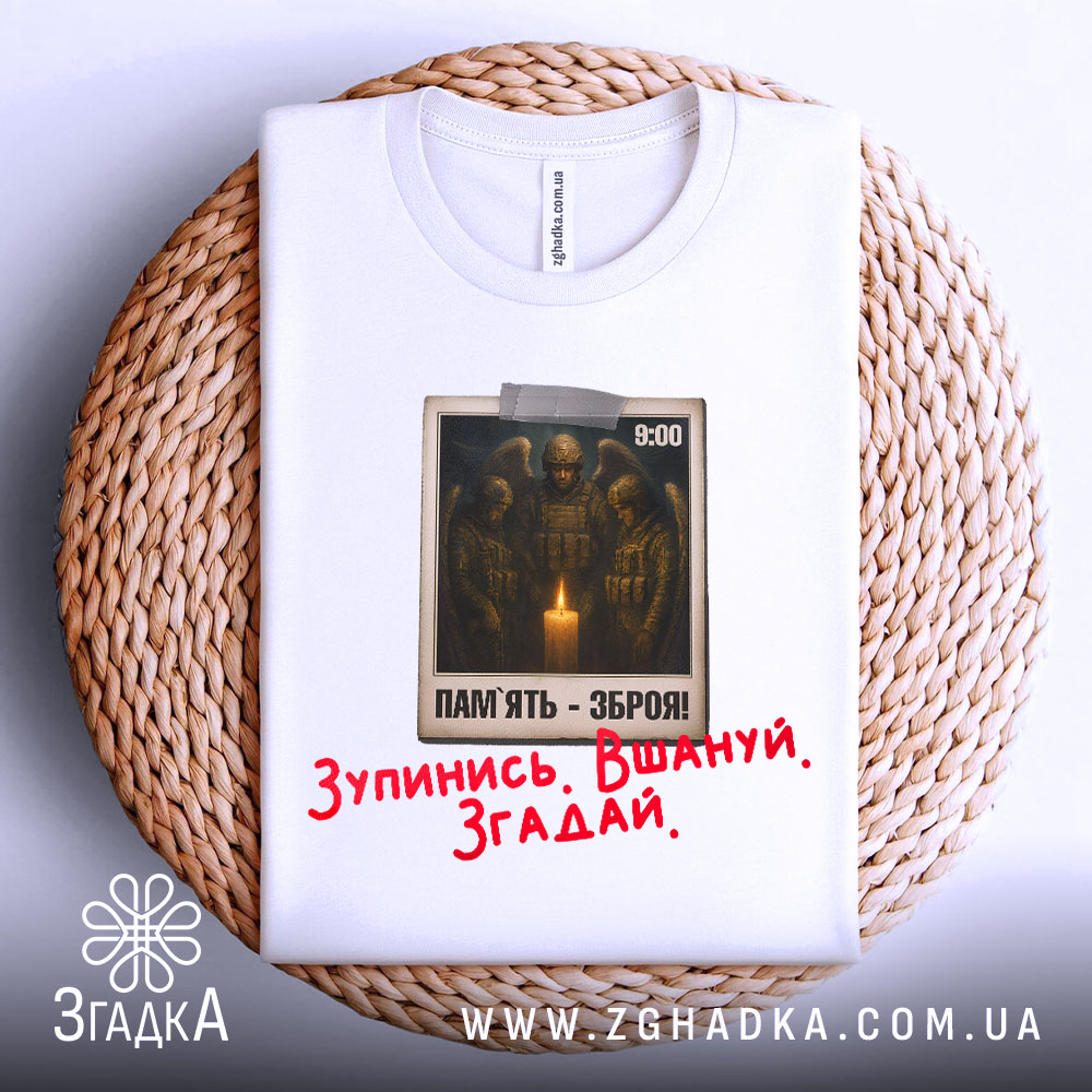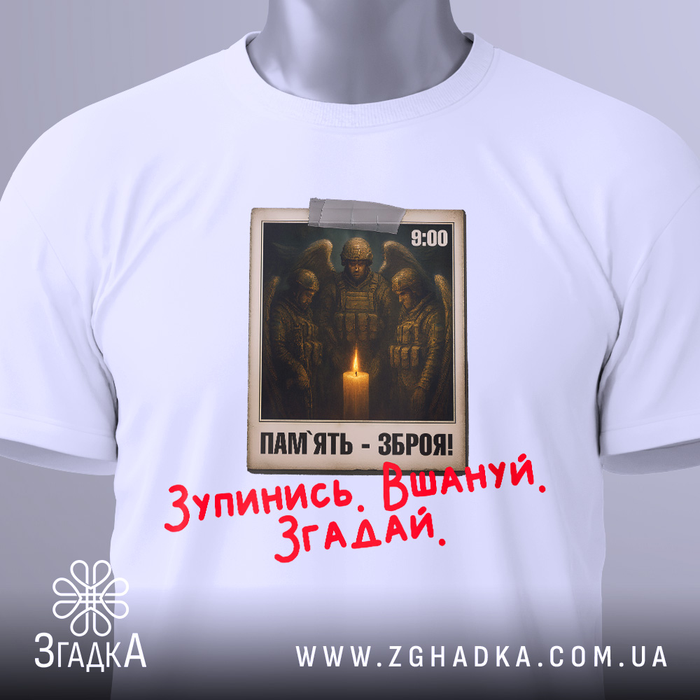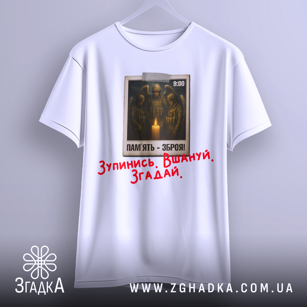 Ця футболка виготовлена з якісних матеріалів і має унікальний принт, що символізує хвилину мовчання. Вона стане чудовим доповненням до вашого гардеробу, підкреслюючи вашу чутливість до важливих моментів у житті.