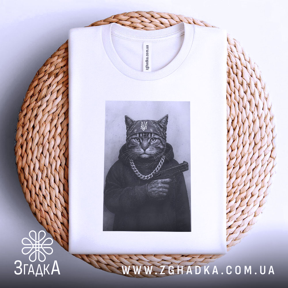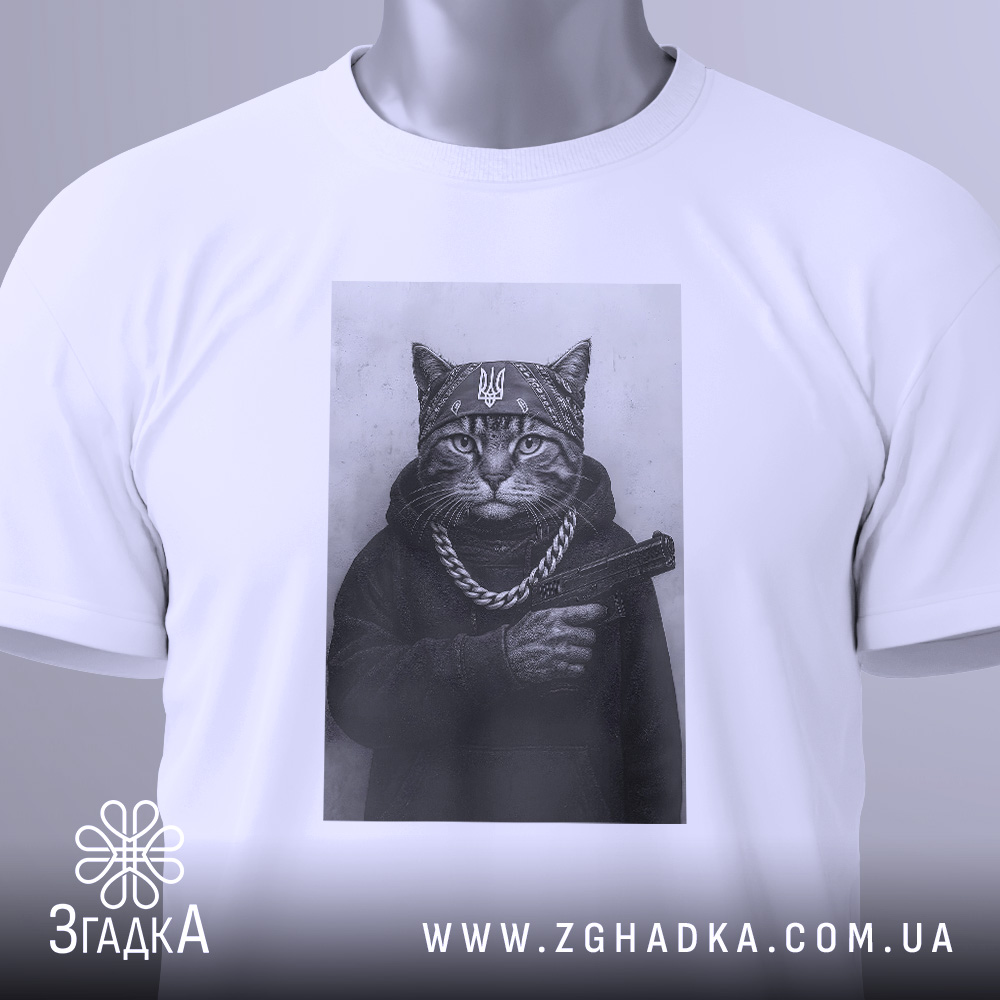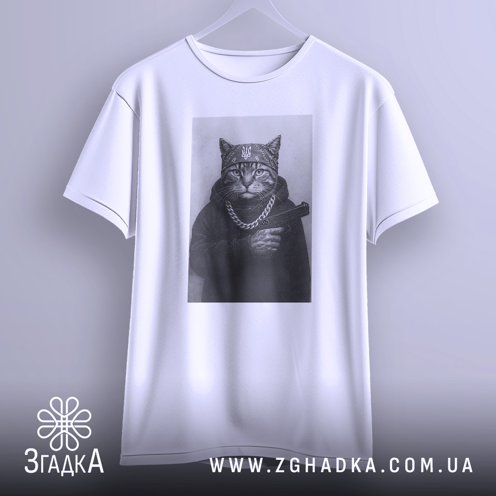Футболка з принтом кота в гангстерському стилі. Ідеальний вибір для любителів оригінального одягу.