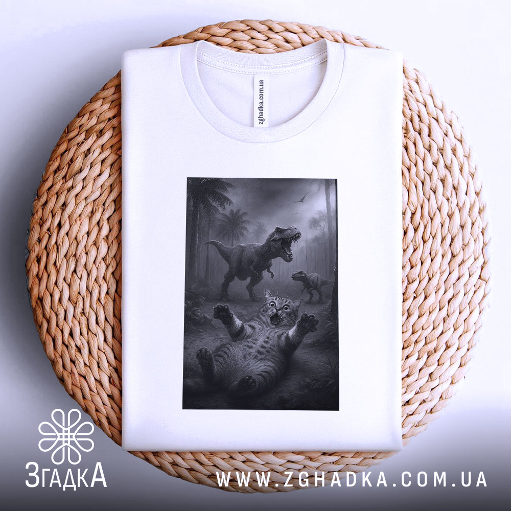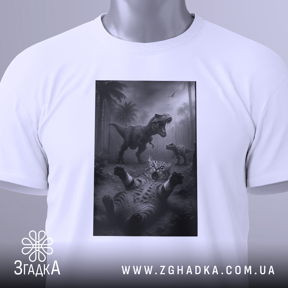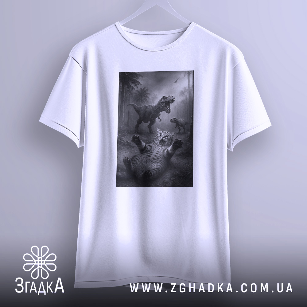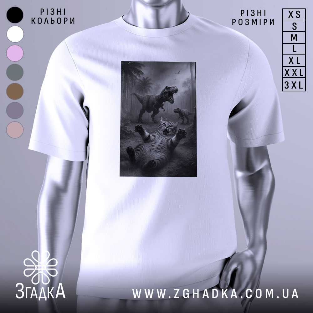 Футболка кіт проти динозавр – це не просто одяг, а вираження вашої індивідуальності. Обирайте стиль і комфорт разом з нами!