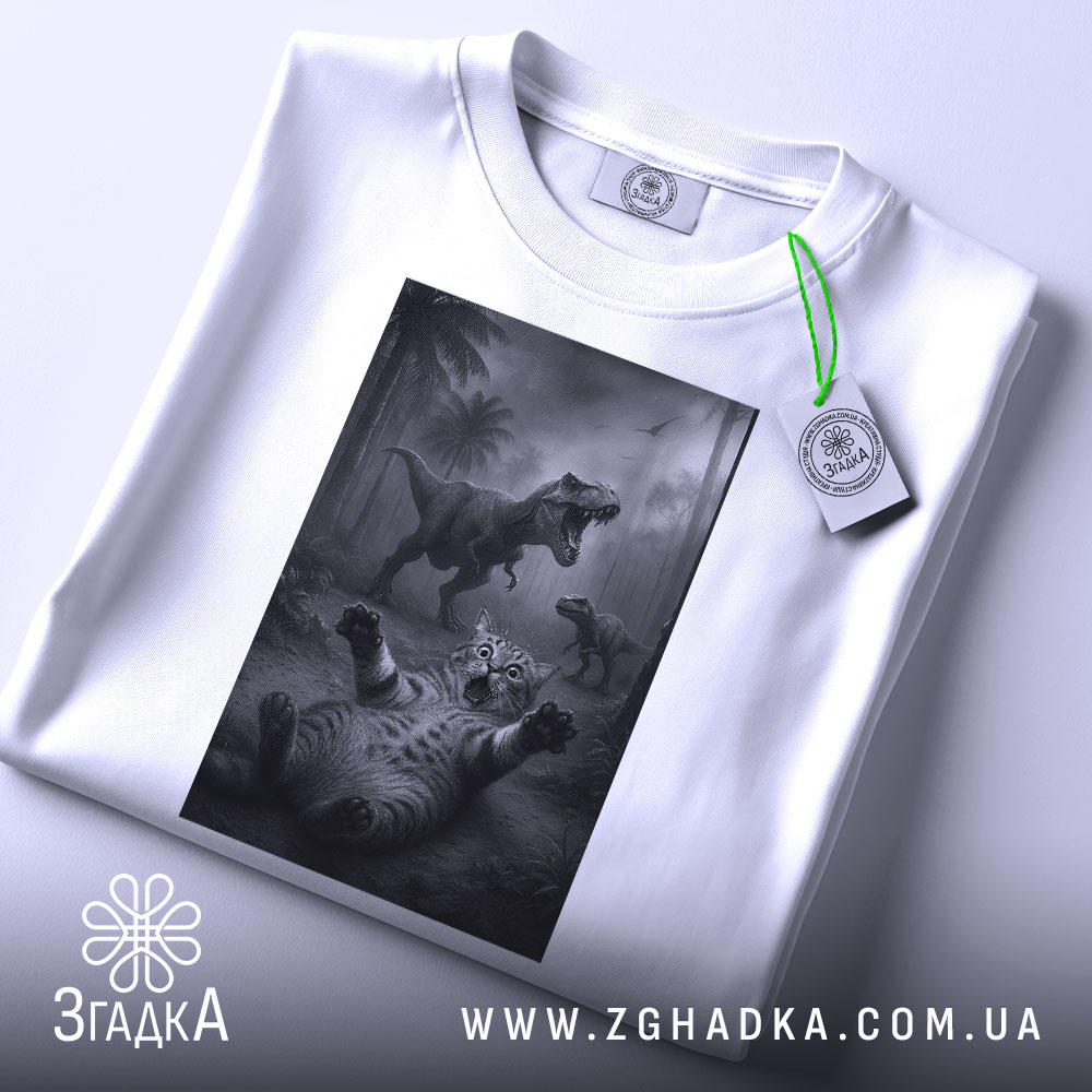 Ця футболка з принтом ‘кіт проти динозавр’ стане яскравим акцентом вашого гардеробу. Вона символізує боротьбу між силою і грацією, що робить її ідеальним вибором для сміливих особистостей.