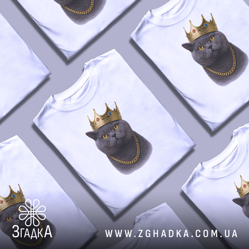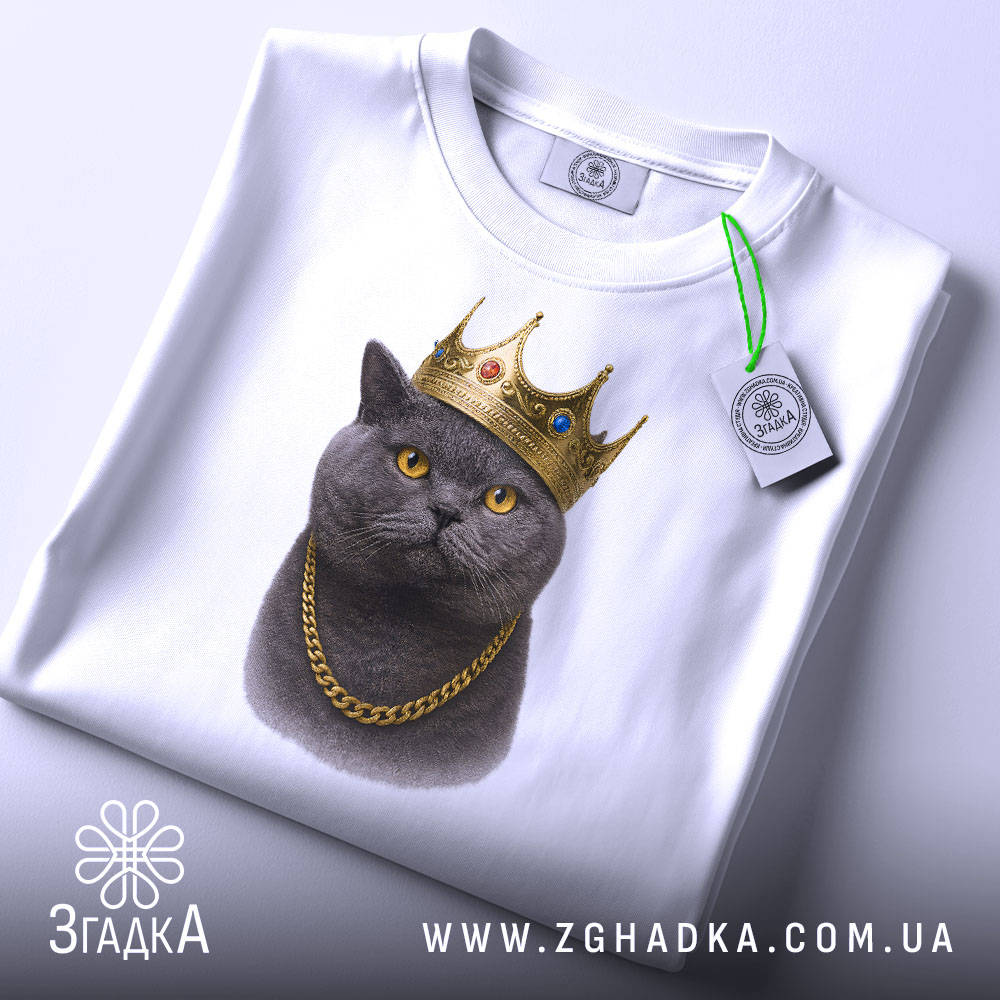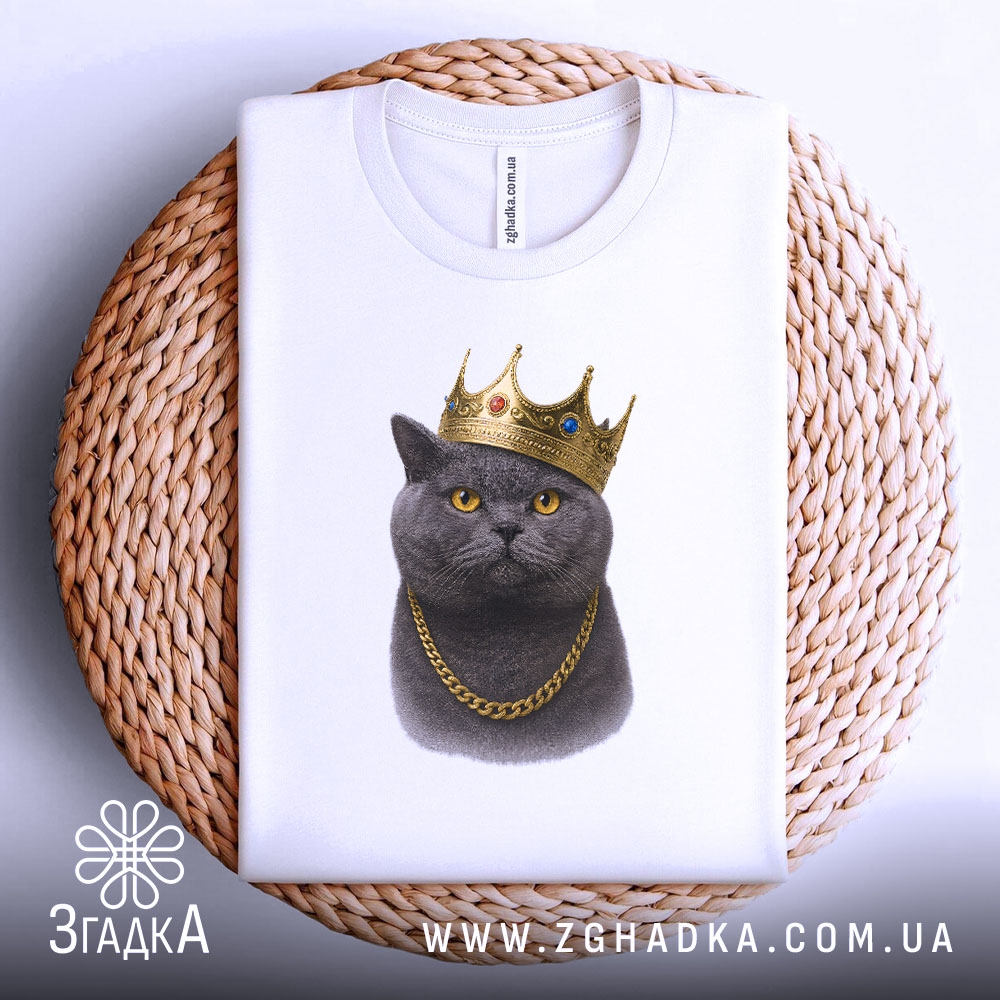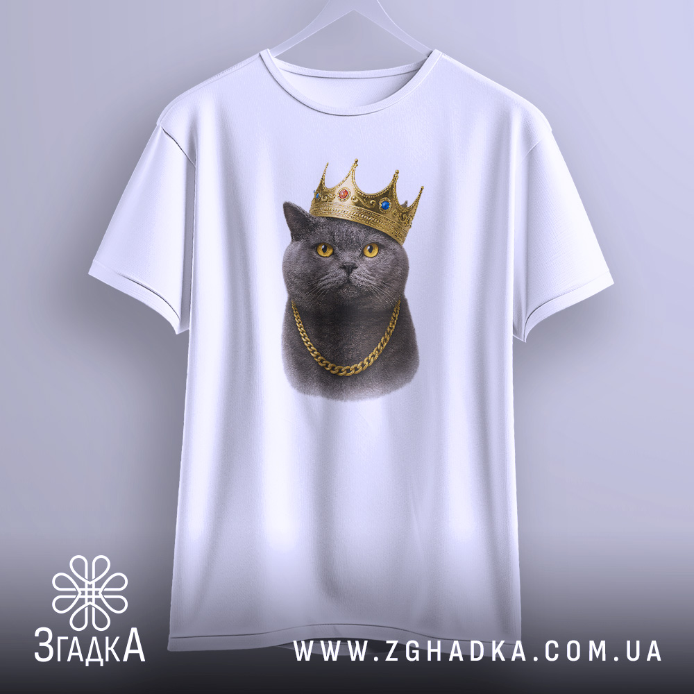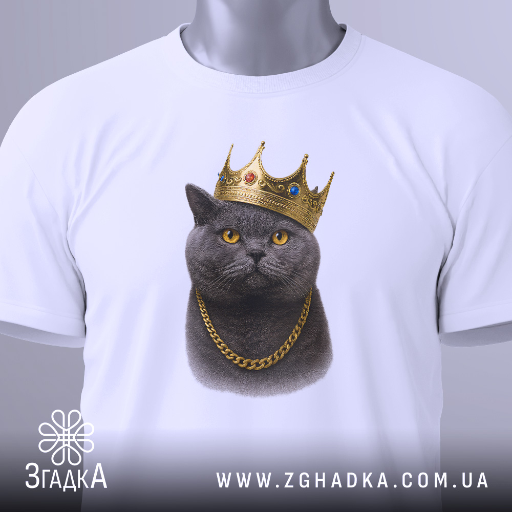 Футболка з принтом кота у короні – стильний і комфортний вибір. Ідеально підходить для любителів котів та подарунків.