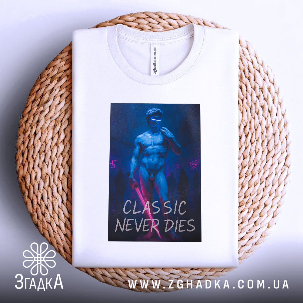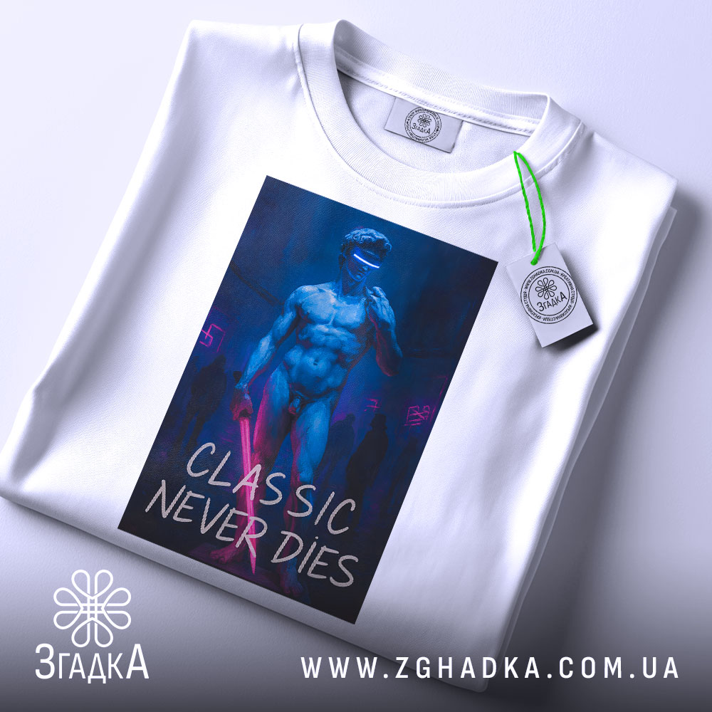Ця футболка виготовлена з якісних матеріалів, що забезпечують комфорт і стиль. Принт символізує вічні цінності, які ніколи не виходять з моди, і підходить для будь-якої ситуації.