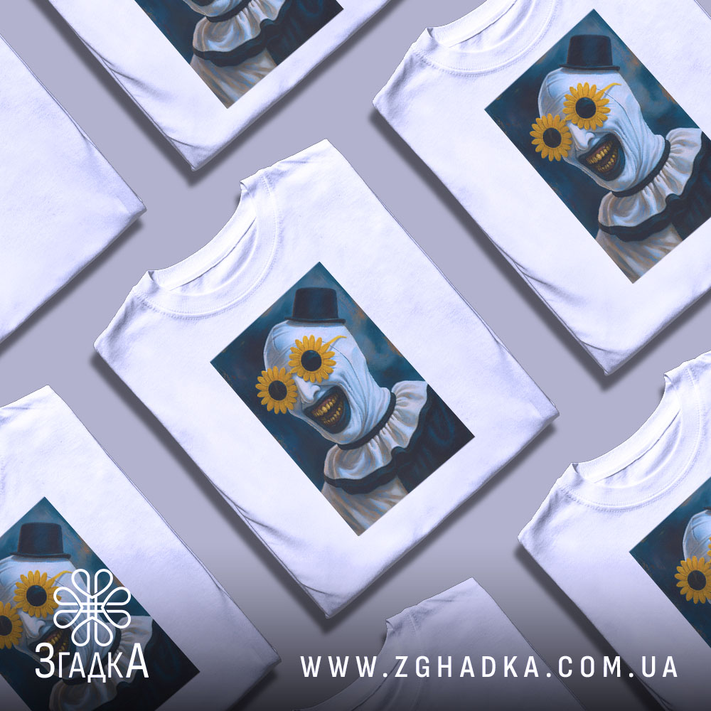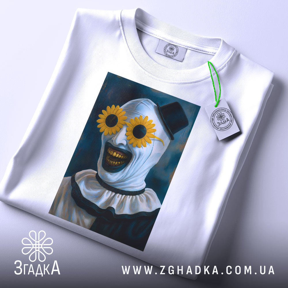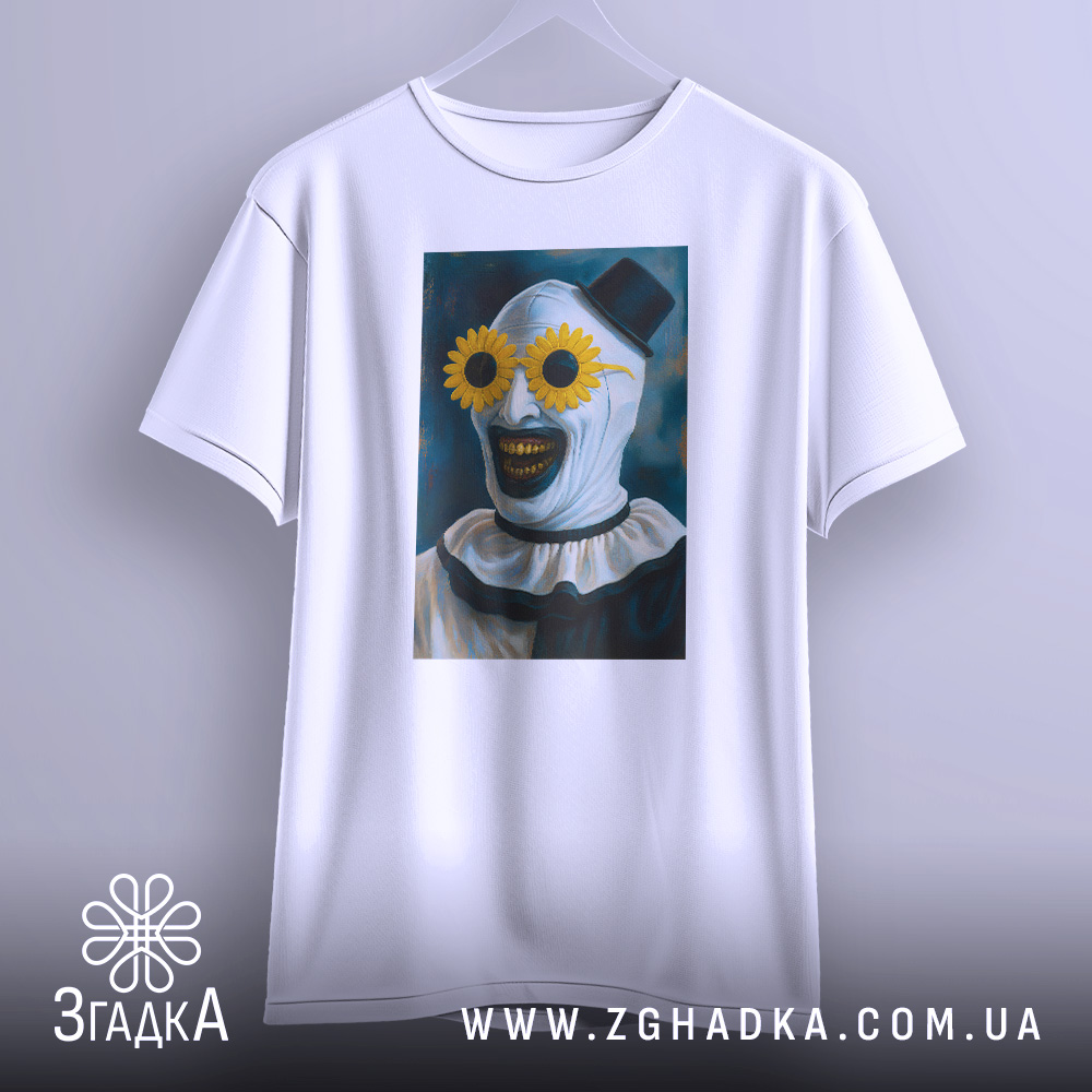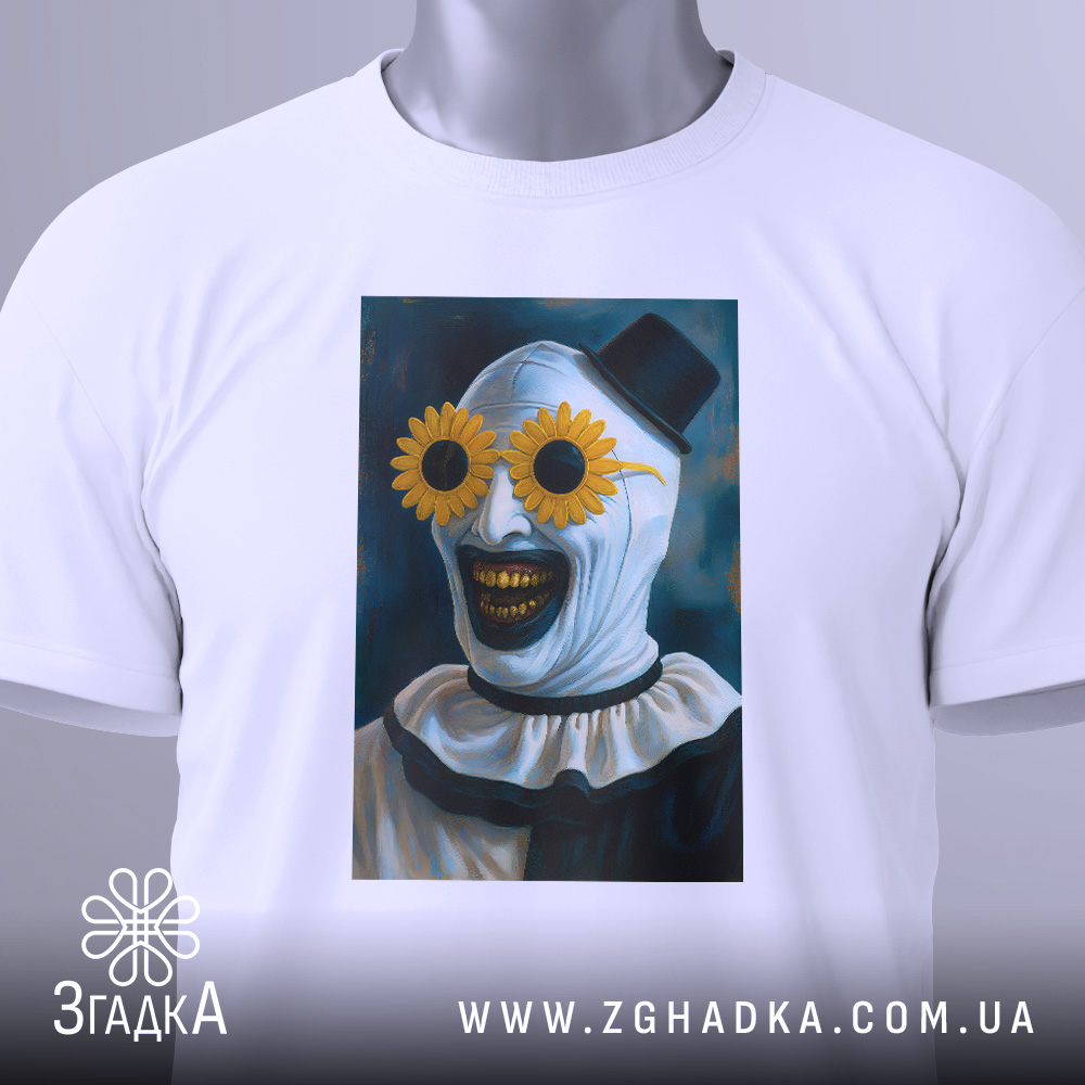 Ця футболка клоун жахів стане яскравим акцентом у вашому гардеробі. Принт символізує страх і загадковість, що робить її ідеальним вибором для фанатів хоррор-культури.