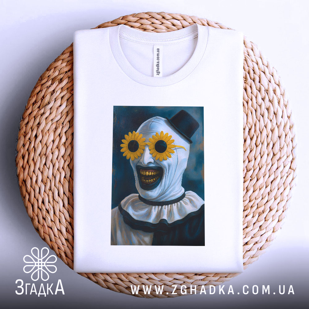 На принті зображено жахливого клоуна, що викликає трепет і захоплення. Цей стильний дизайн ідеально підходить для любителів жахів. Відчуйте емоції та приверніть увагу оточуючих!
