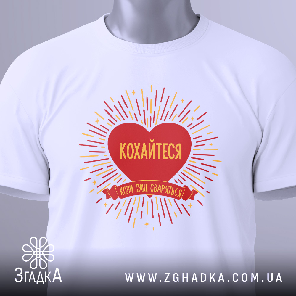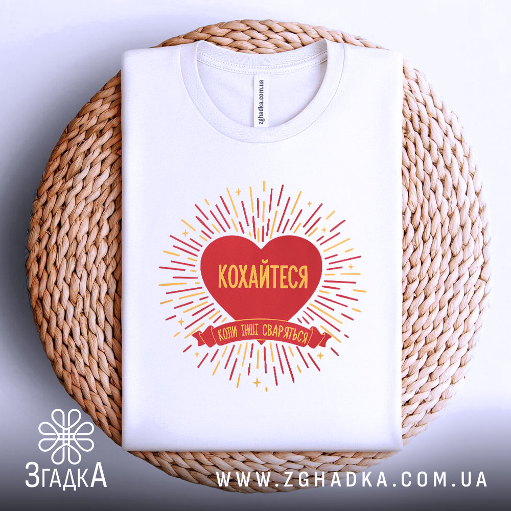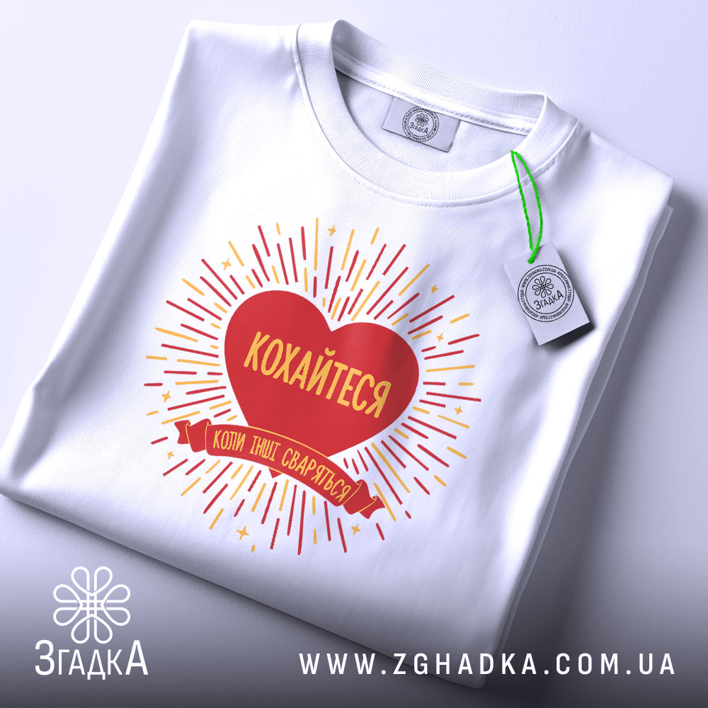 Ця футболка – це не просто одяг, а стильний вираз ваших почуттів. Принт ‘кохайтеся коли сваряться’ нагадує про важливість любові у стосунках, навіть у складні моменти. Вона стане чудовим доповненням до вашого гардеробу.