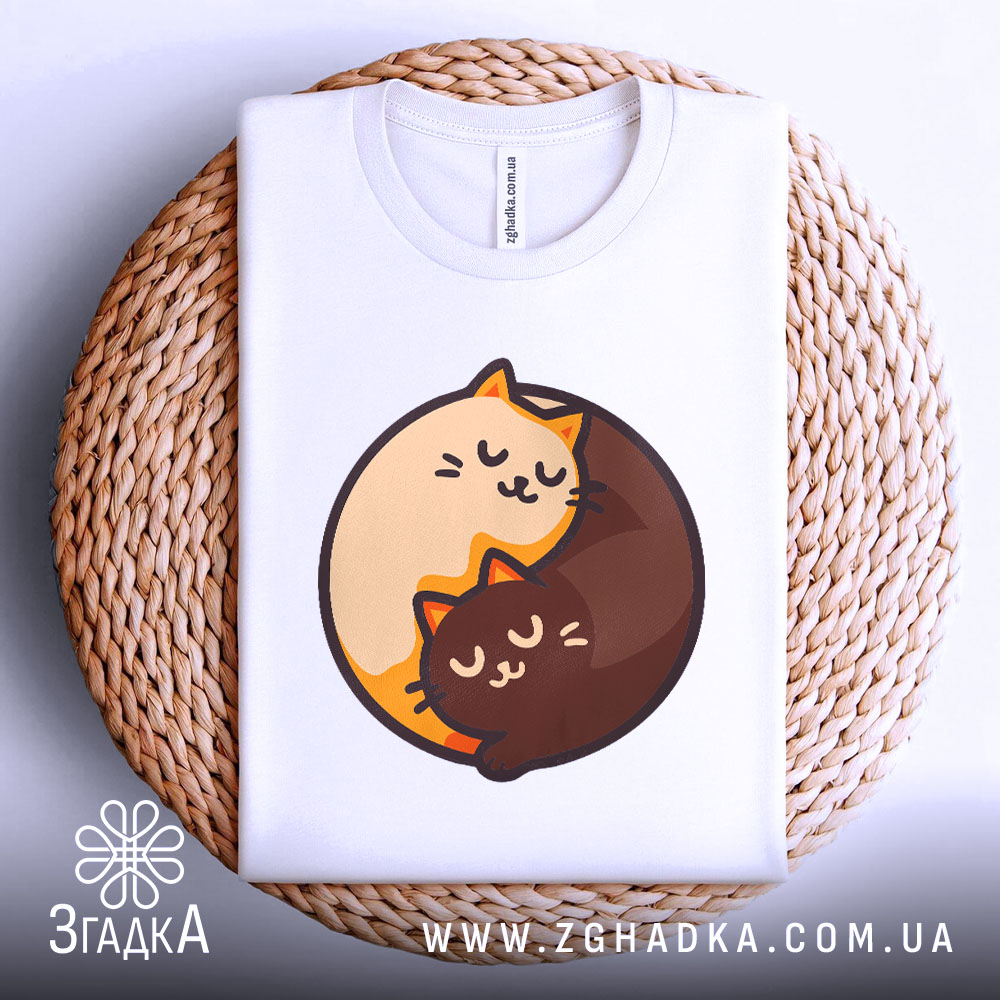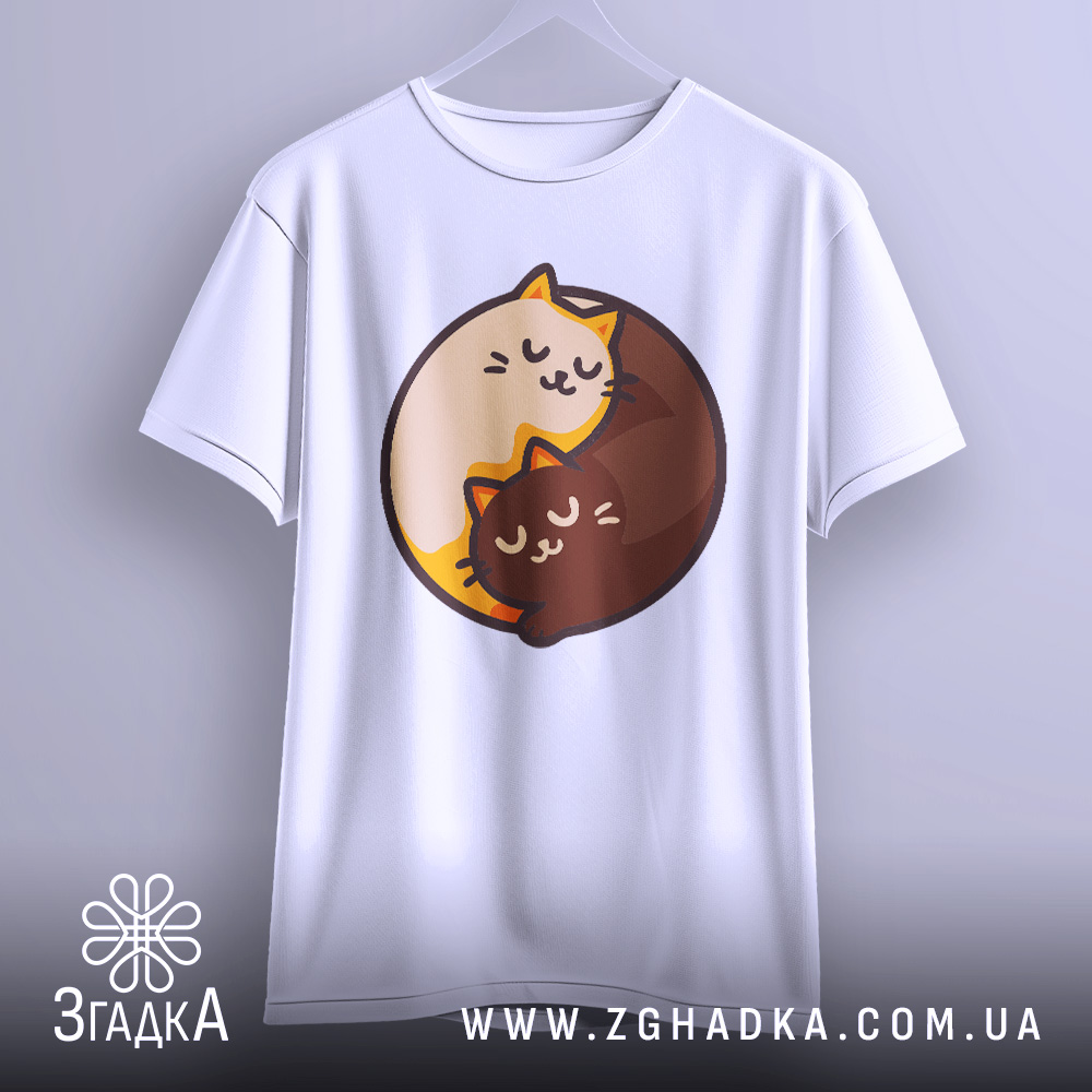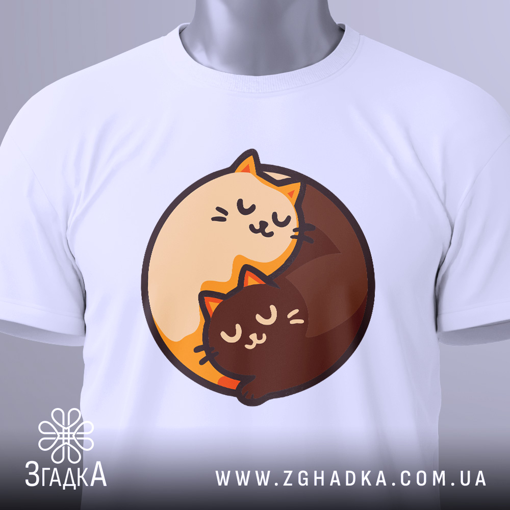 На принті зображено котячий інь-янь, що символізує гармонію та баланс. Цей стильний дизайн викликає позитивні емоції та підходить для любителів котів. Замовте свою футболку та підкресліть свій унікальний стиль!