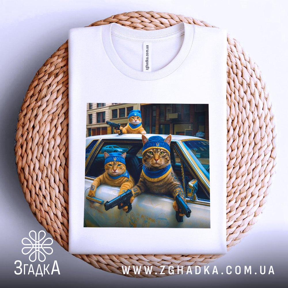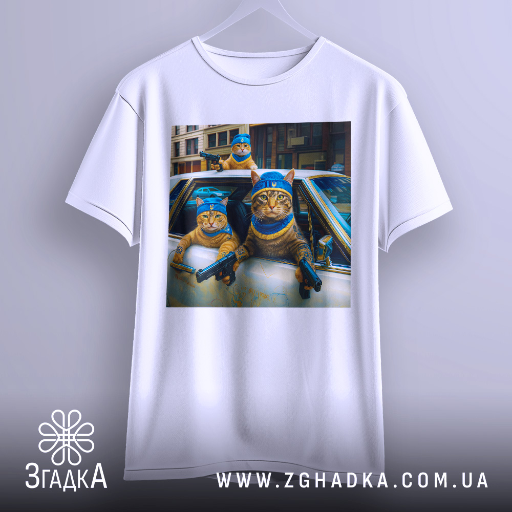 Футболка з принтом ‘коти банда’ – ідеальний вибір для любителів котів. Стильна, комфортна та практична річ для повсякденного носіння.