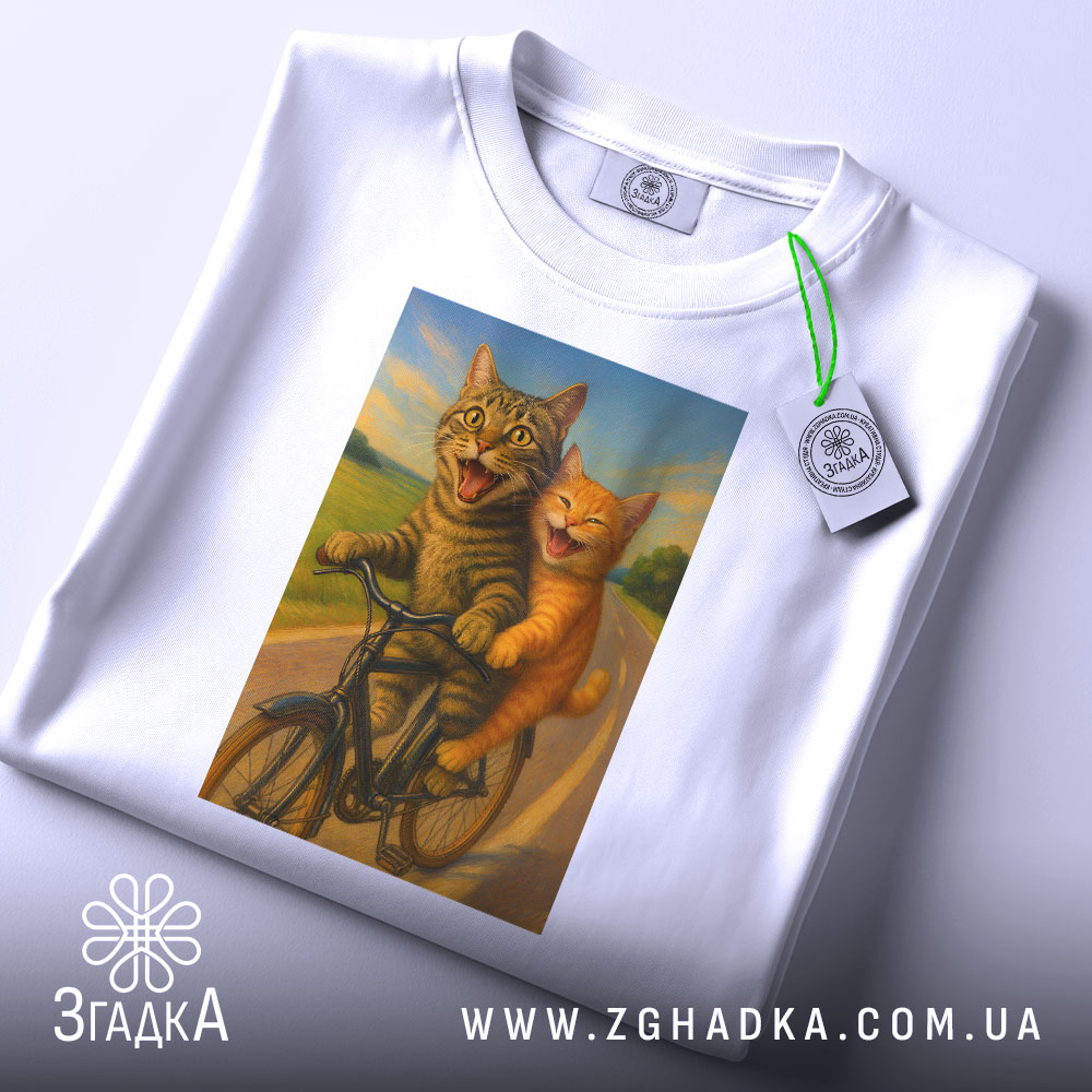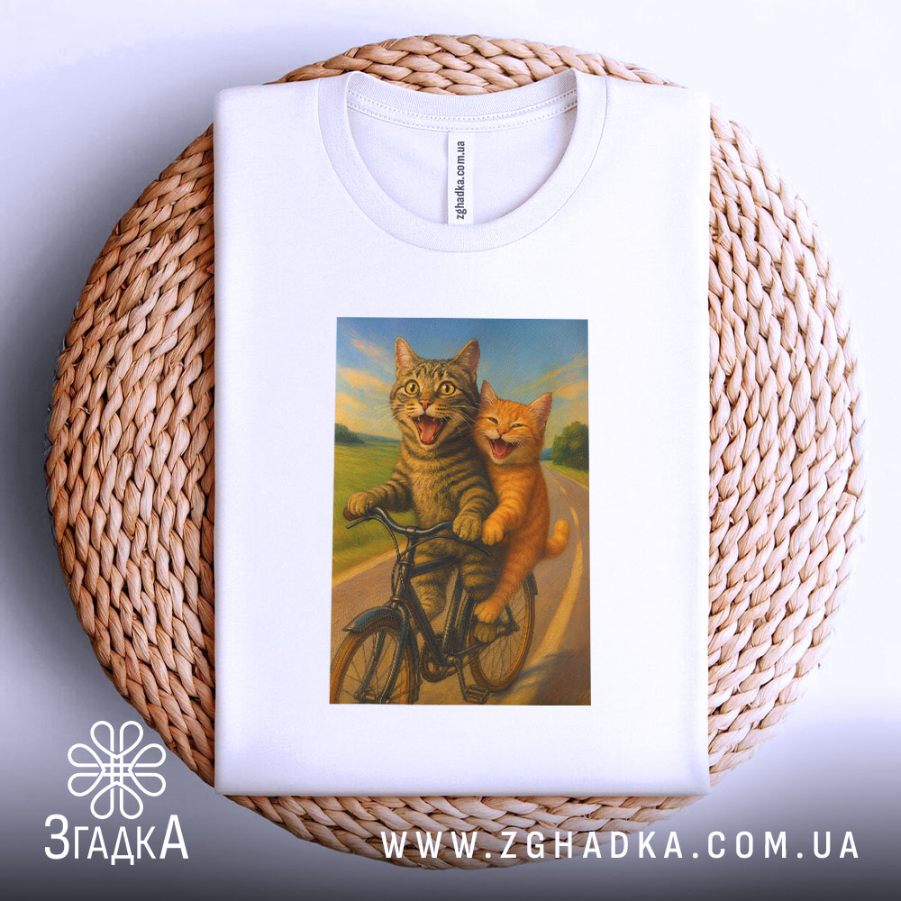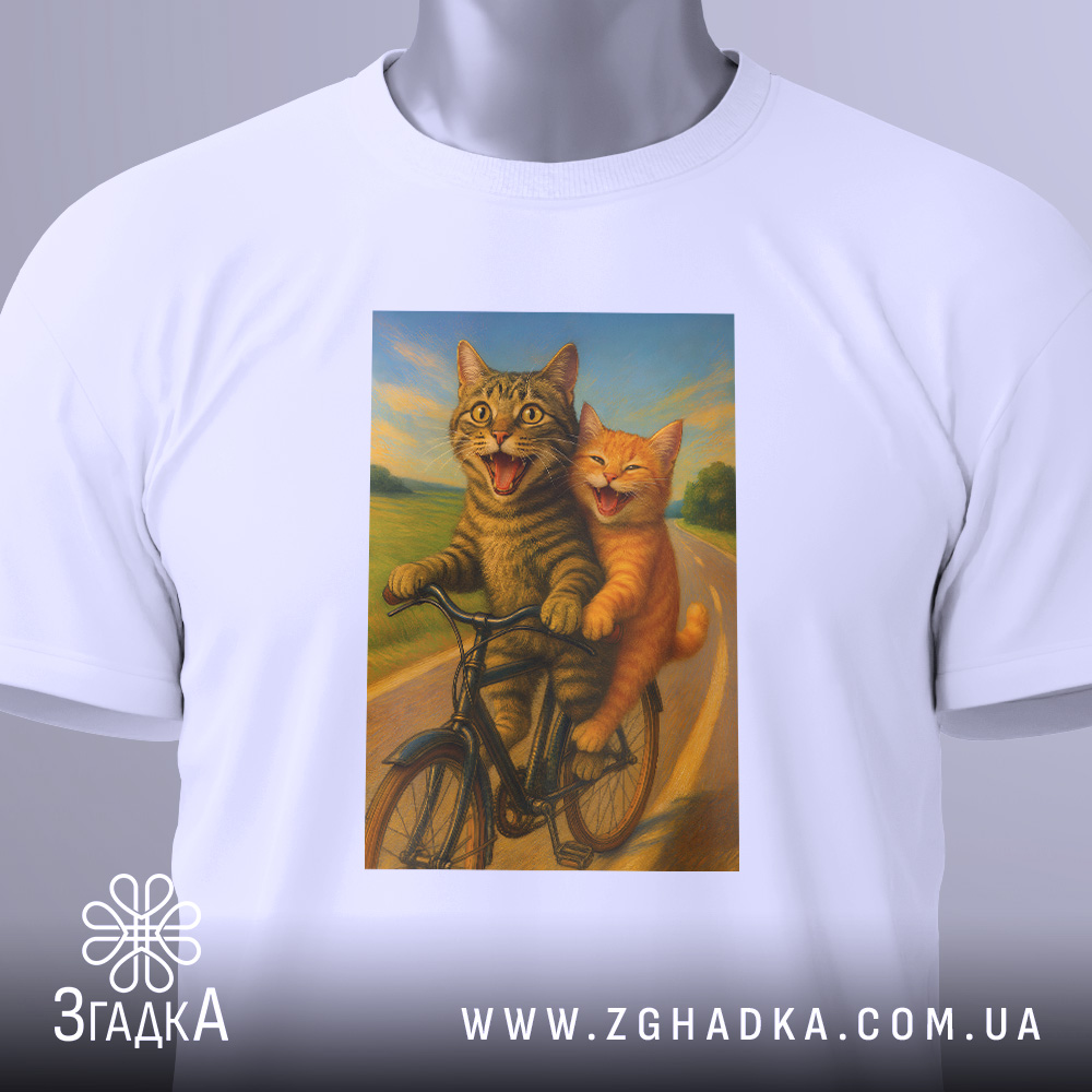 На принті зображено милих котів, які катаються на велосипеді, що викликає усмішку та позитивні емоції. Ця футболка стане чудовим доповненням до вашого гардеробу та приверне увагу оточуючих.