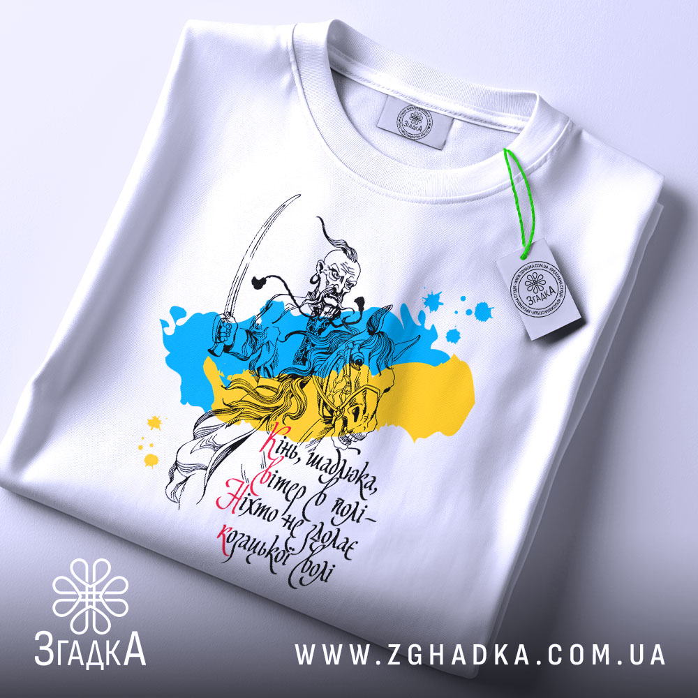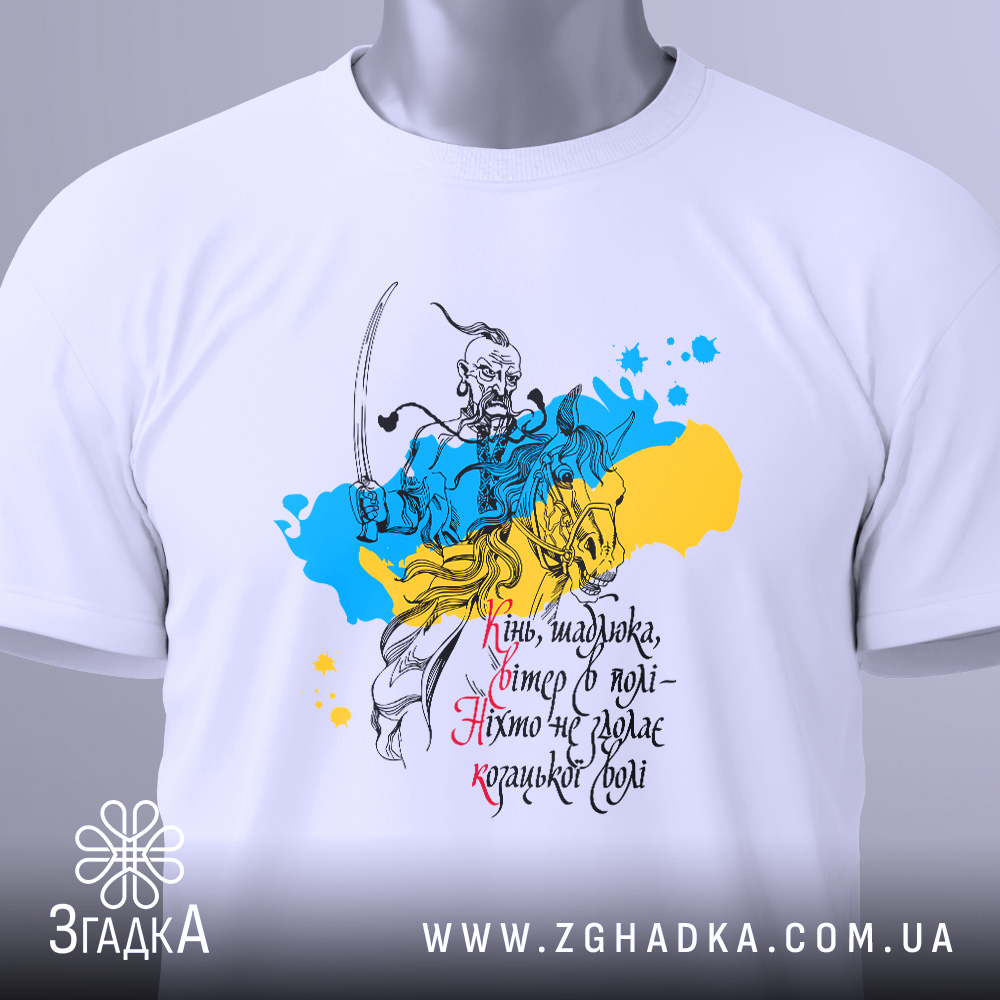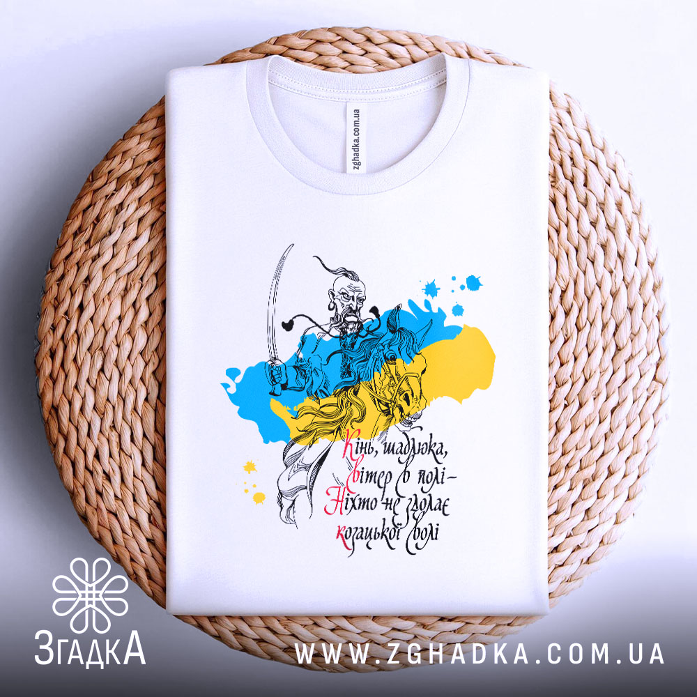 На принті зображено символи козацької волі, що передають дух свободи та незалежності. Ця футболка стане ідеальним вибором для тих, хто цінує українську культуру. Вдягніть її та відчуйте гордість за свої корені!