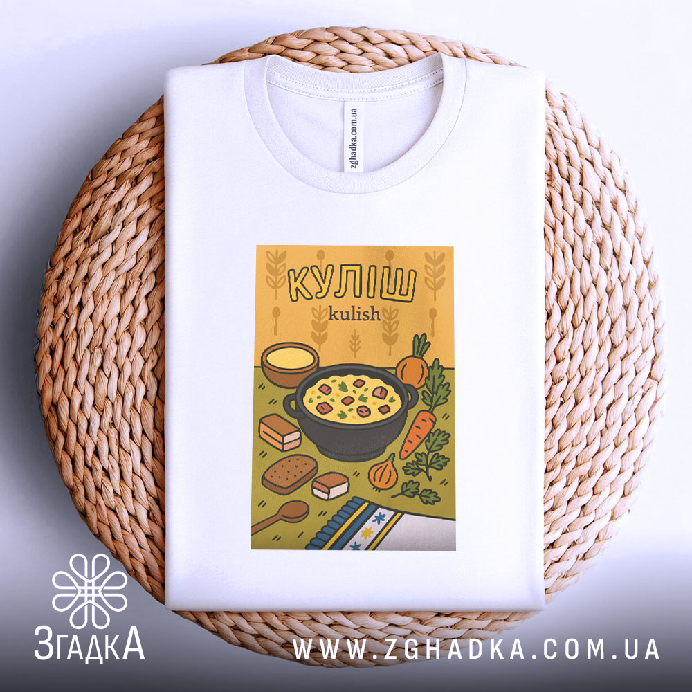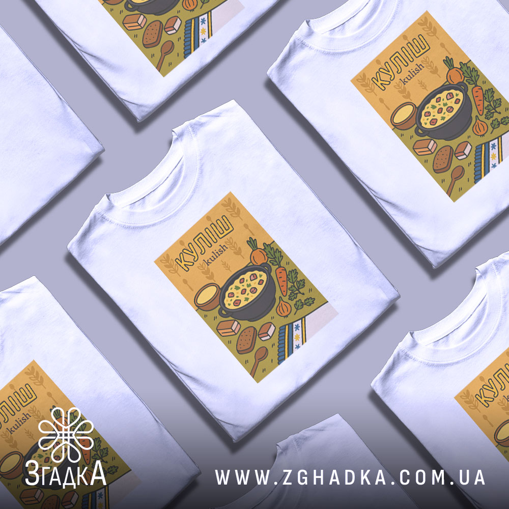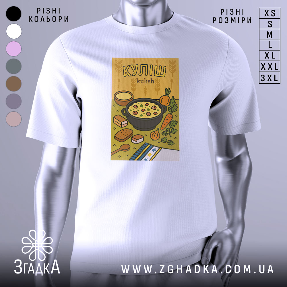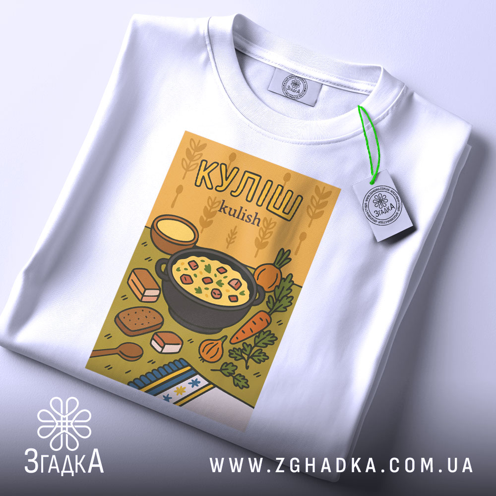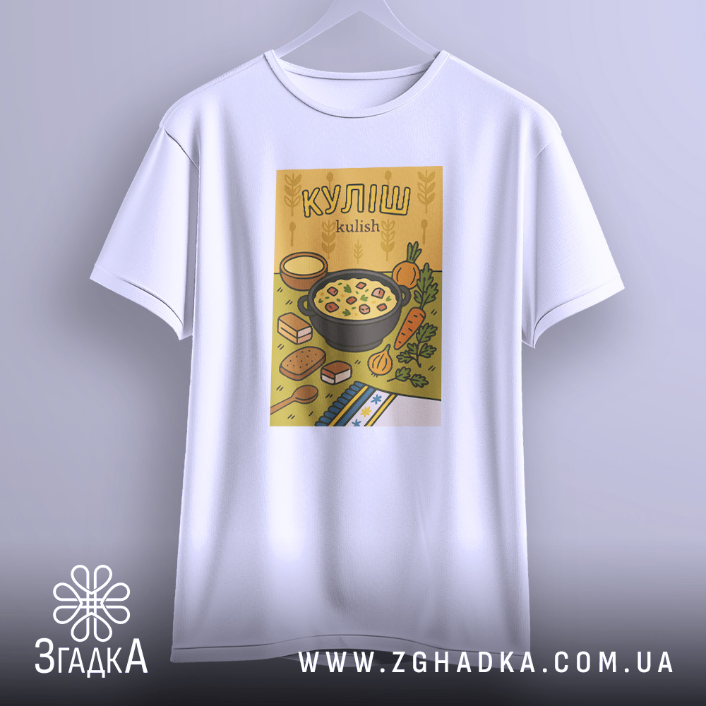 Футболка куліш виконана з високоякісних матеріалів, що забезпечують комфорт та стиль. Принт на футболці відображає українську кулінарну спадщину, що робить її ідеальним вибором для тих, хто цінує традиції.