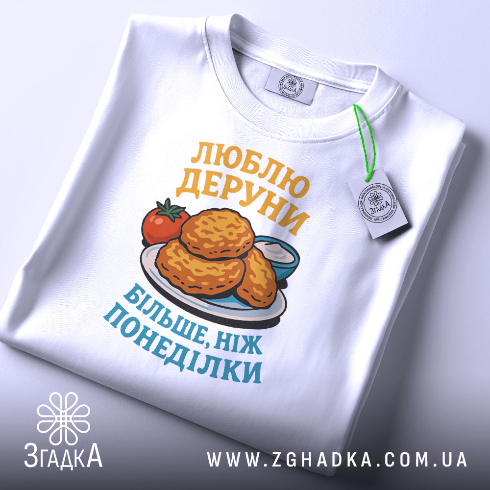 Футболка ‘люблю деруни’ – це не просто одяг, а спосіб виразити свою любов до смачної їжі та українських традицій. Замовте її сьогодні і насолоджуйтеся комфортом та стилем!