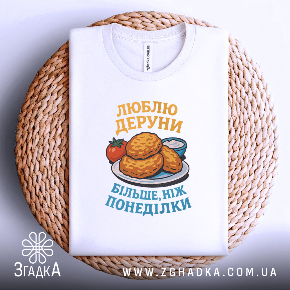 Футболка ‘люблю деруни’ – ідеальний подарунок для гурманів. Яскравий принт та комфортний матеріал роблять її незамінною.