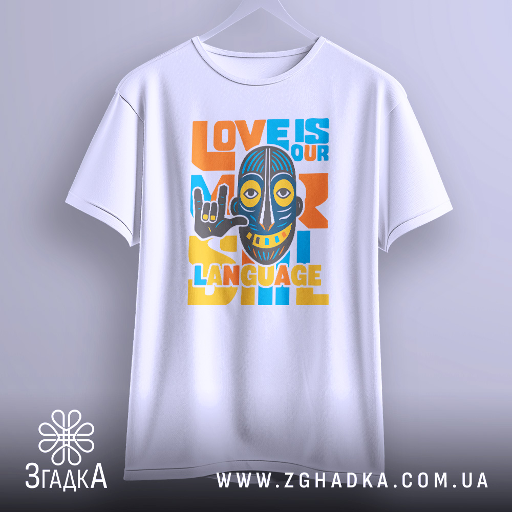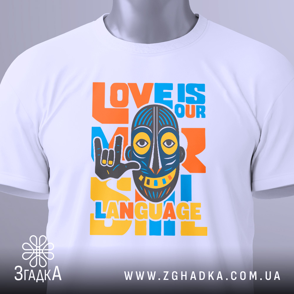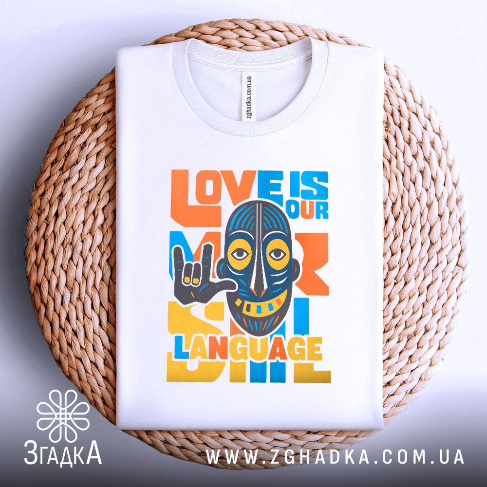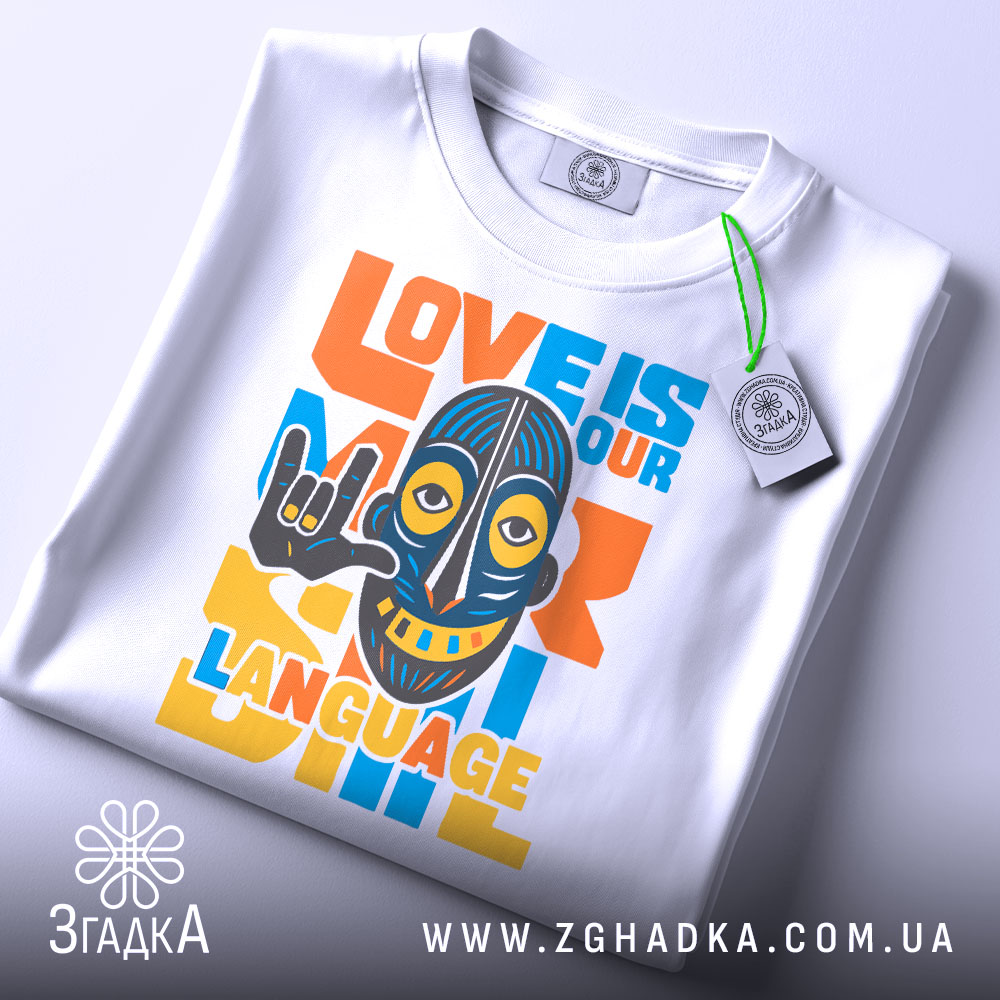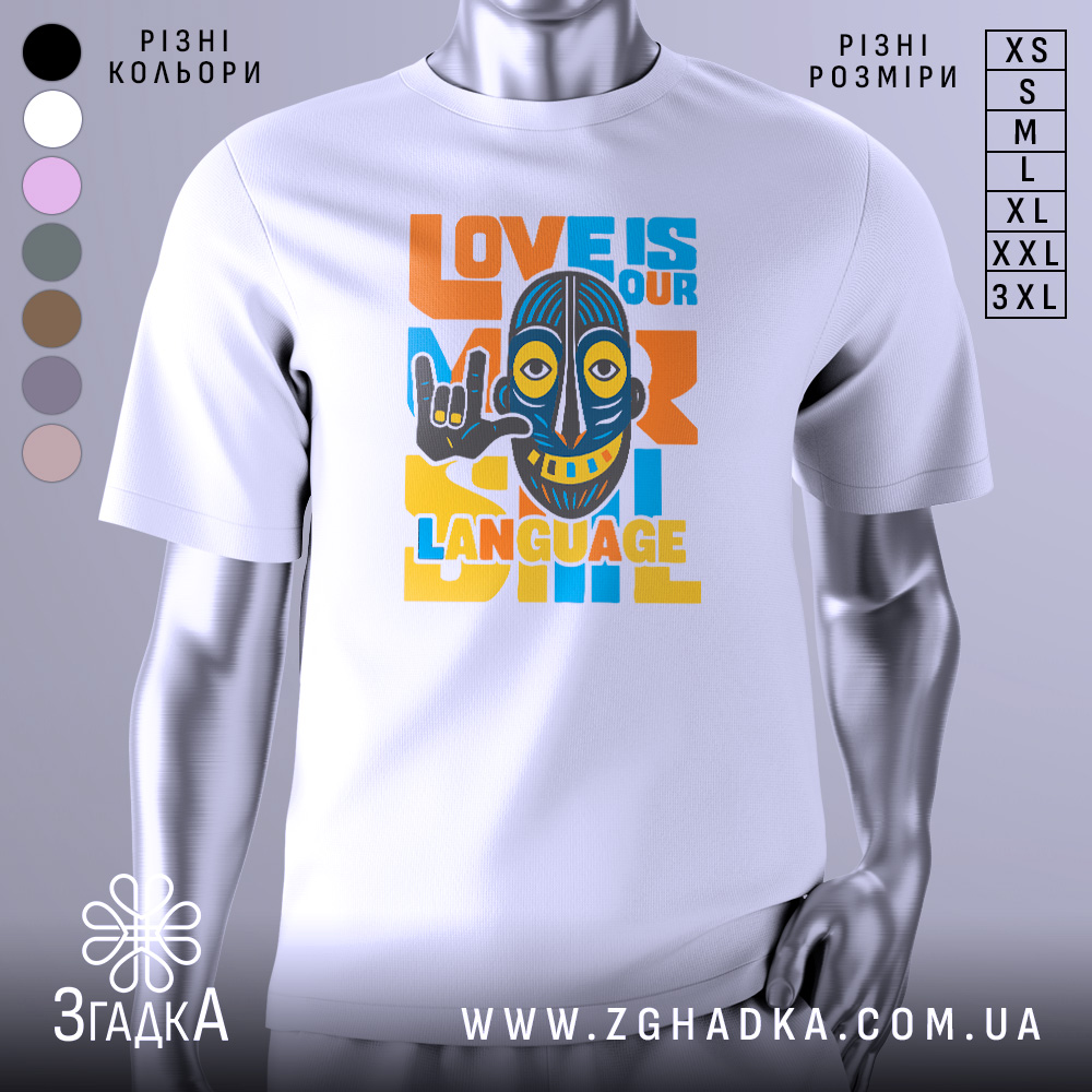 Ця футболка з принтом ‘Любов — це мова, яку розуміє кожен’ передає емоції та позитив. Носіть її з гордістю та діліться своїми почуттями!