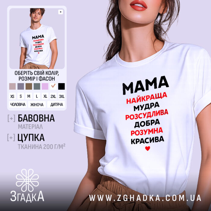 Футболка 'мама найкраща' – це не просто одяг, а символ вашої любові та вдячності. Оберіть стильний та комфортний варіант для себе або в подарунок.