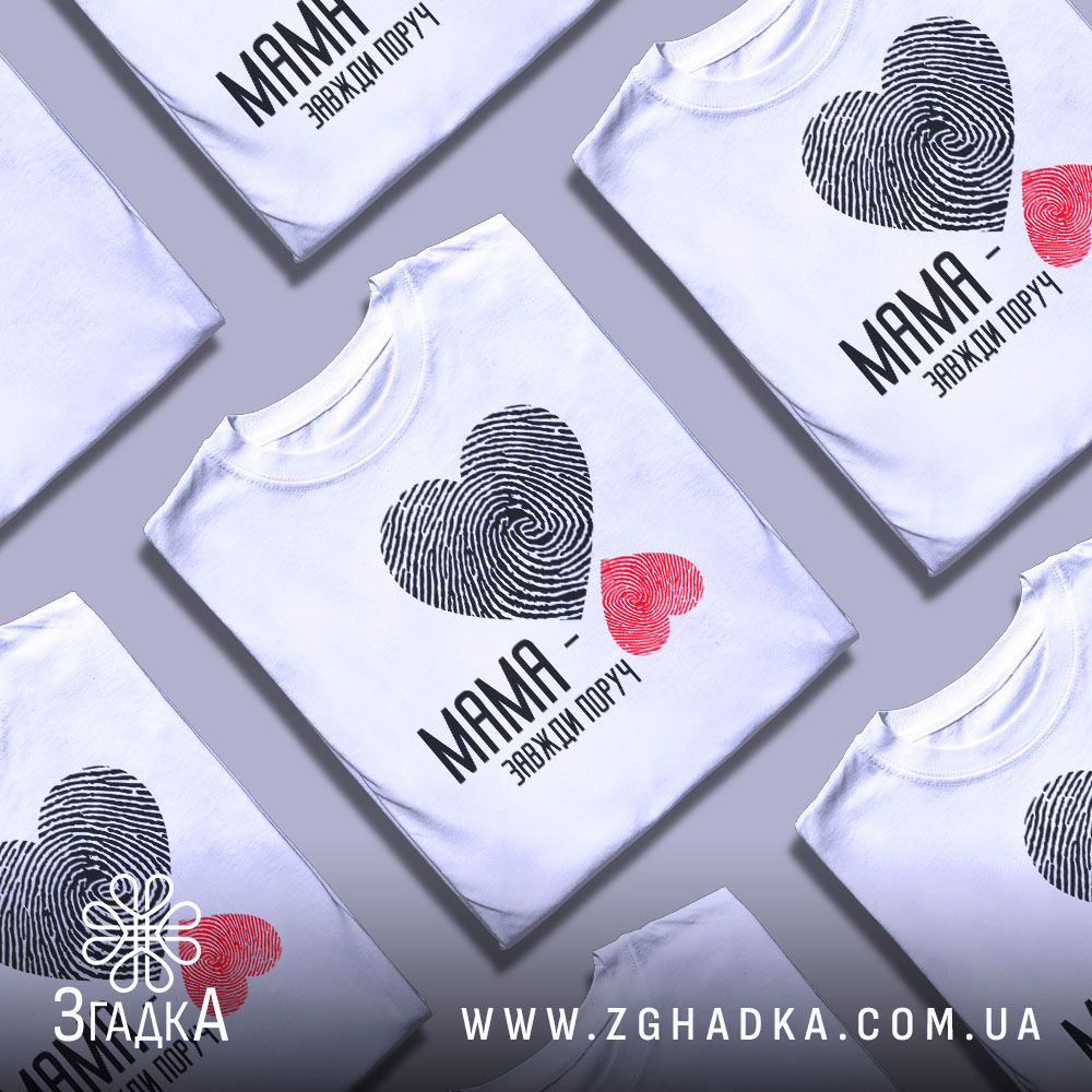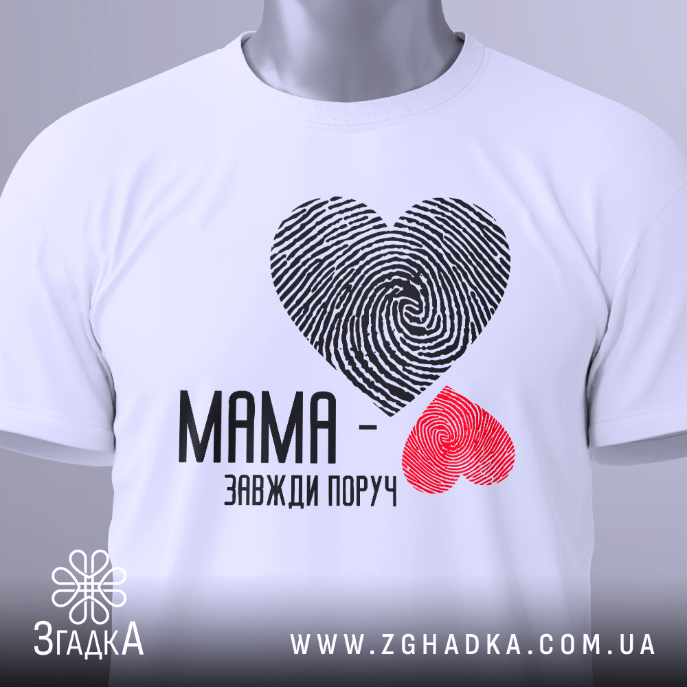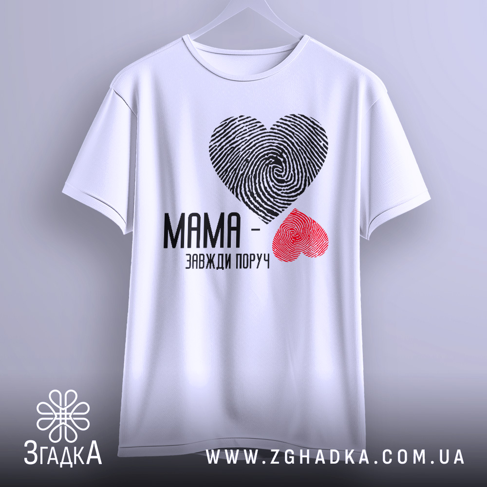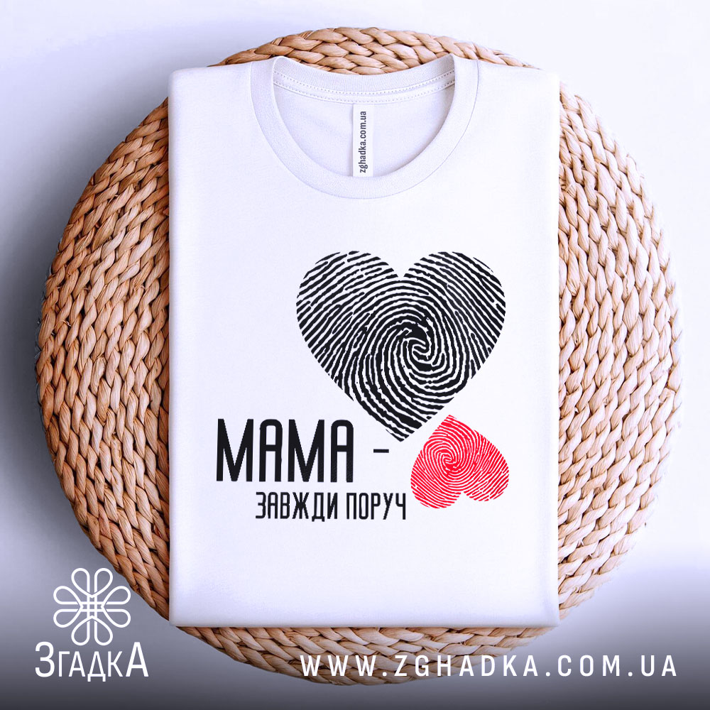 Футболка з принтом ‘мама завжди поруч’ стане чудовим доповненням до вашого гардеробу. Вона підкреслить вашу індивідуальність та емоційний зв’язок з близькими.