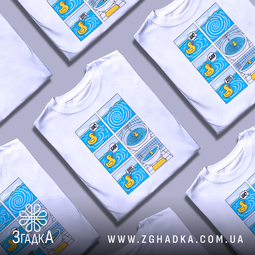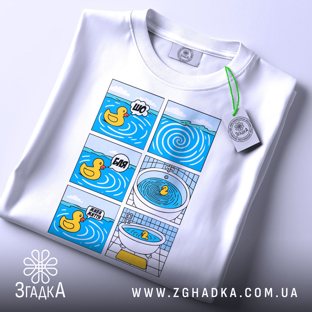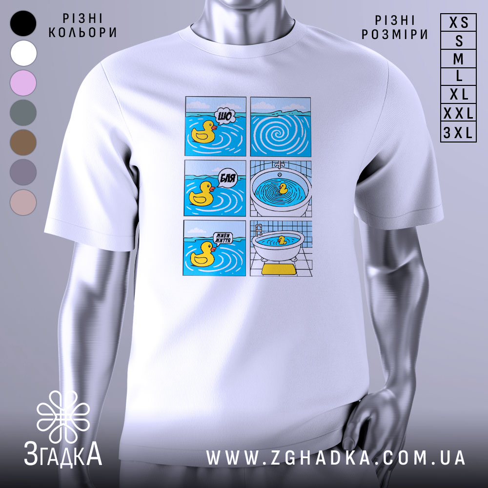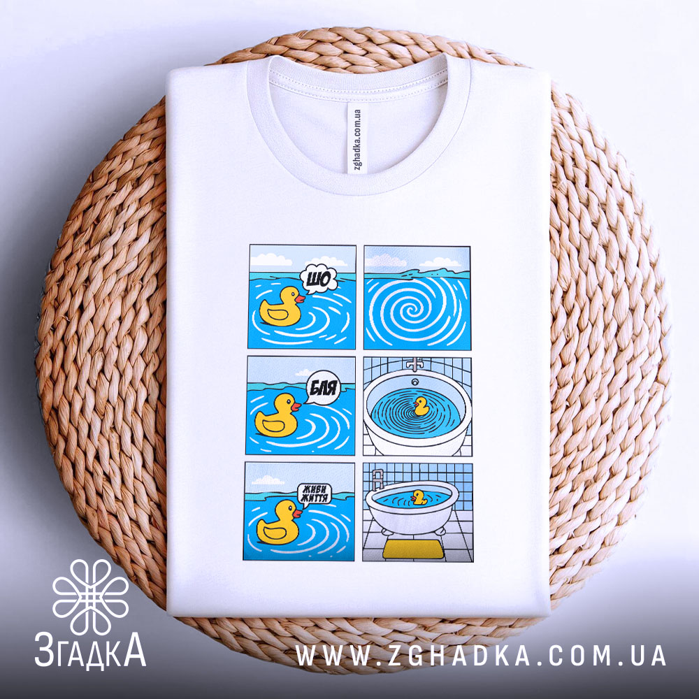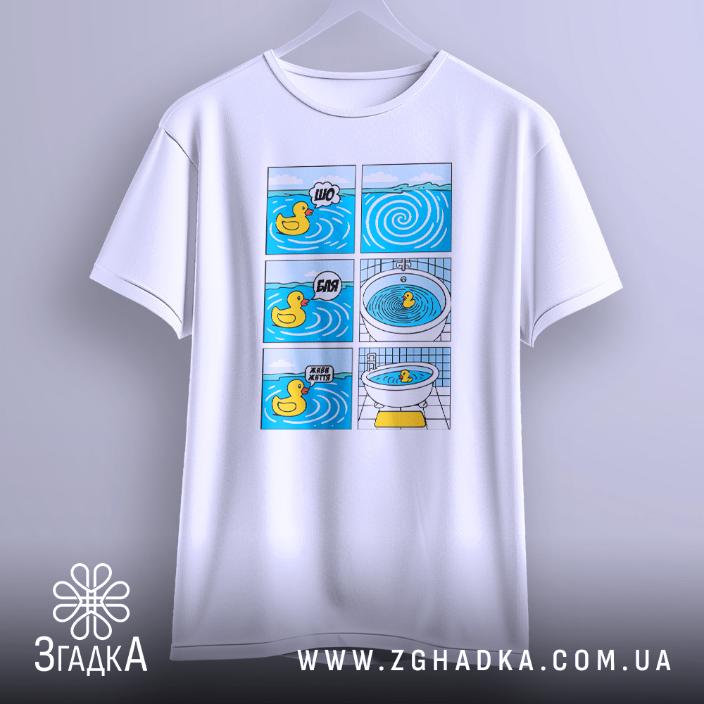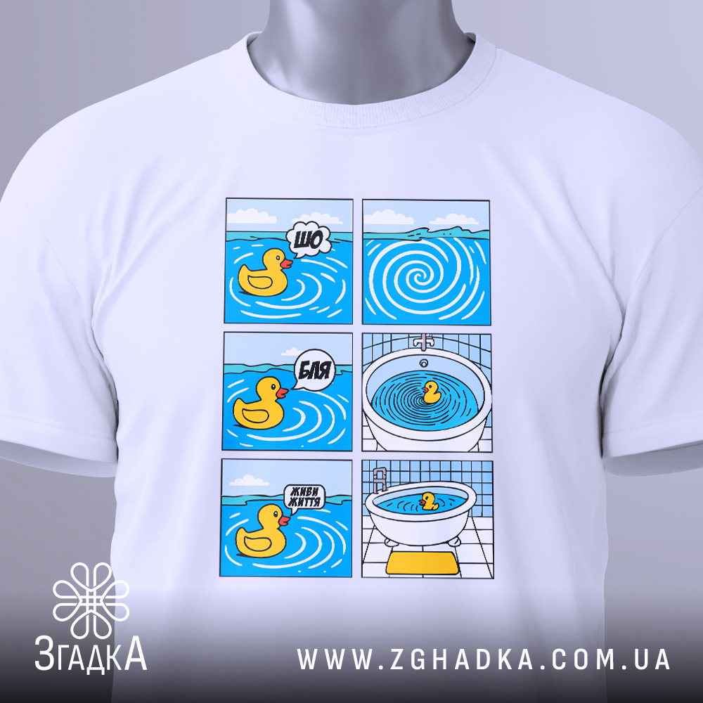 Футболка Мем Качечка виготовлена з якісних матеріалів, що забезпечують комфорт під час носіння. Принт з качечкою символізує радість та легкість, роблячи цю футболку ідеальним вибором для повсякденного стилю.