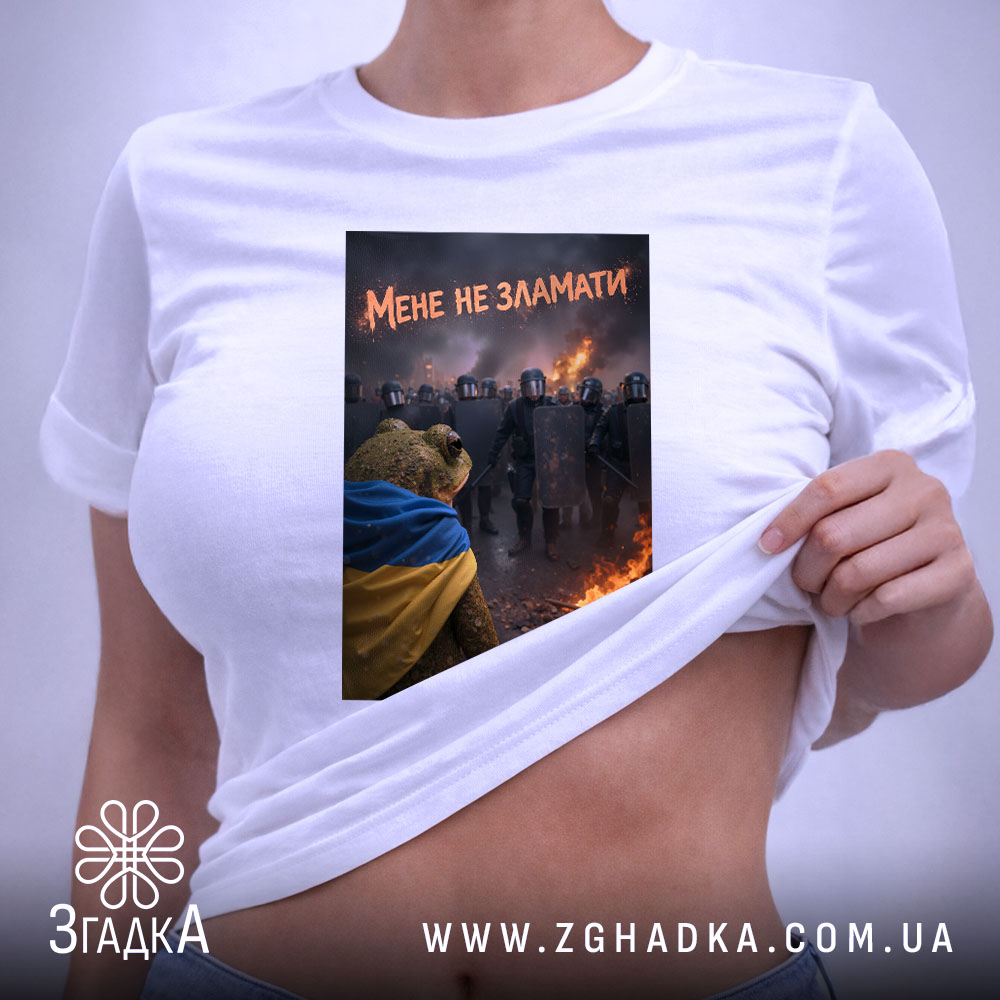 Вражаючий принт зображує лягушку в українському прапорі, що стоїть перед загоном поліції. Яскраві кольори вогню та темряви створюють контраст, а напис ‘Мене не зламати’ виглядає як потужна заява. Стиль графіки поєднує елементи реалізму і сучасного мистецтва.