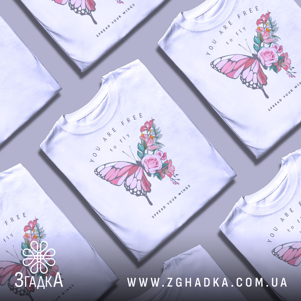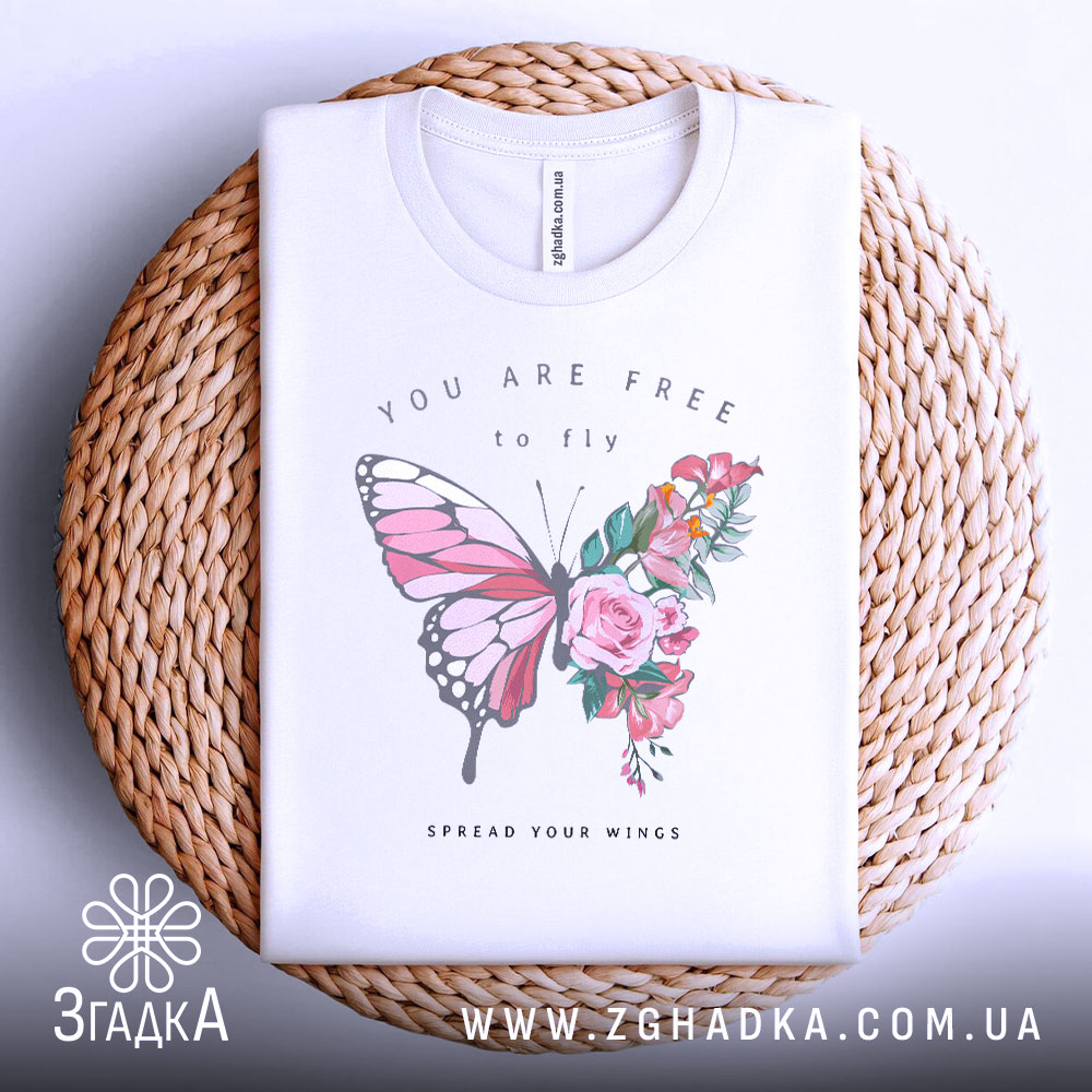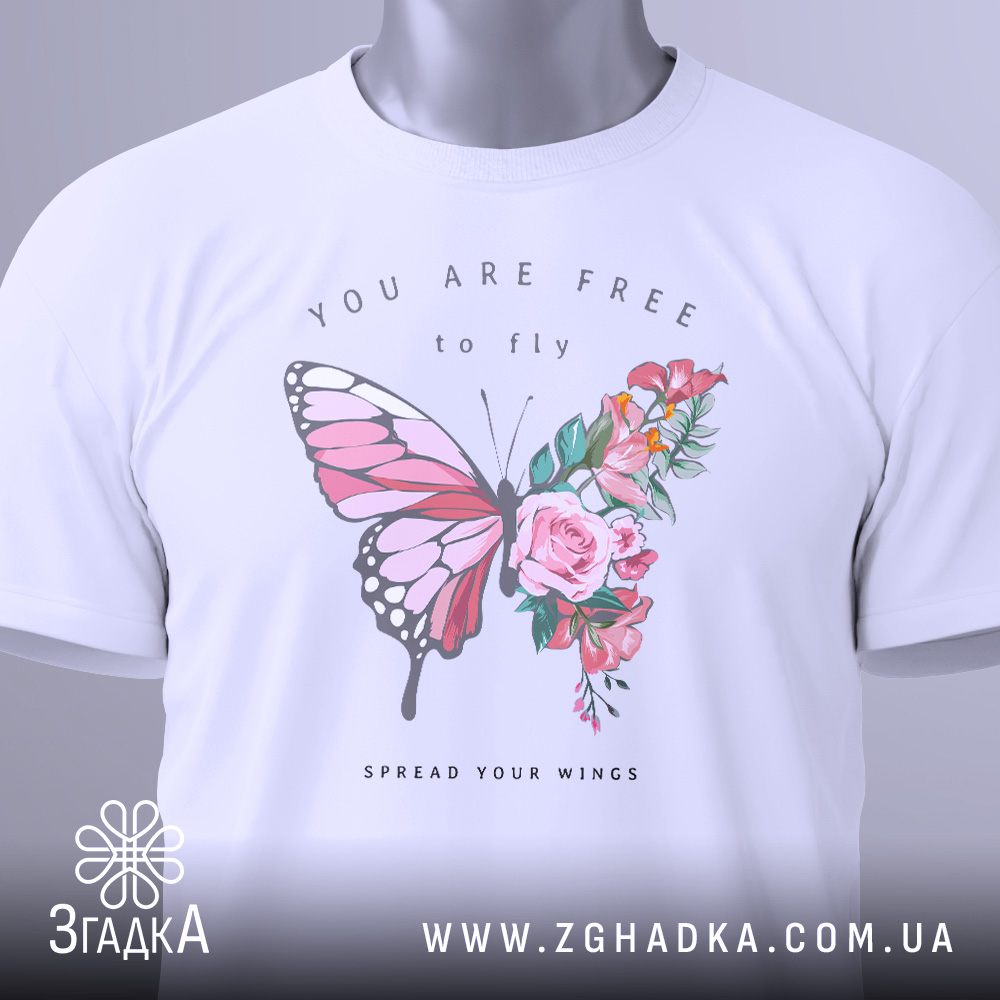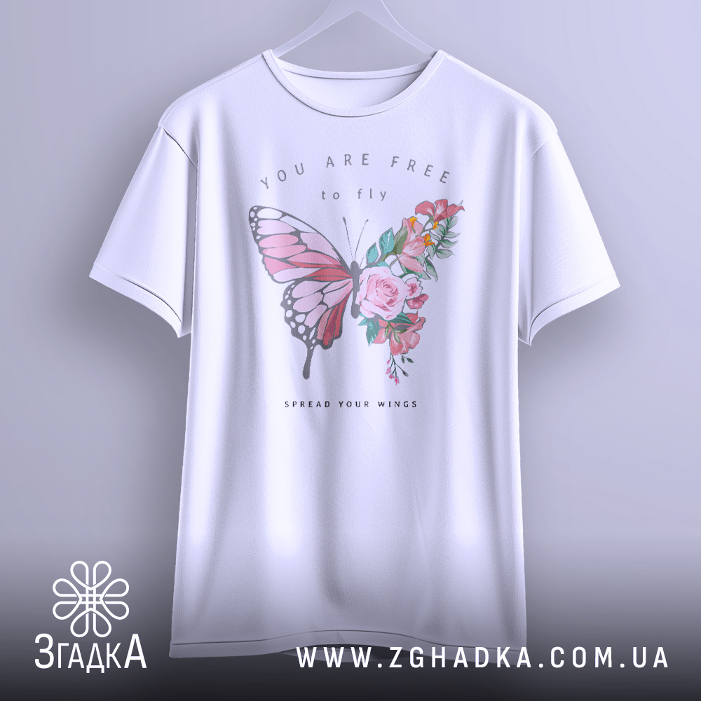 На принті зображений ніжний метелик серед квітів, що символізує свободу та красу. Ця футболка стане яскравим акцентом у вашому гардеробі, підкреслюючи ваш стиль. Не пропустіть можливість додати її до свого образу!