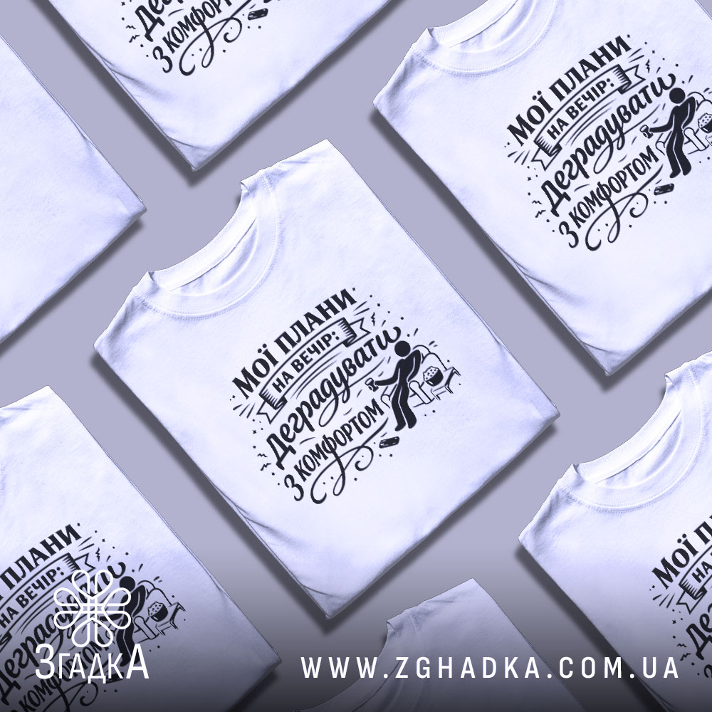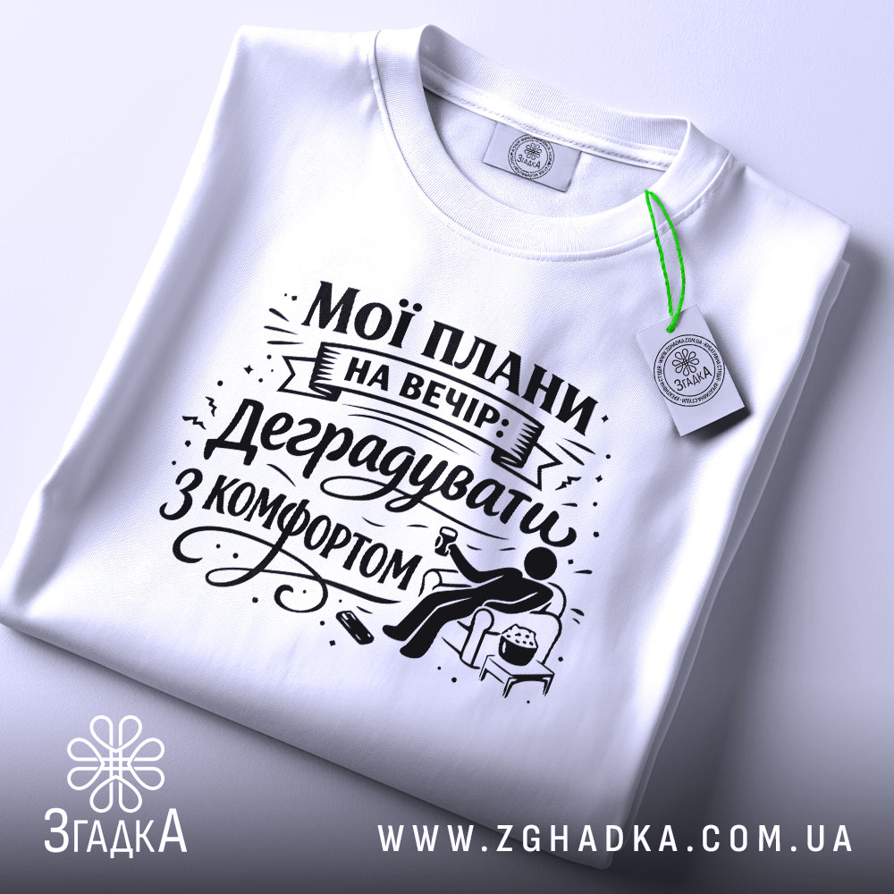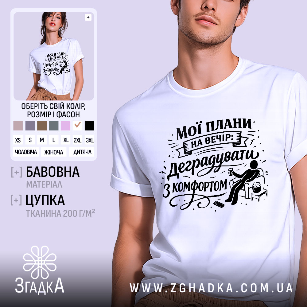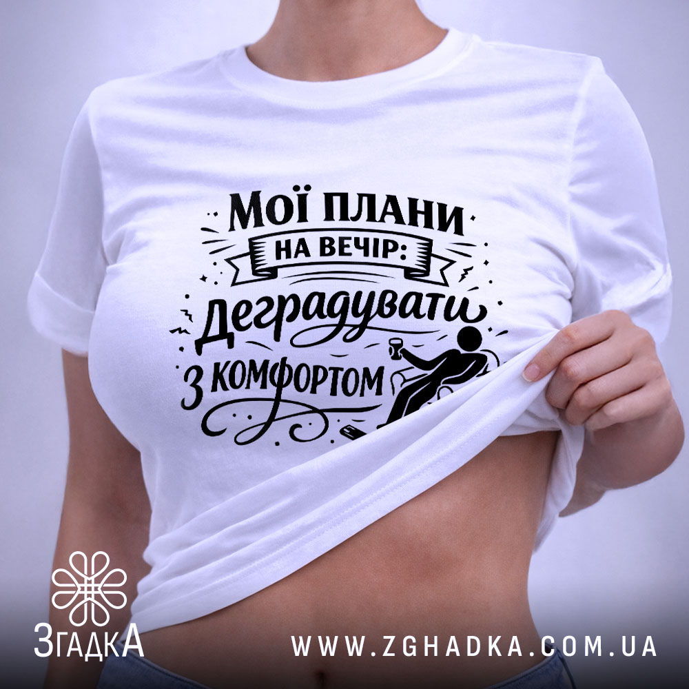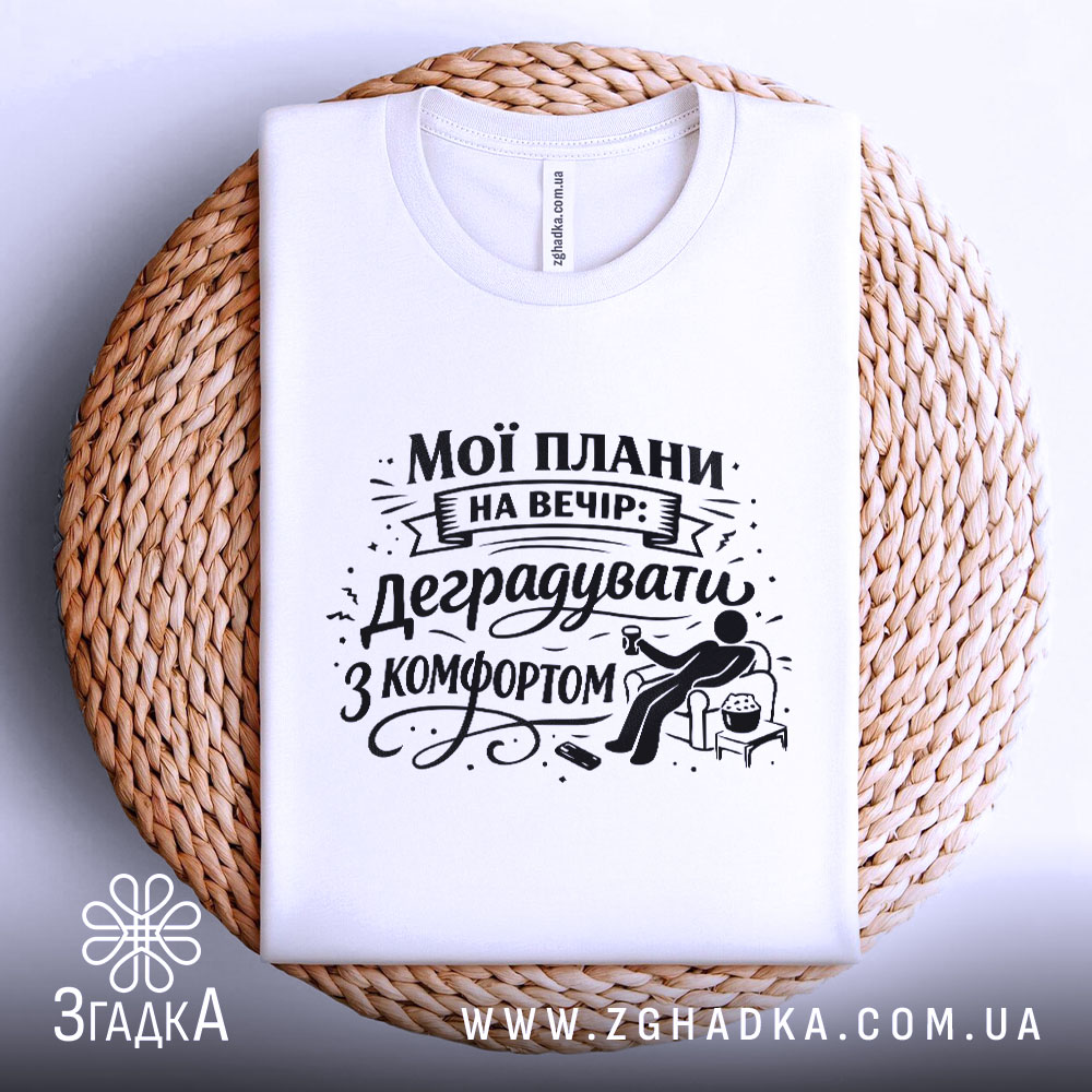 Футболка ‘мої плани на вечір’ – це не просто одяг, а стильний вираз твоєї особистості. Замовляй свою футболку вже сьогодні та підкресли свій унікальний стиль!