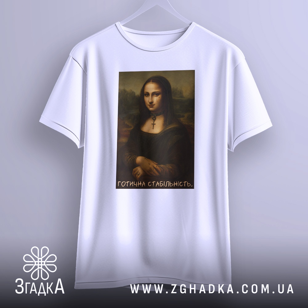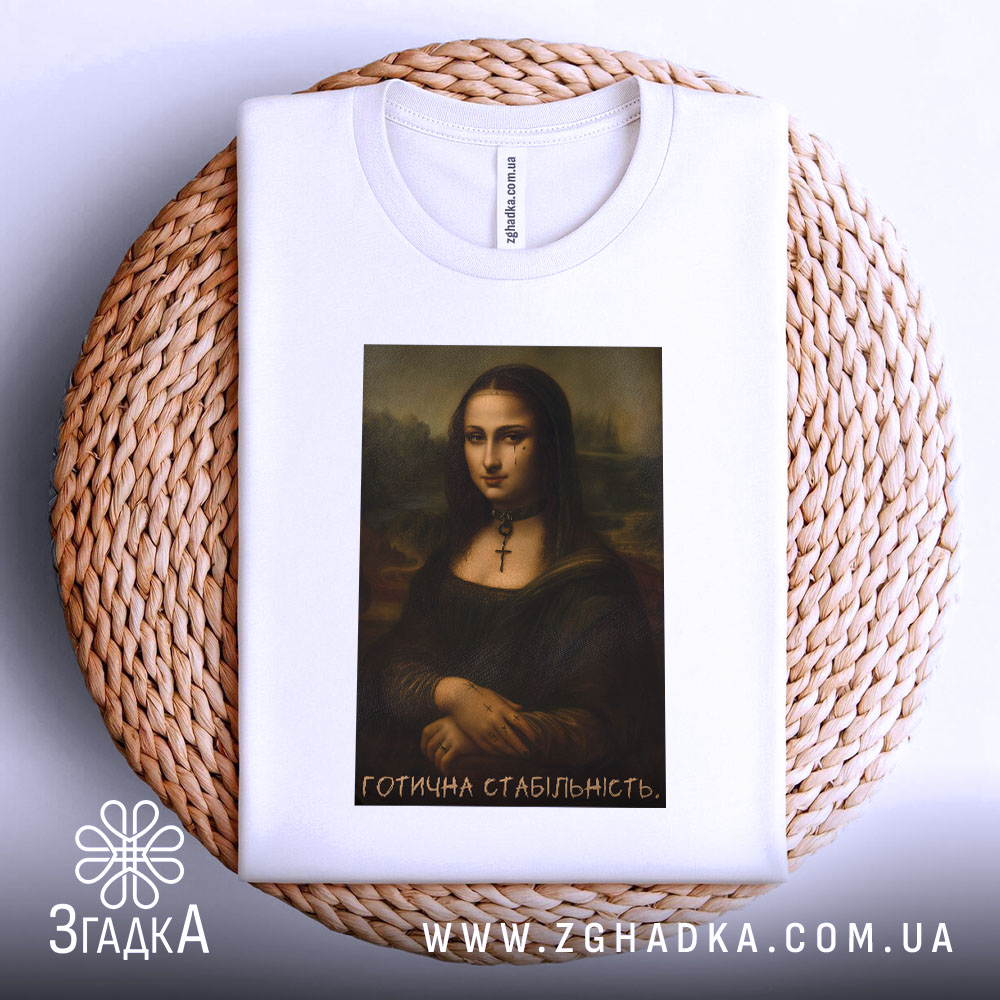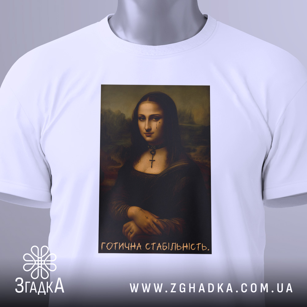Ця футболка виготовлена з високоякісних матеріалів, що забезпечують комфорт та стиль. Принт з Моною Лізою символізує креативність і любов до мистецтва, що робить її ідеальним вибором для творчих особистостей.