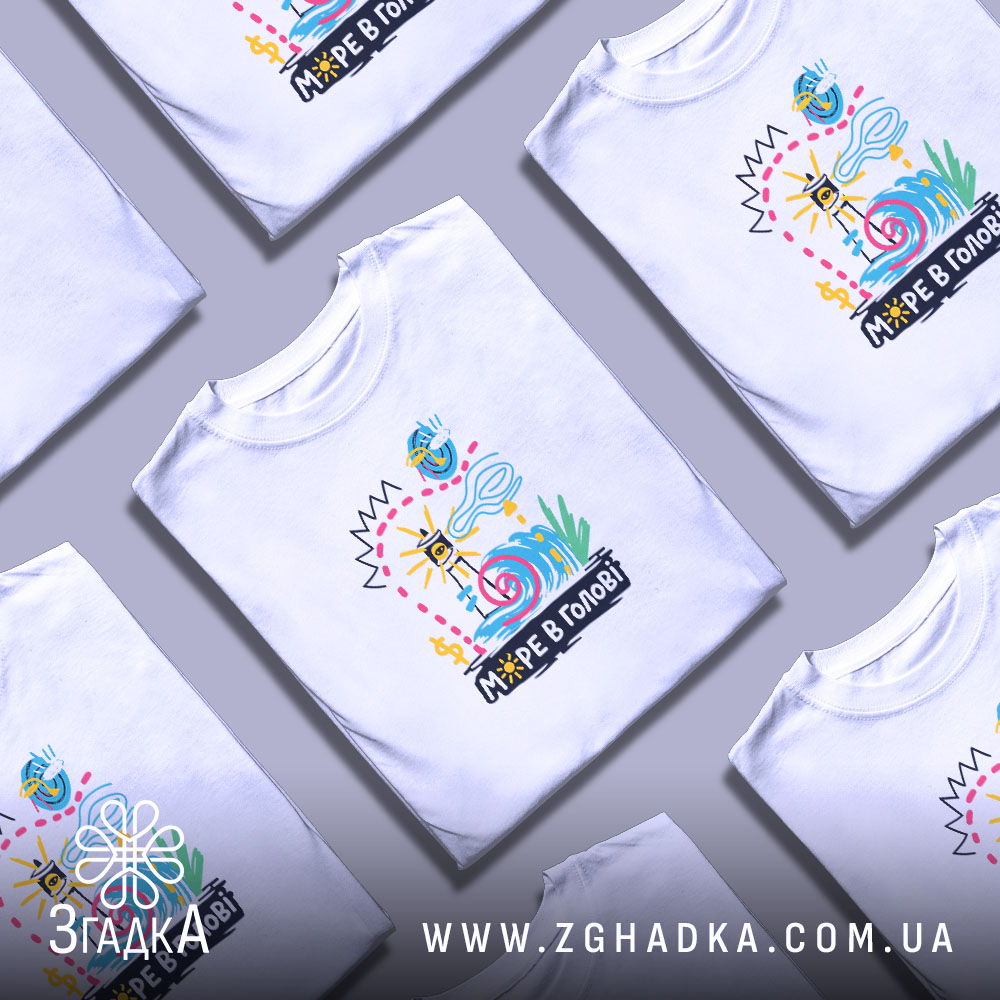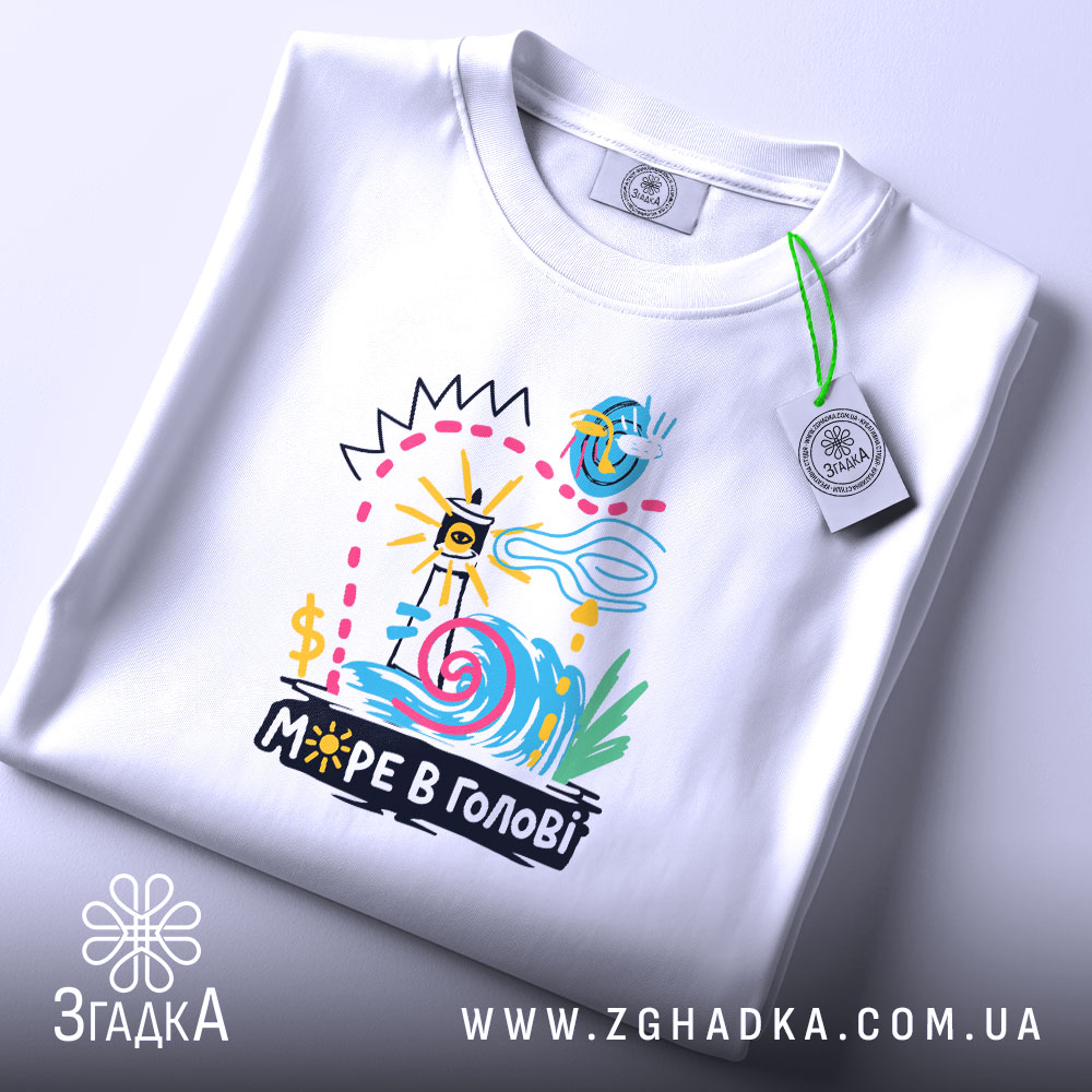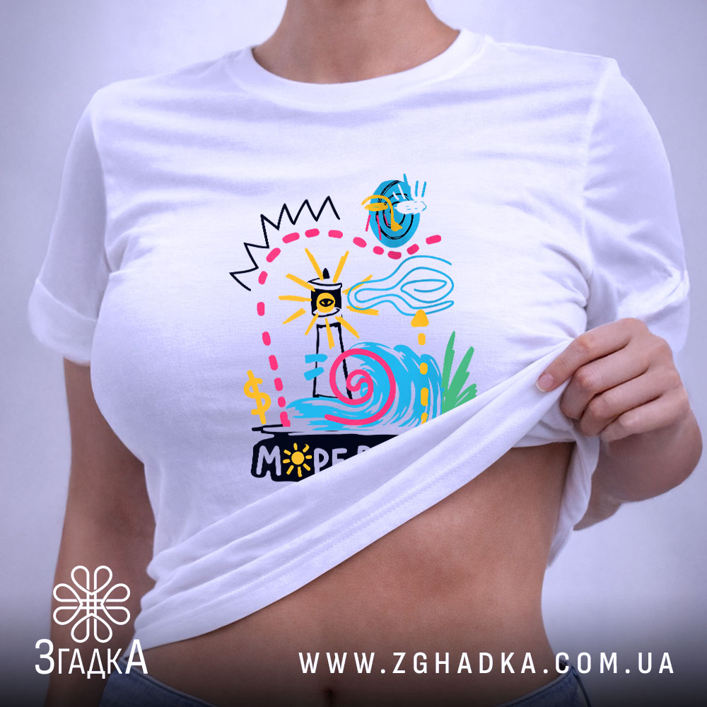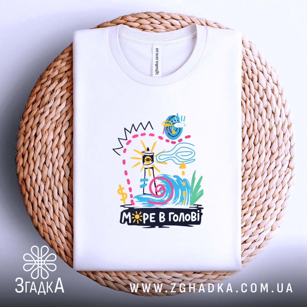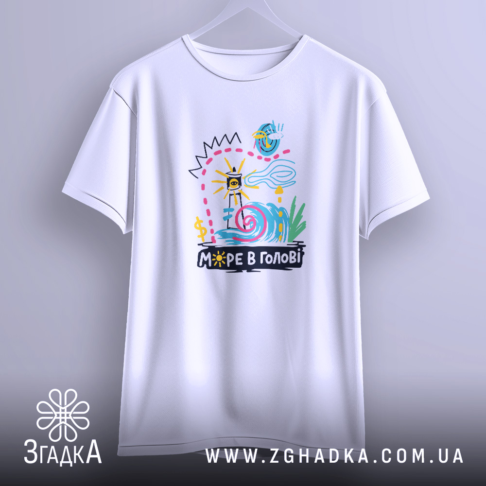Яскрава футболка з принтом ‘МОРЕ В ГОЛОВІ’ для стильних людей. Комфортний матеріал та різноманітність кольорів.