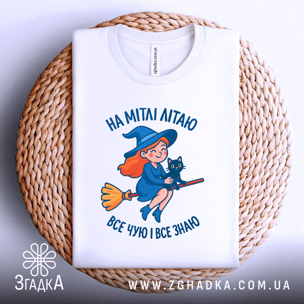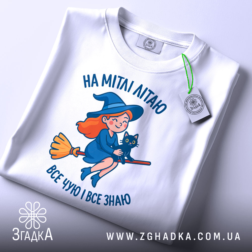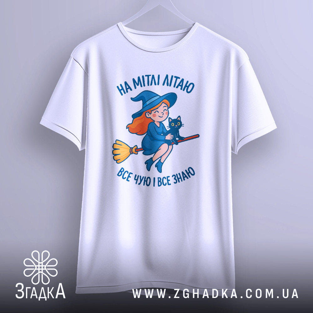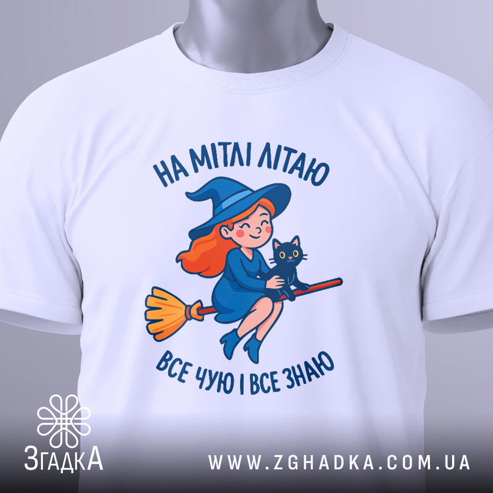 Футболка на мітлі літаю — це не просто одяг, а символ вашої індивідуальності. Принт, що зображує мітлу в польоті, викликає асоціації з пригодами та фантазією, що робить її ідеальним вибором для творчих особистостей.
