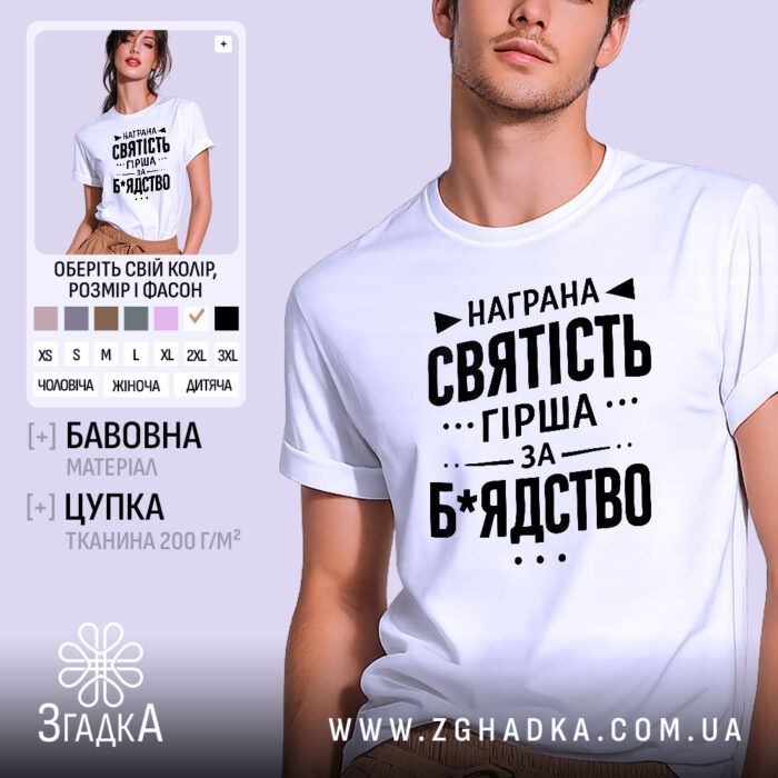 Футболка награна святість – це не просто одяг, а вираження вашої індивідуальності та стилю. Виберіть свою футболку і насолоджуйтеся комфортом та якістю.