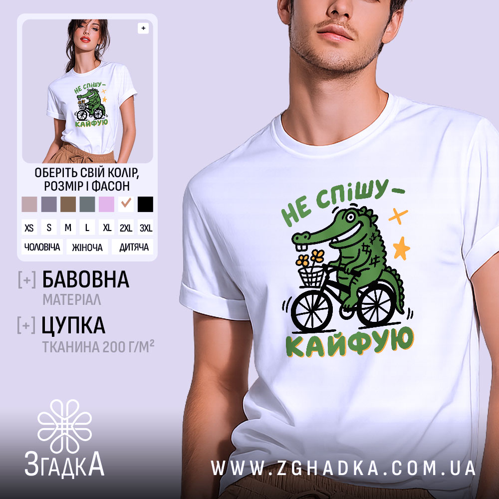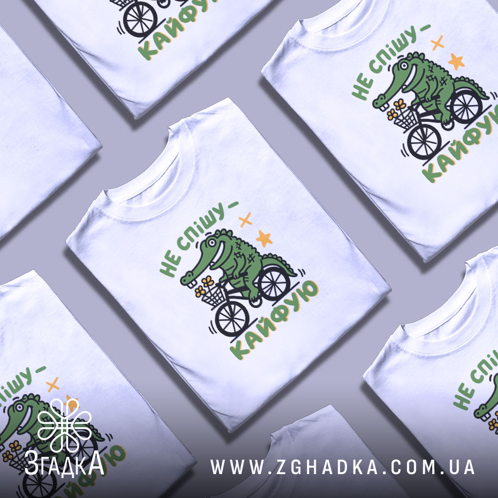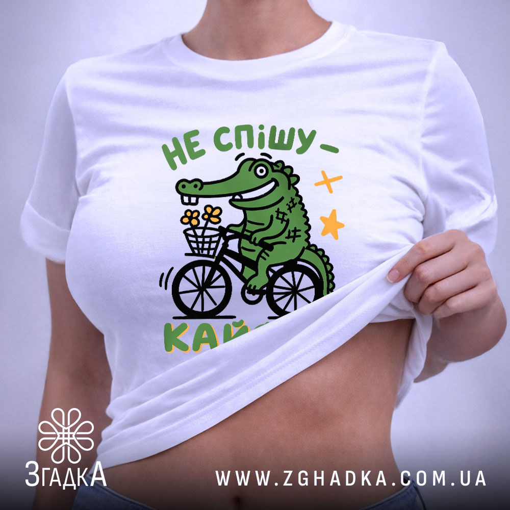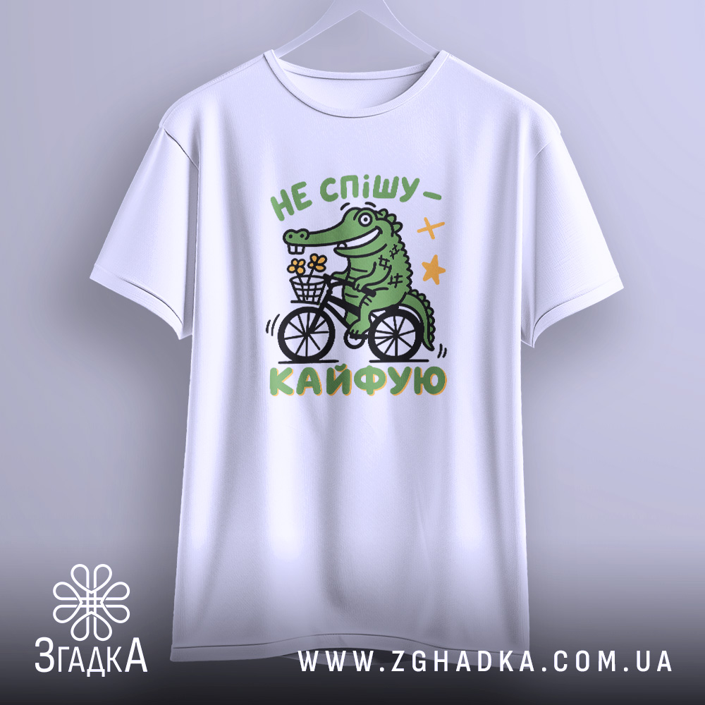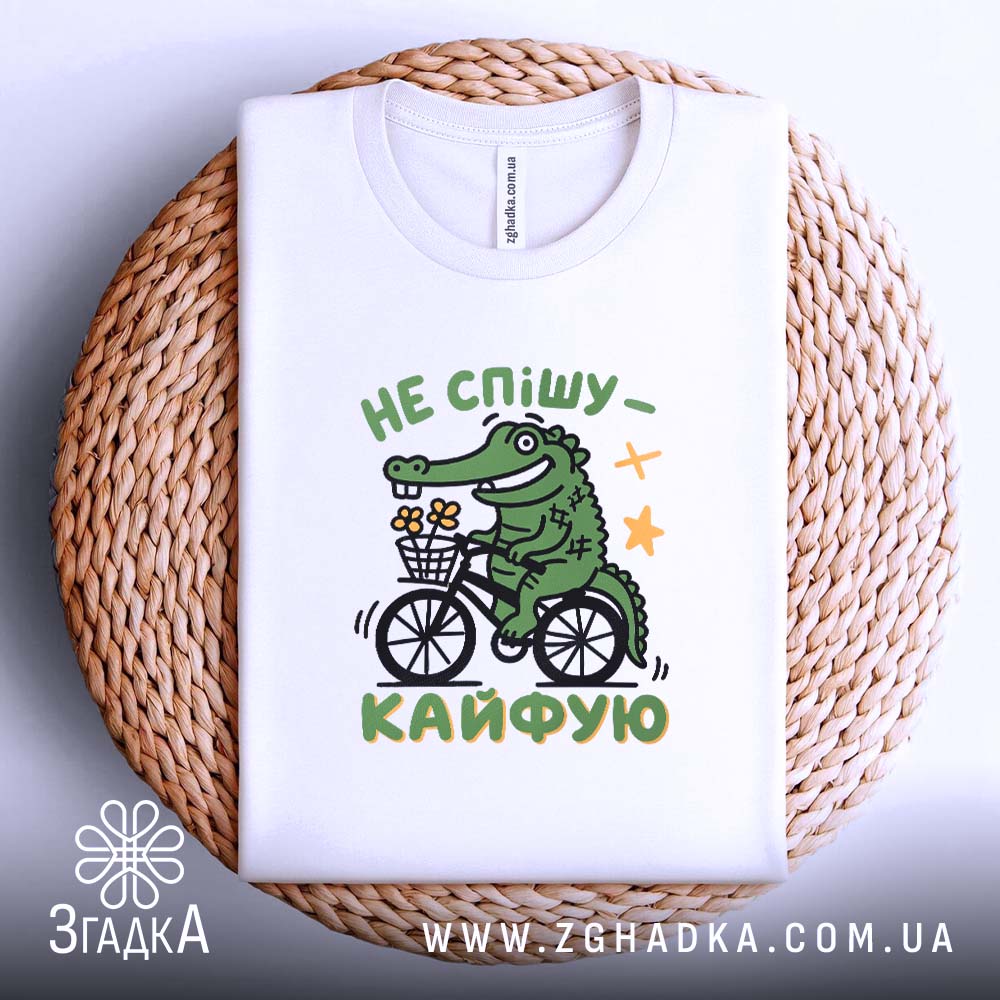 Яскравий принт зображує веселого крокодила на велосипеді, що тримає кошик з квітами. Текст ‘НЕ СПІШУ – КАЙФУЮ’ виконано у динамічному стилі, підкреслюючи легкість та позитив. Композиція доповнена зірочками, що надає дизайну грайливості.