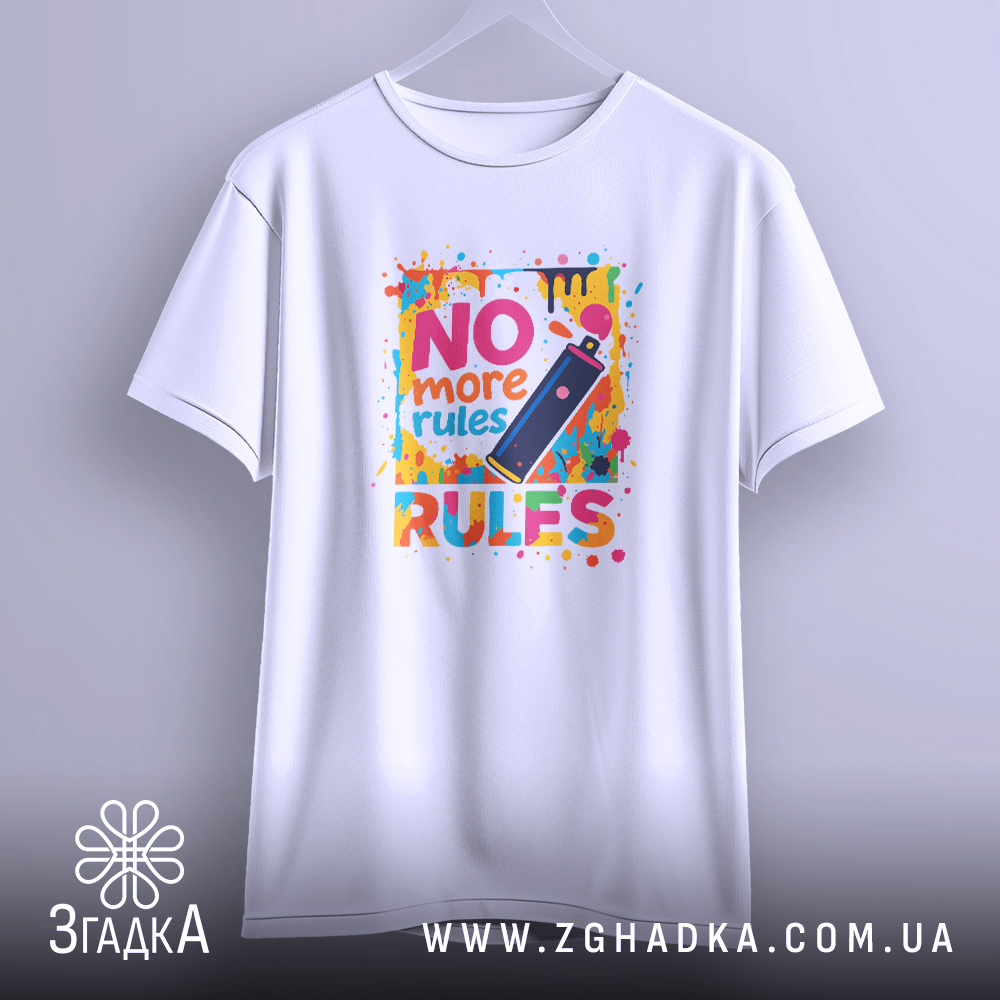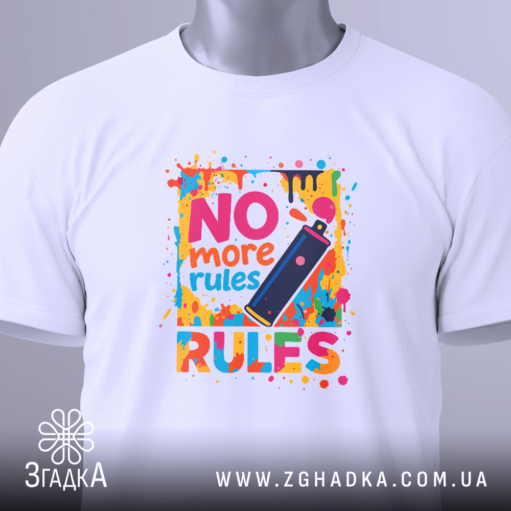 На принті футболки No more rules зображено заклик до свободи та індивідуальності. Цей стильний дизайн надихає на самовираження та підкреслює вашу унікальність. Не пропустіть можливість виділитися!
