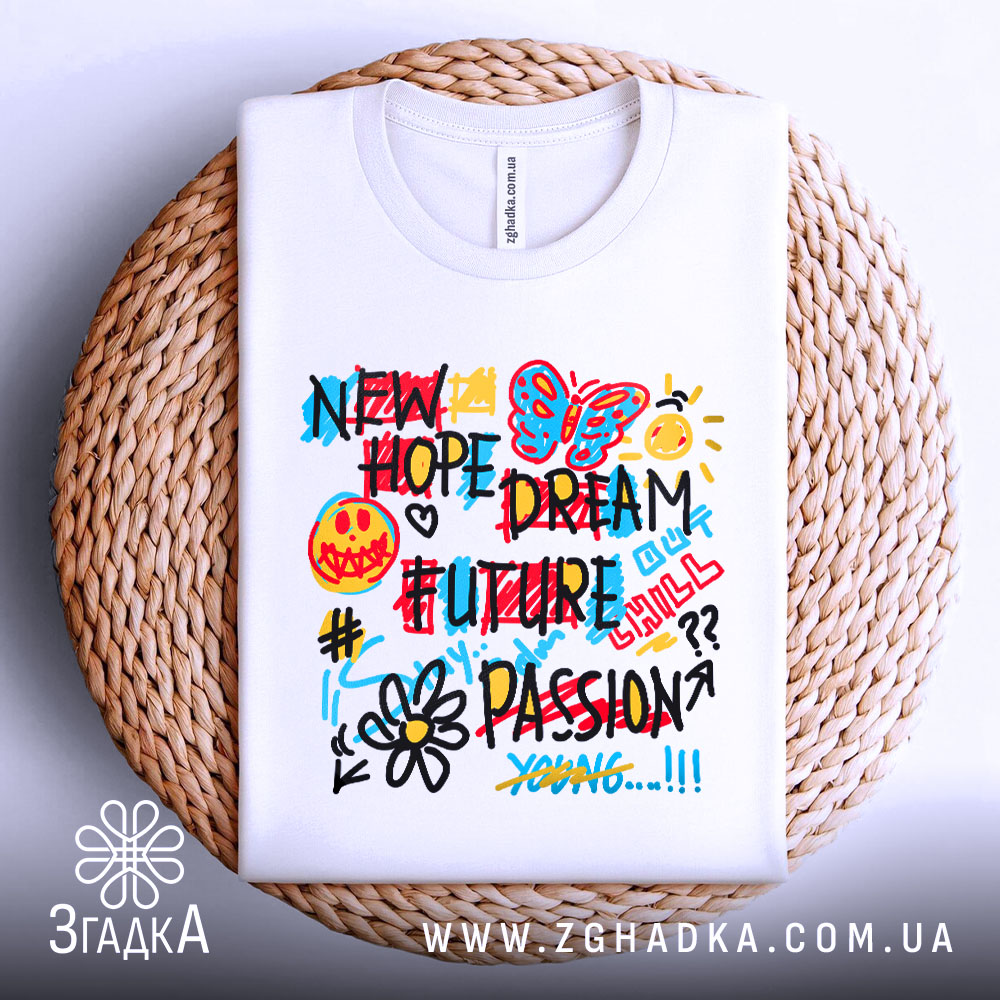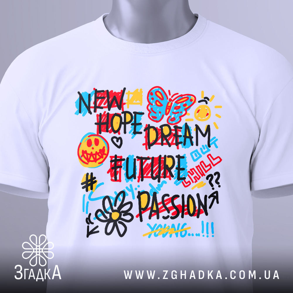 Футболка нові мрії графіті – це не просто одяг, а вираження вашого внутрішнього світу. Принт на футболці передає емоції та настрій, надихає на нові досягнення та мрії.