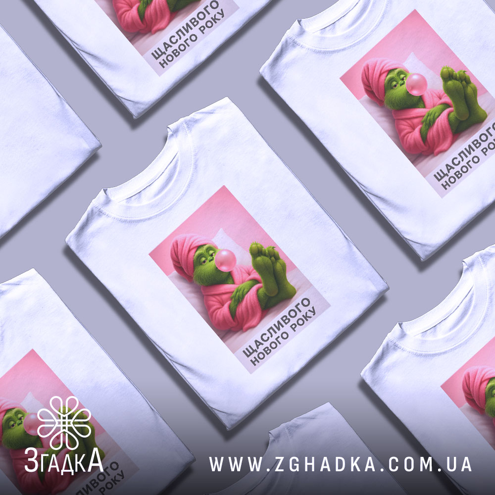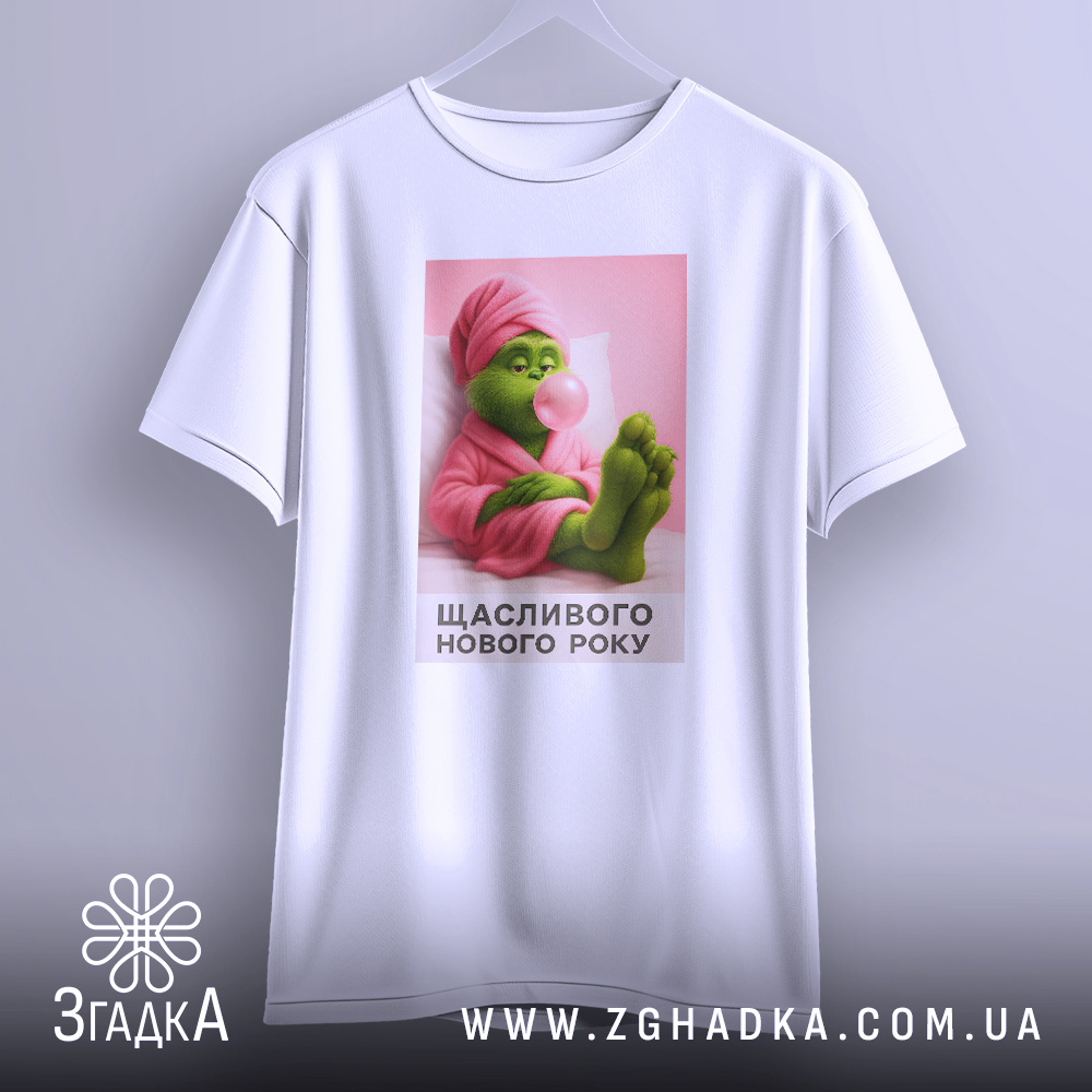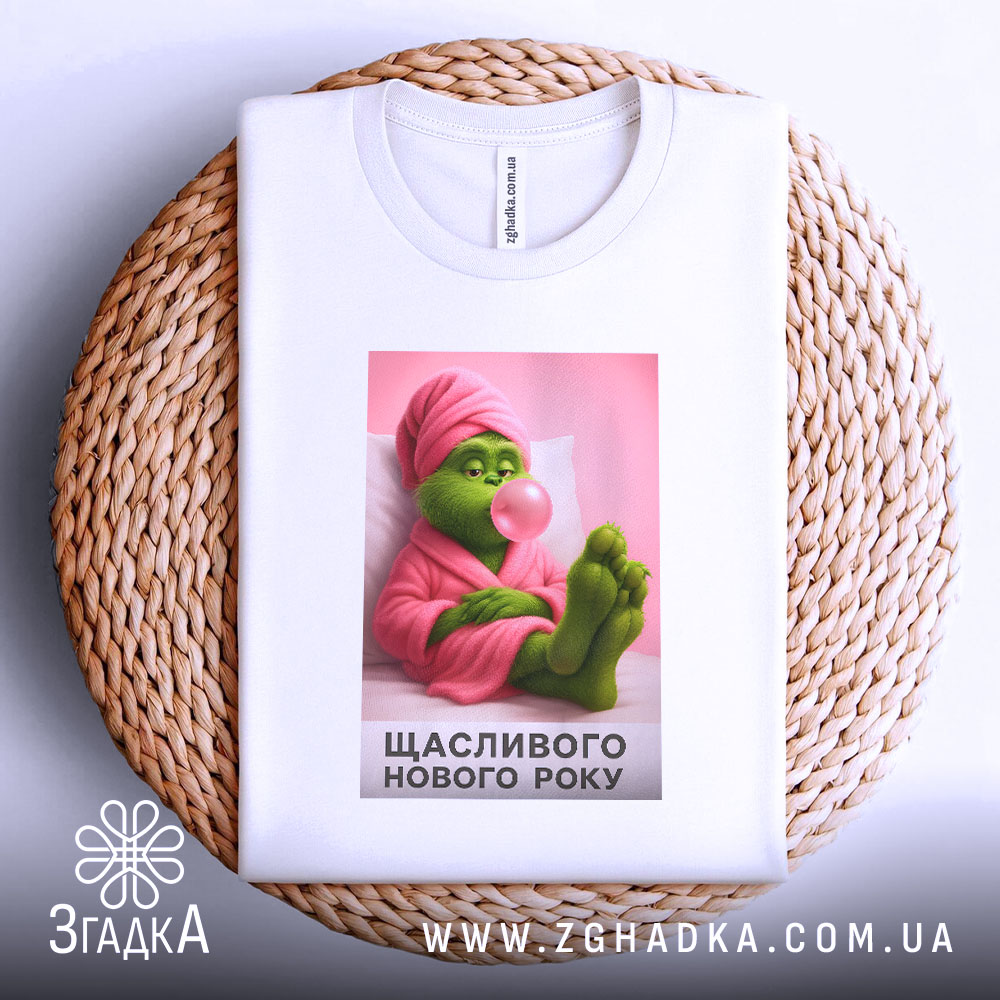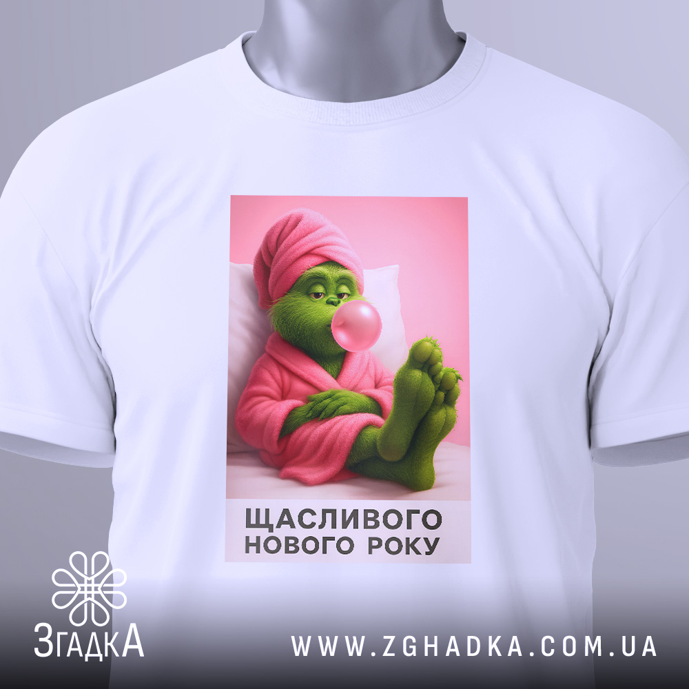 Ця футболка виготовлена з якісних матеріалів і має стильний дизайн. Принт з грінчем символізує веселощі та святковий настрій, що робить її ідеальним вибором для новорічних свят.