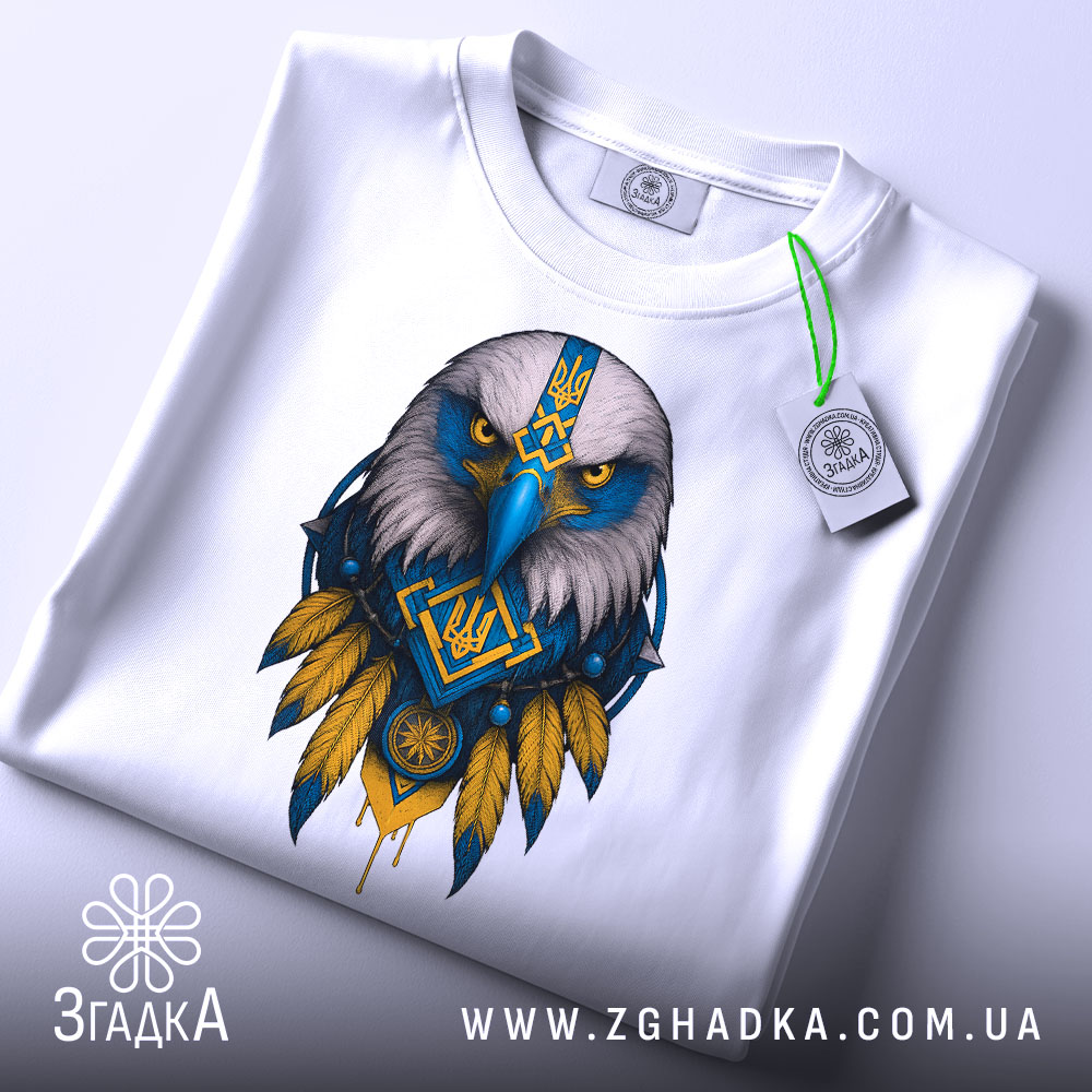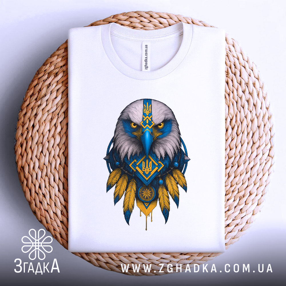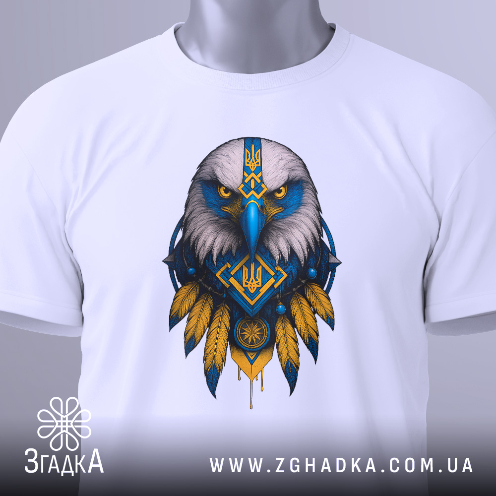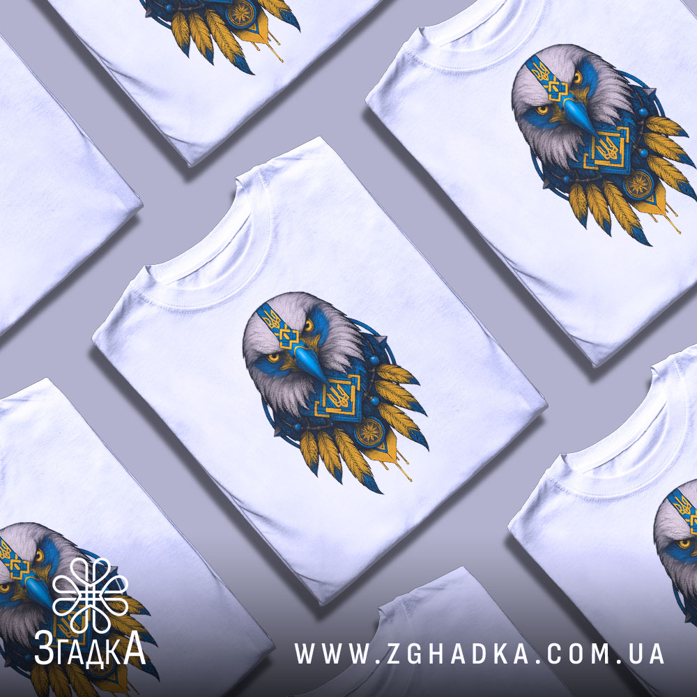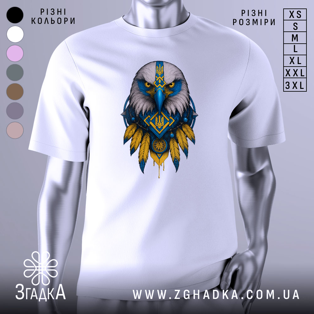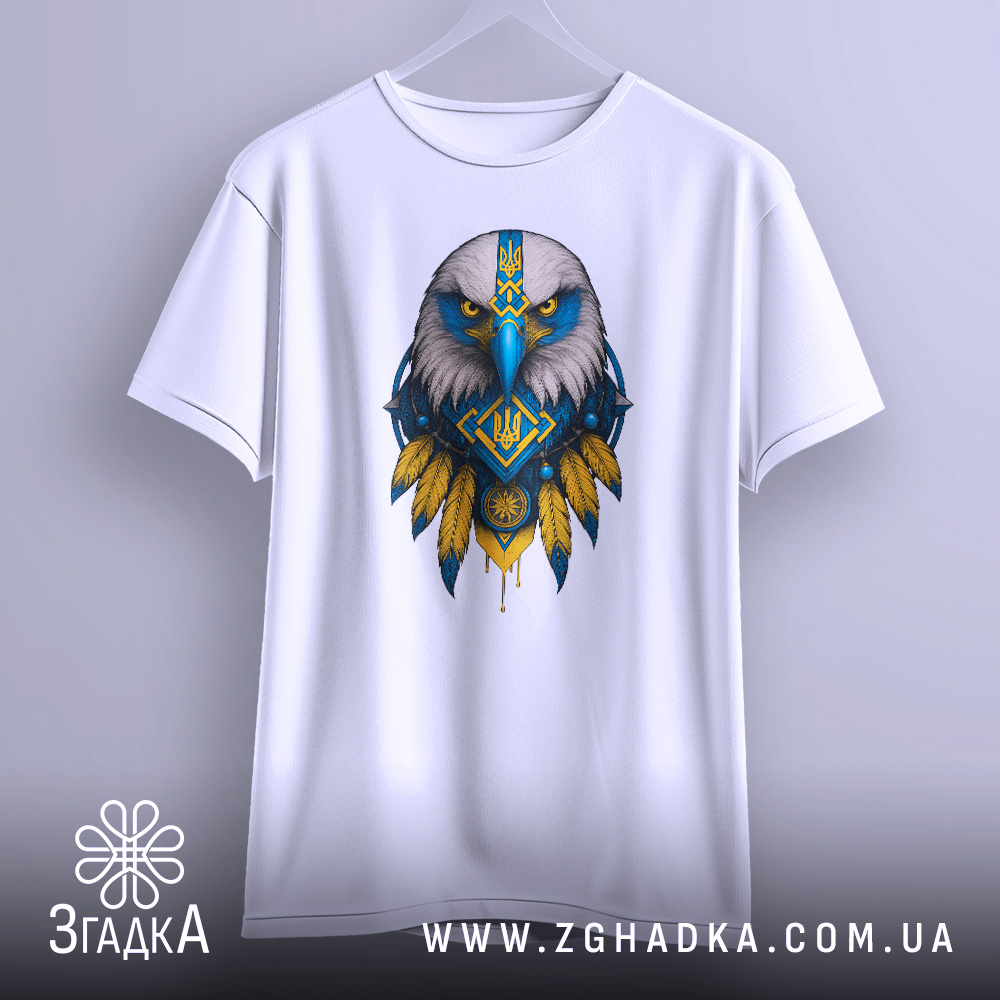 На принті зображений величний орел, що символізує силу та незалежність України. Ця футболка стане відмінним доповненням до вашого гардеробу та підкреслить вашу любов до Батьківщини. Замовте зараз!