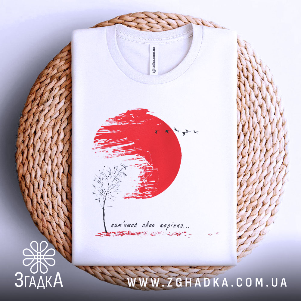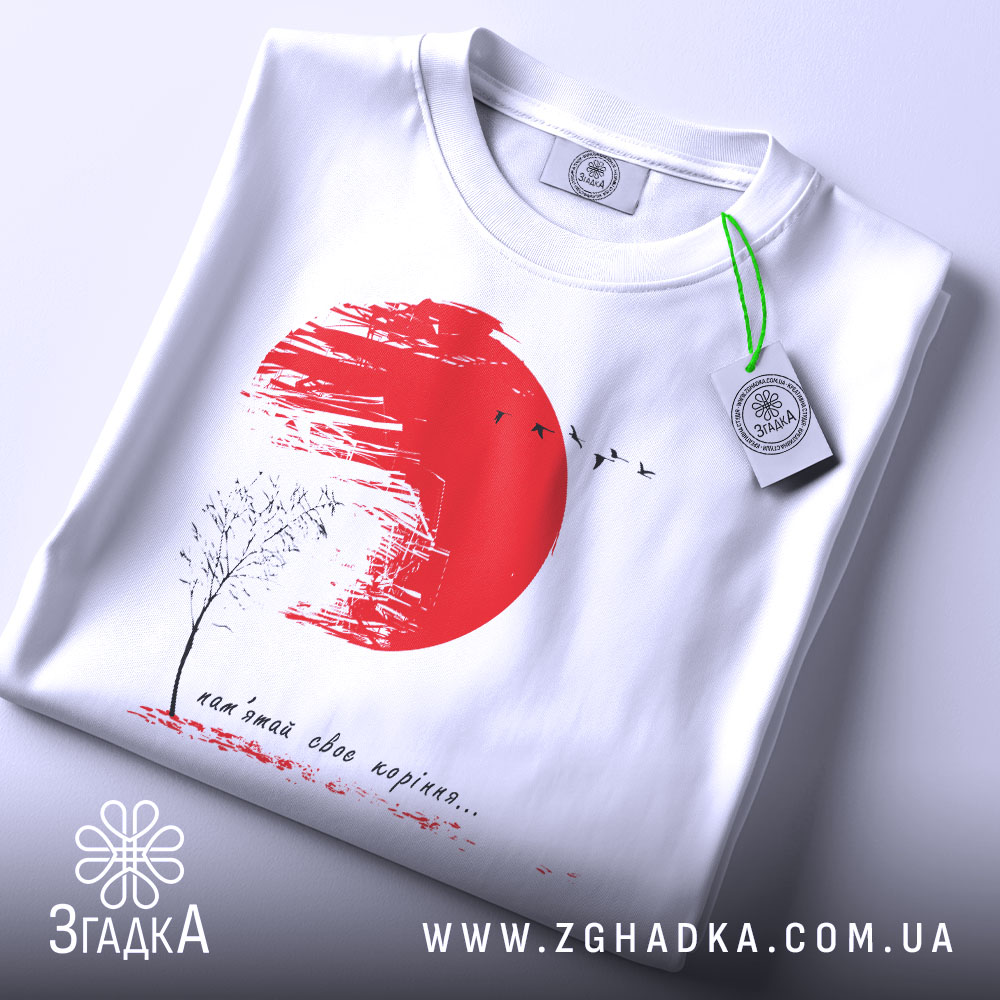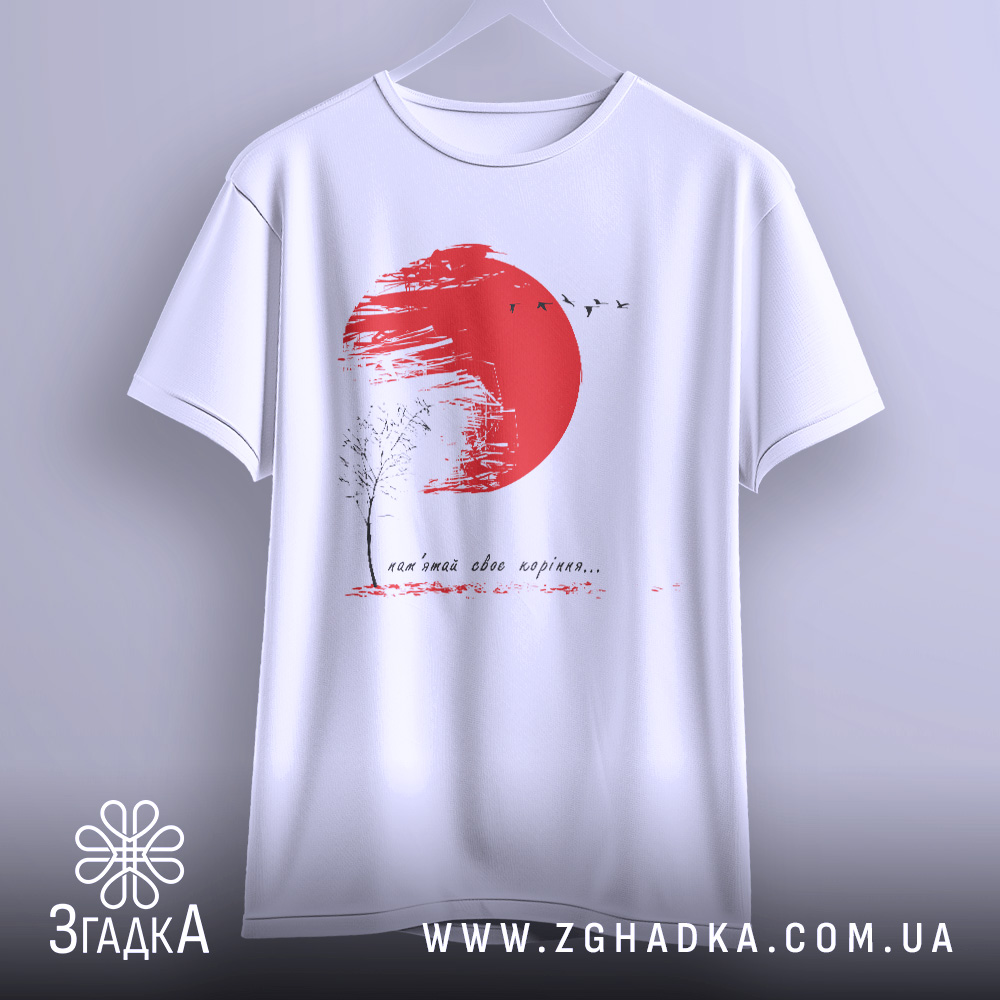 Ця футболка з унікальним принтом нагадує про важливість памʼятати своє коріння. Виготовлена з якісних матеріалів, вона стане чудовим доповненням до вашого гардеробу.