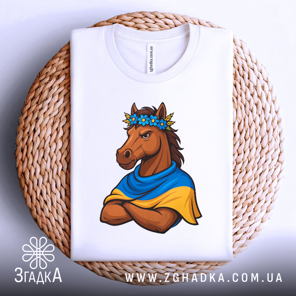 Футболка з патріотичним принтом коня. Ідеальний вибір для тих, хто цінує свободу та стиль.