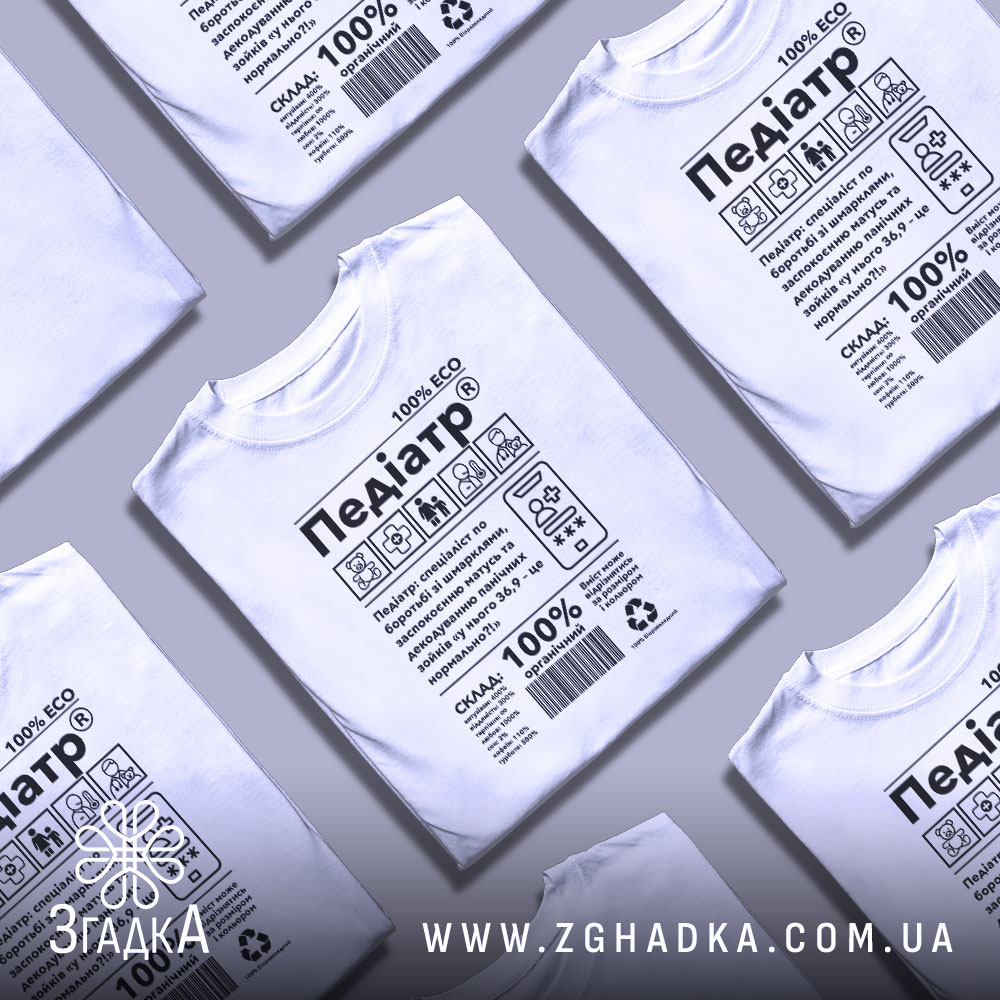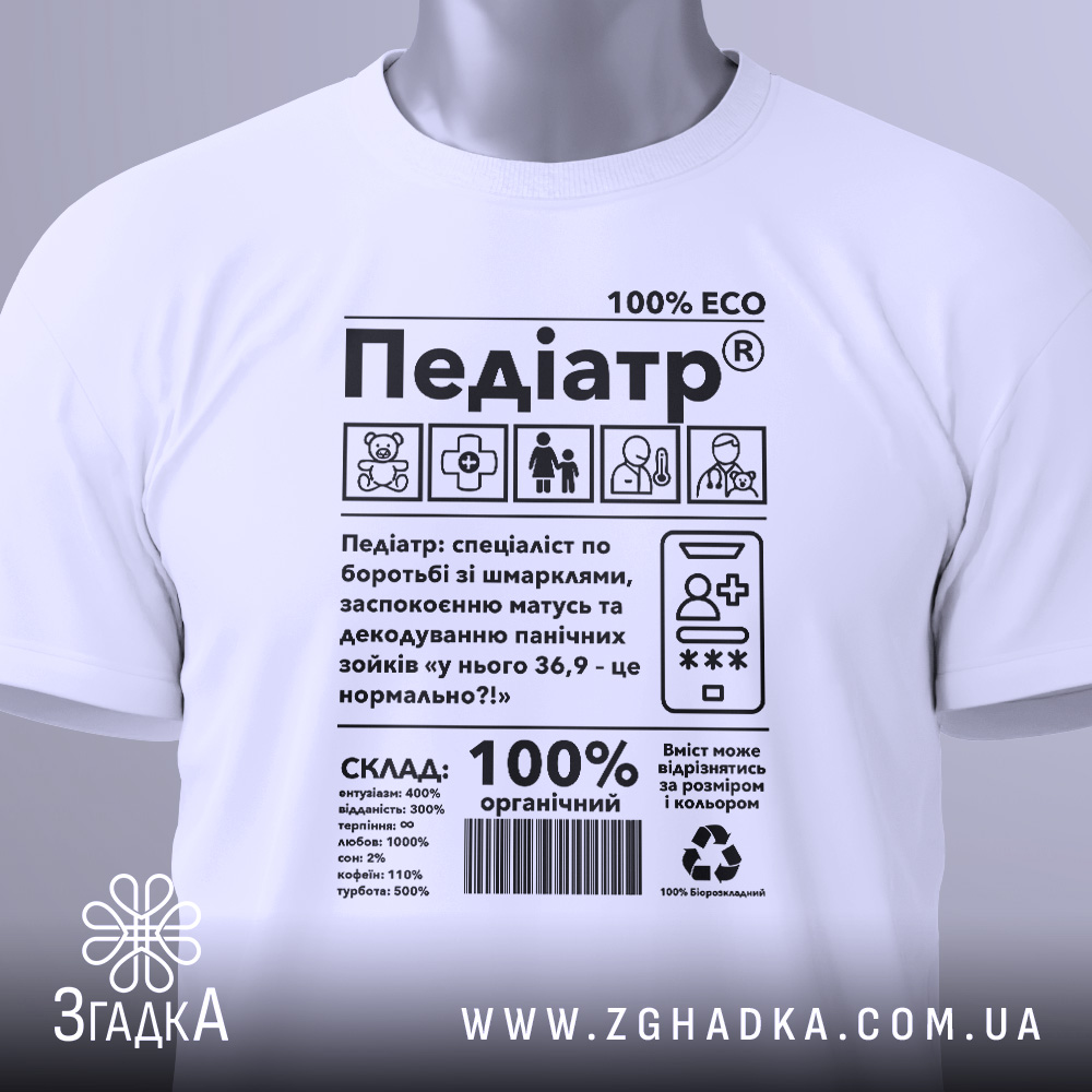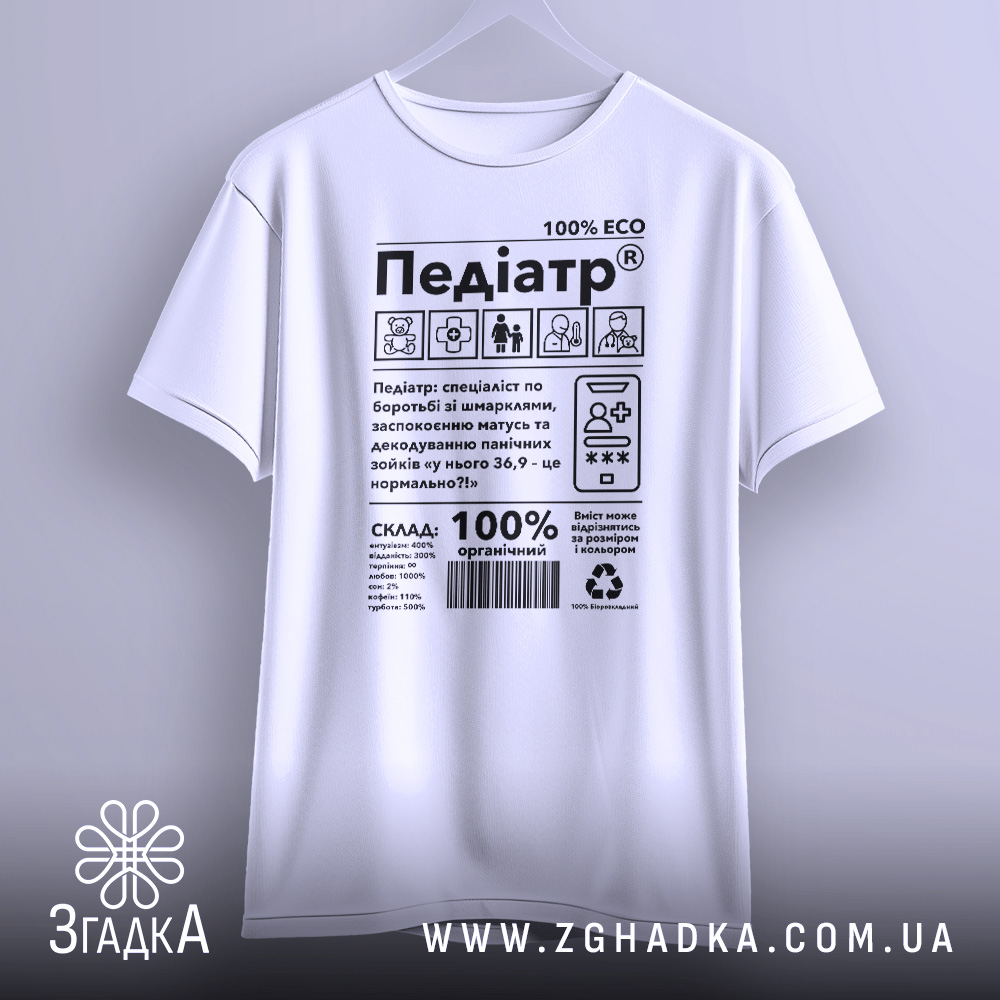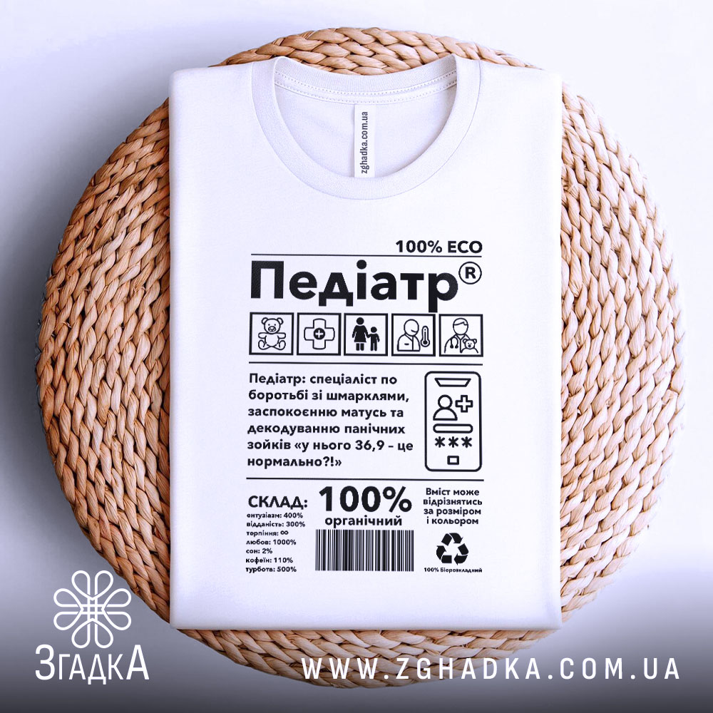 Футболка педіатр виготовлена з якісних матеріалів, що забезпечують комфорт під час носіння. Принт символізує турботу та професіоналізм, що робить цю річ ідеальною для медиків.