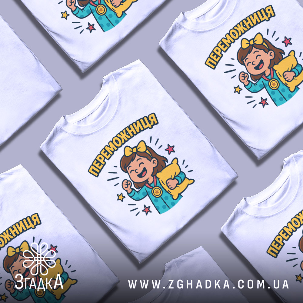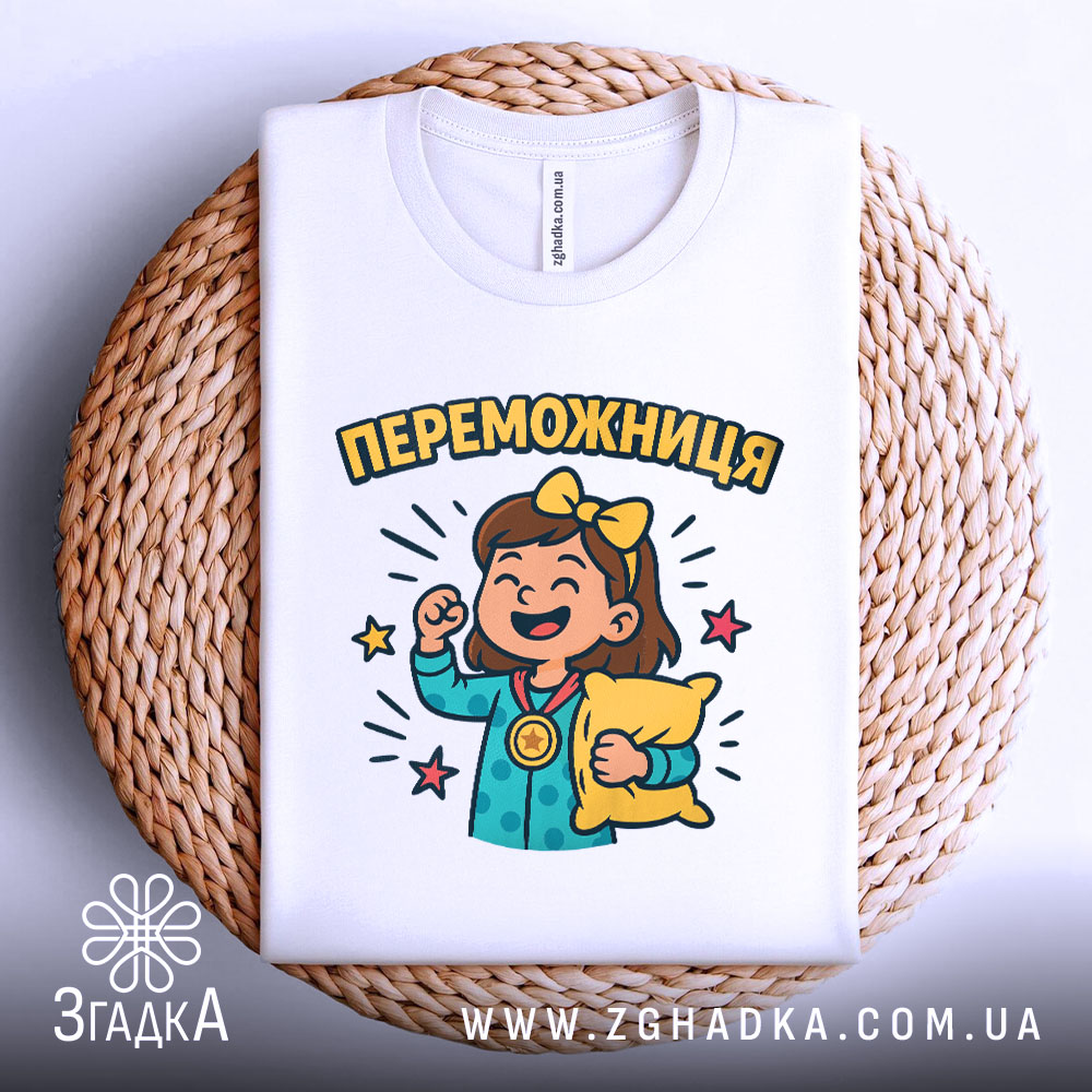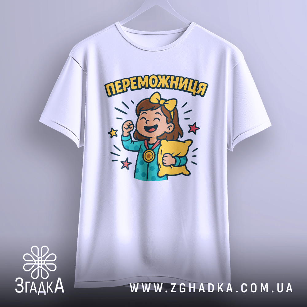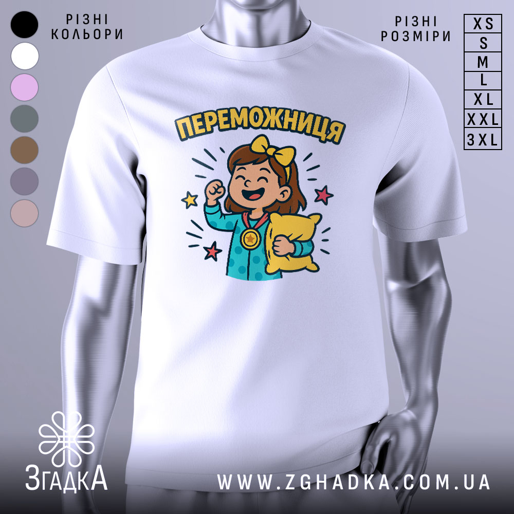 Футболка переможниця – це не просто одяг, а символ ваших досягнень. Принт на футболці відображає силу духу та прагнення до успіху, що робить її ідеальним вибором для активних людей.