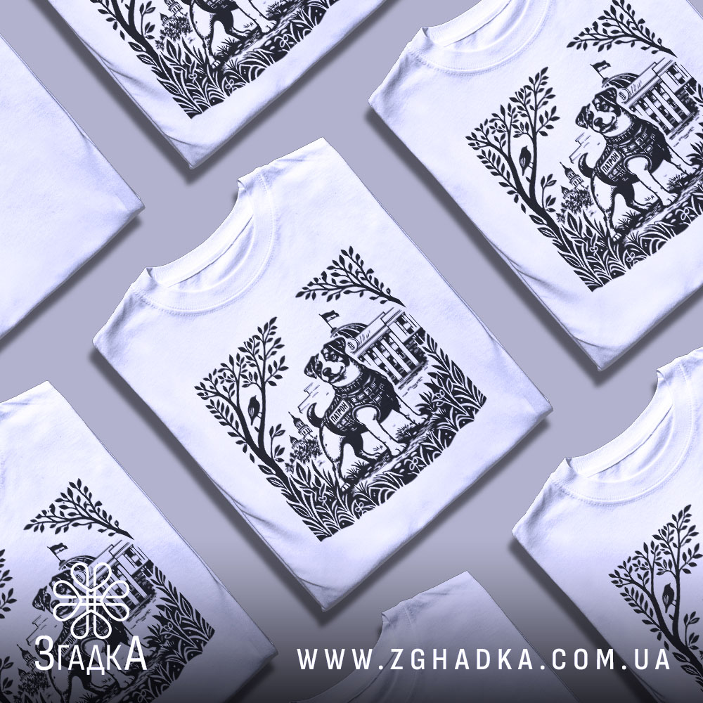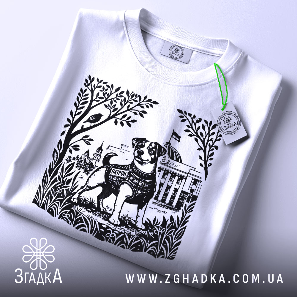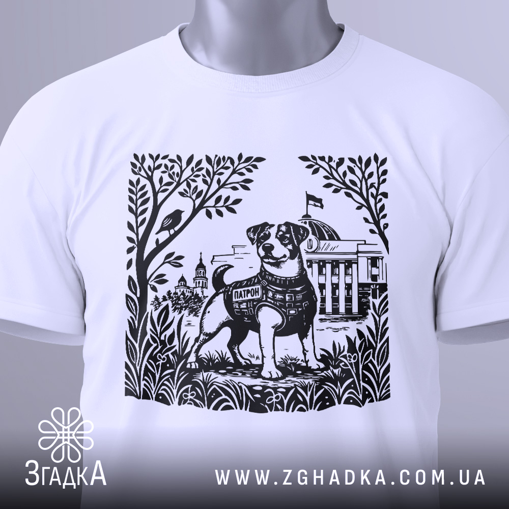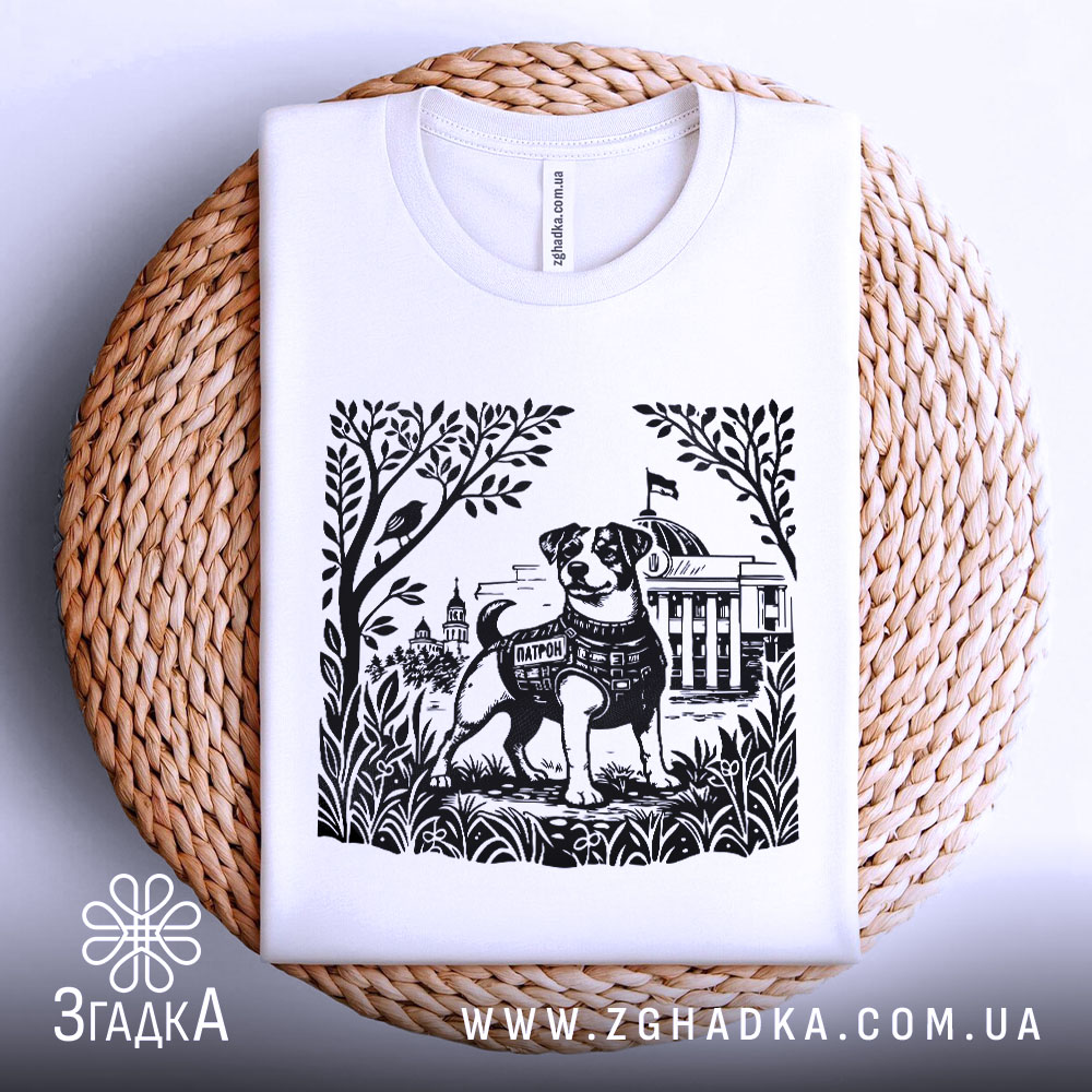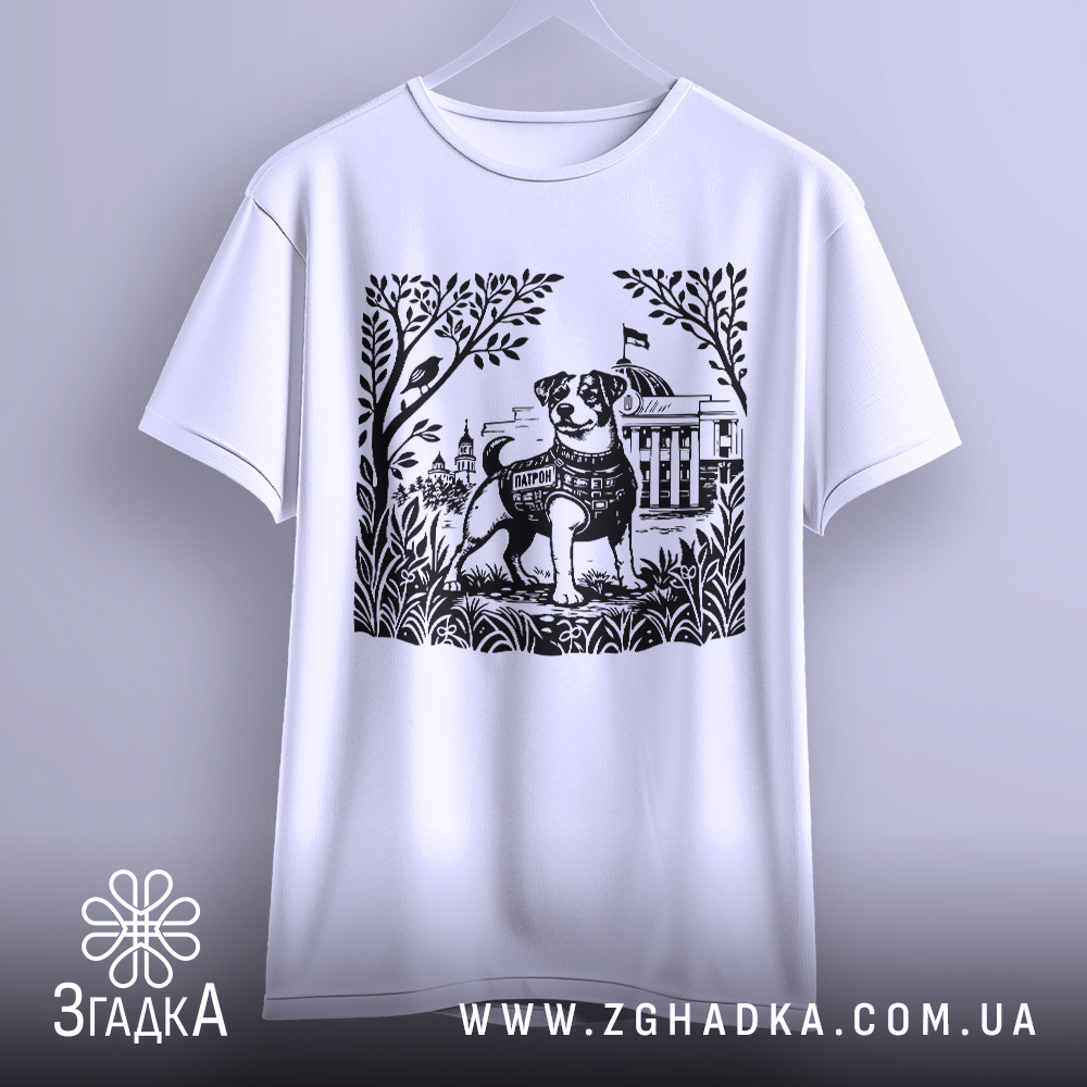 На принті зображено милого пса Патрона, який викликає позитивні емоції. Ця футболка стане чудовим доповненням до вашого гардеробу та підкреслить вашу індивідуальність. Не пропустіть можливість додати її до свого стилю!