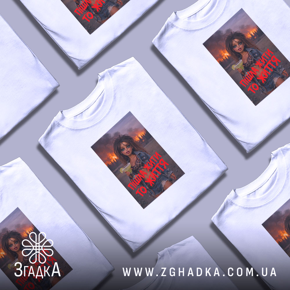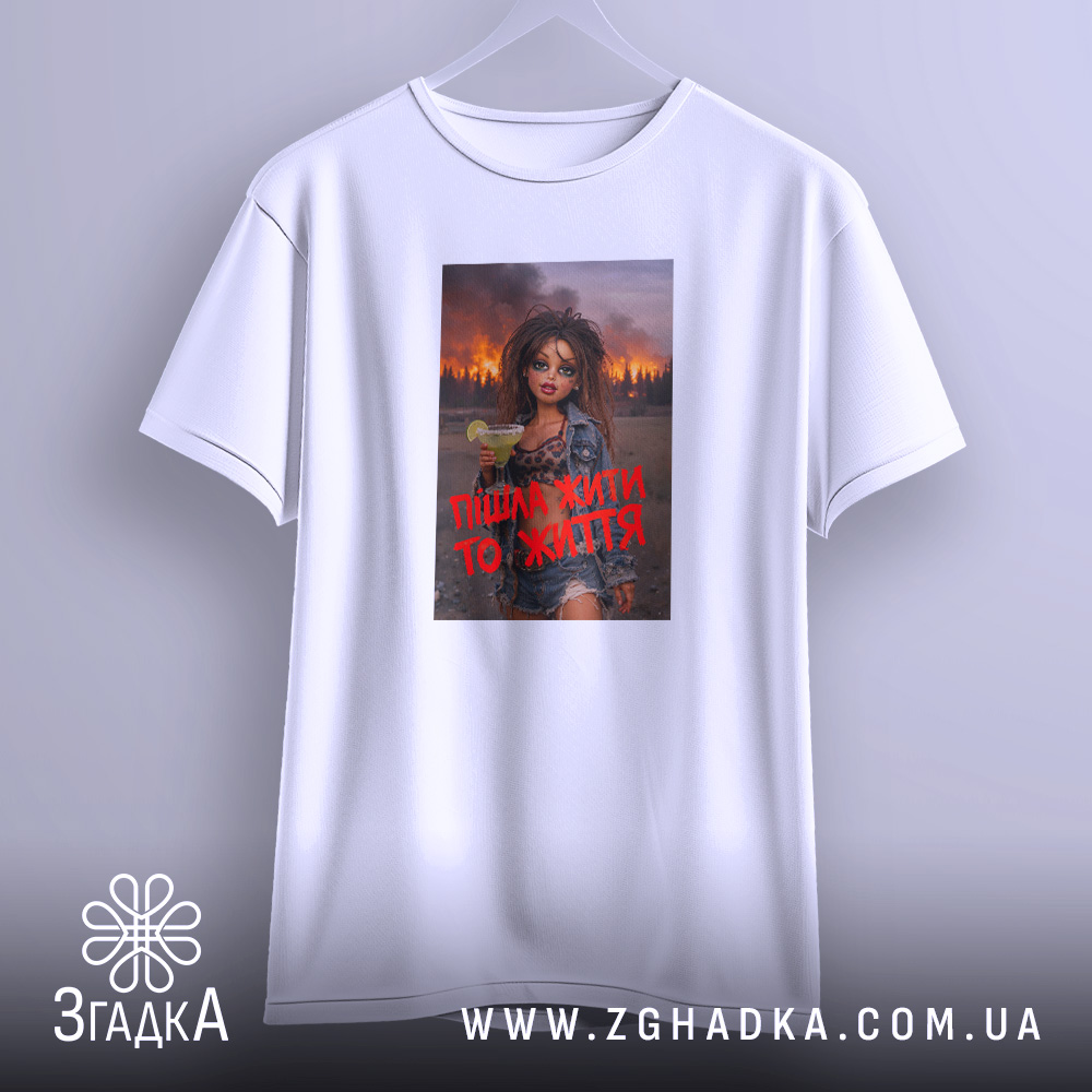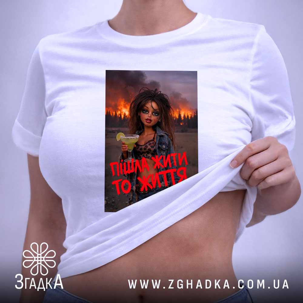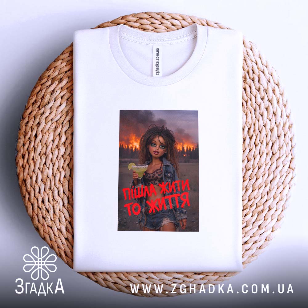 Вражаючий принт, що поєднує елементи вуличного стилю та емоційної виразності. На ньому зображена дівчина з коктейлем, яка стоїть на фоні палаючого лісу. Яскраві червоні літери з написом “Пішла жити то життя” підкреслюють її рішучість та енергію. Стиль принта — сучасний, з елементами графіті.