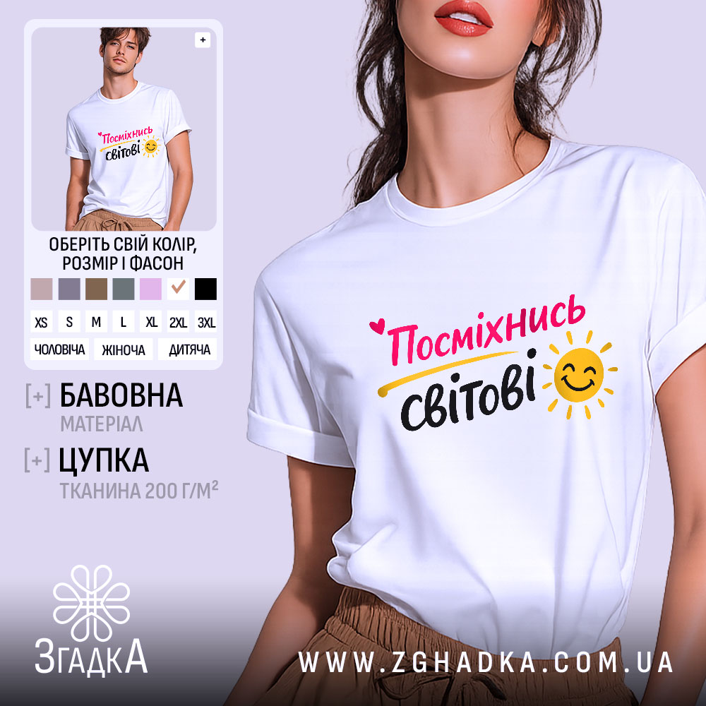 Футболка посміхнись світові – це не просто одяг, а спосіб виразити свій позитивний настрій і поділитися ним з оточуючими. Оберіть свій стиль і надихайте інших на усмішку!