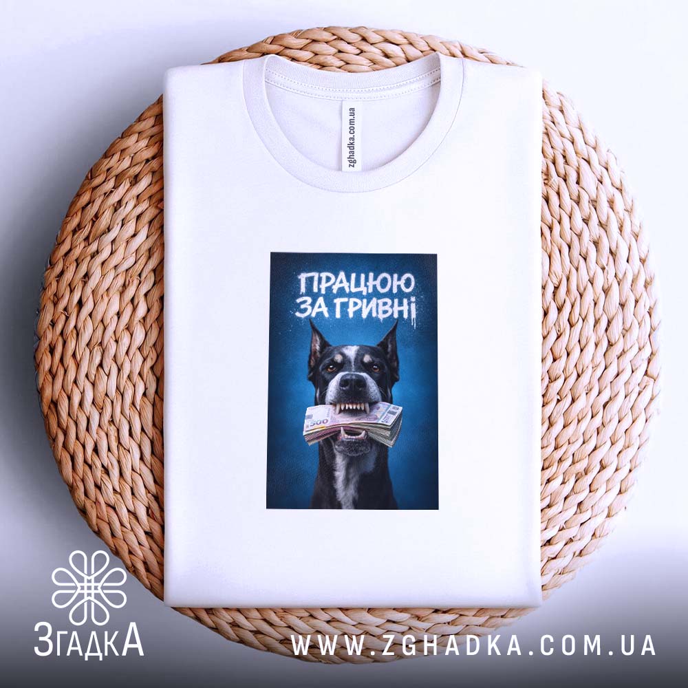 Сміливий принт з зображенням собаки, яка тримає гроші в зубах. Виглядає як заява — яскраве поєднання чорного, білого та блакитного кольорів. Напис ‘ПРАЦЮЮ ЗА ГРИВНІ’ виконаний у стилі графіті, що підкреслює енергію та креативність.