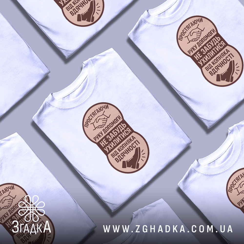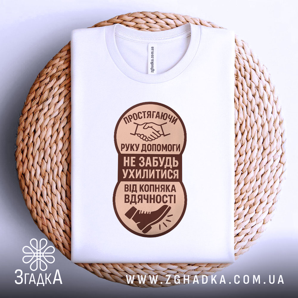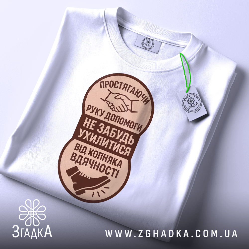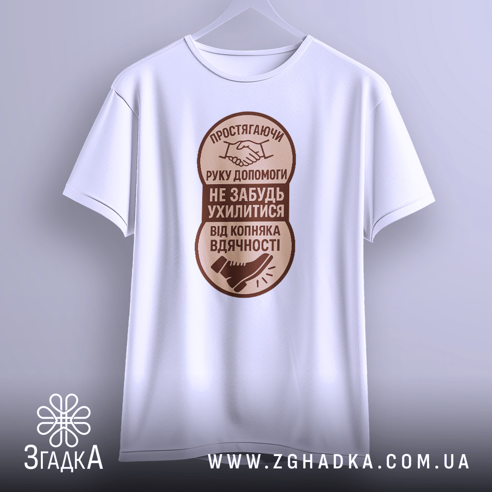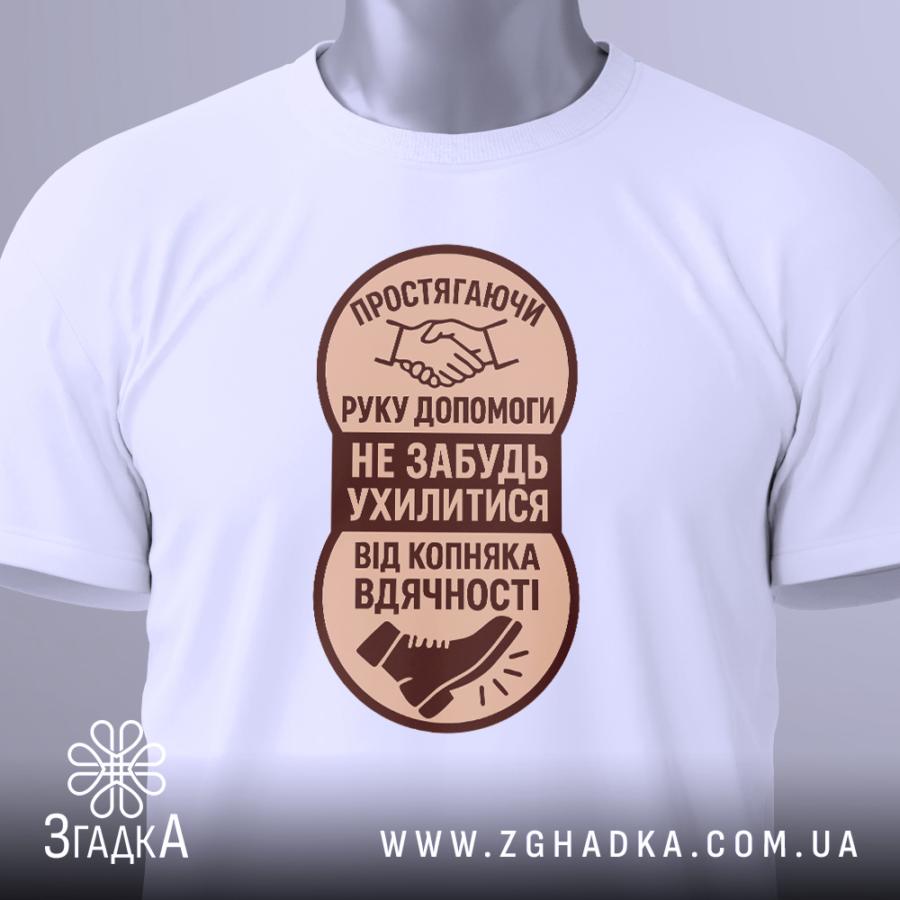 Ця футболка виготовлена з якісних матеріалів і має унікальний принт, що передає важливість взаємодопомоги. Вона стане чудовим доповненням до вашого гардеробу та підкреслить вашу позицію.