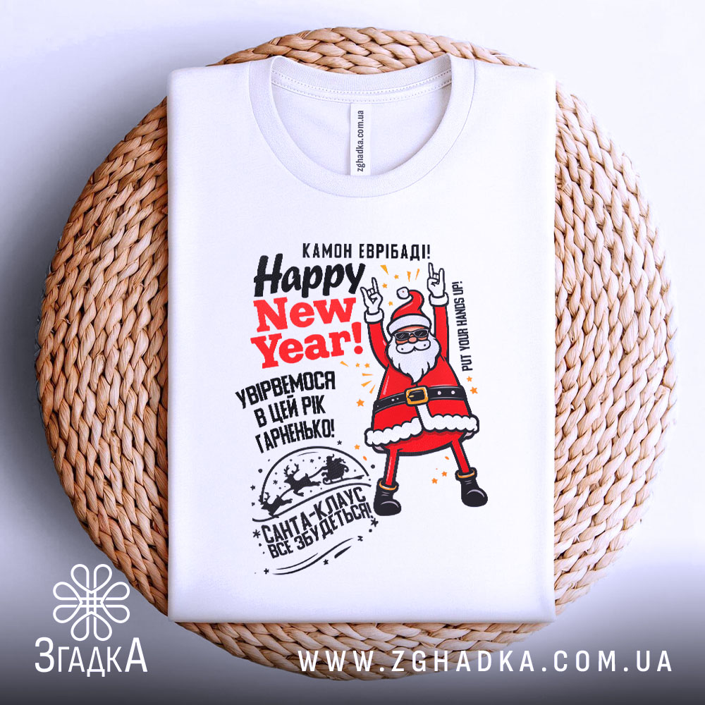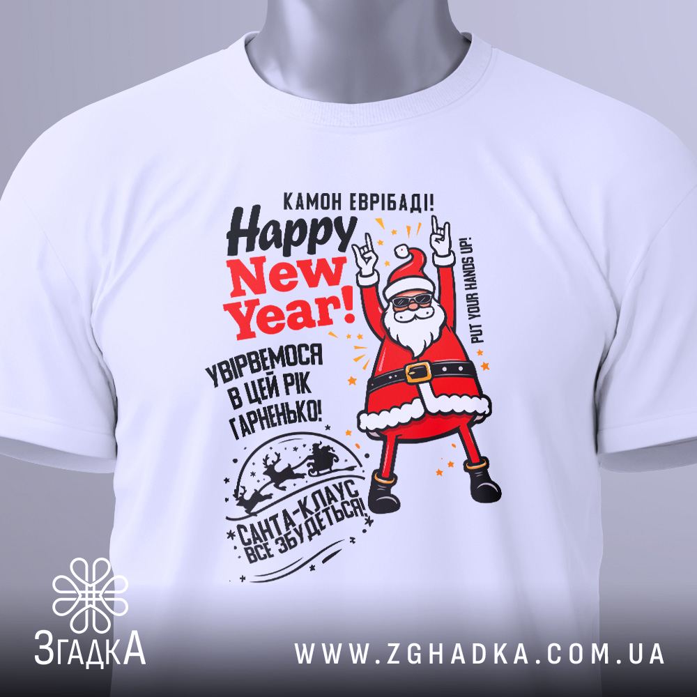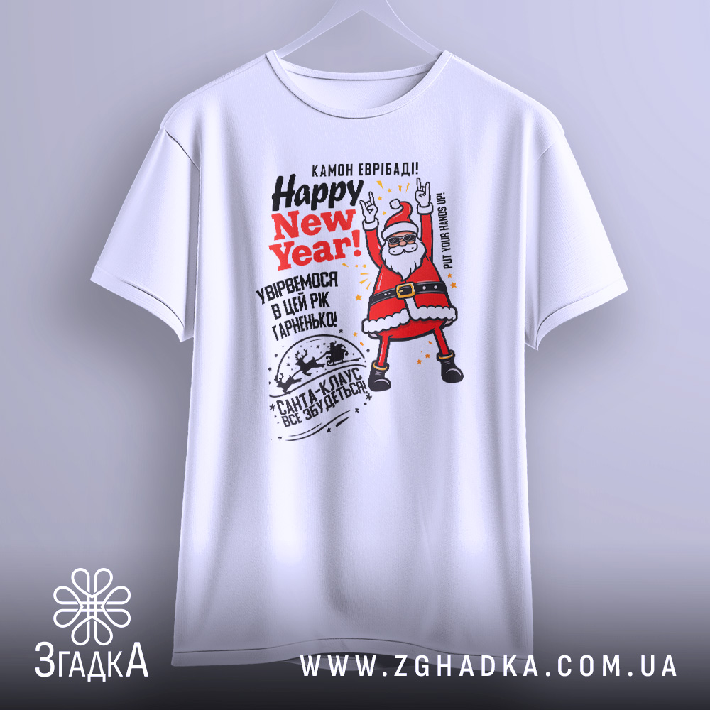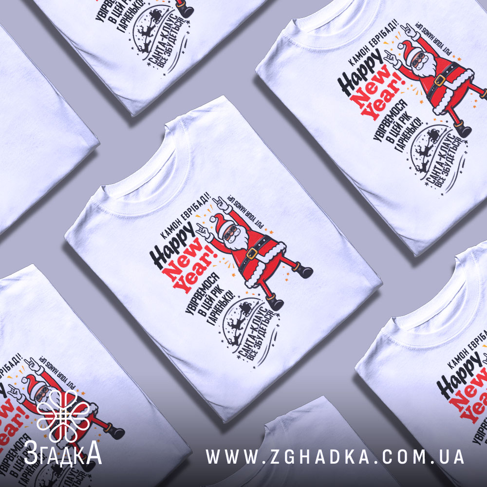 Футболка з веселим принтом Санти створена для святкового настрою. Ідеальний вибір для новорічних свят та подарунків.