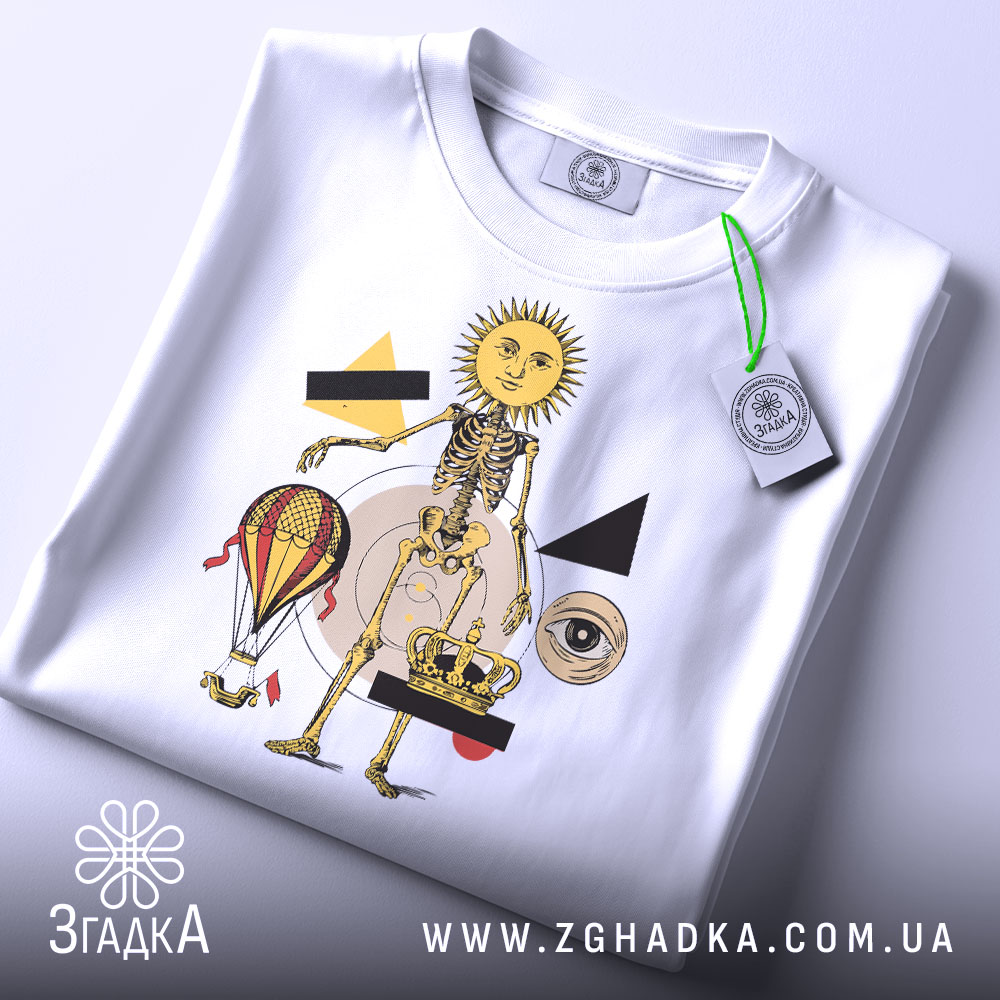 Ця футболка поєднує в собі стиль та оригінальність. Принт з сюрреалістичним скелетом символізує свободу та креативність, що робить її ідеальним вибором для тих, хто любить експериментувати з модою.
